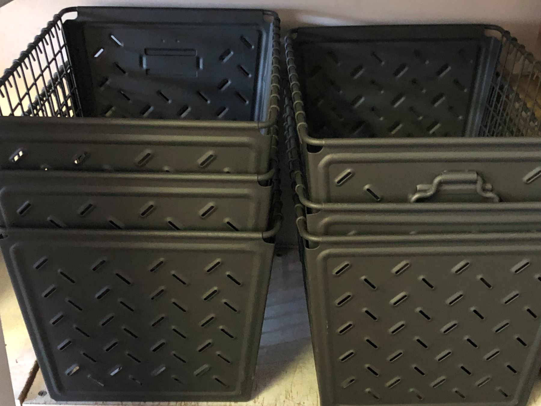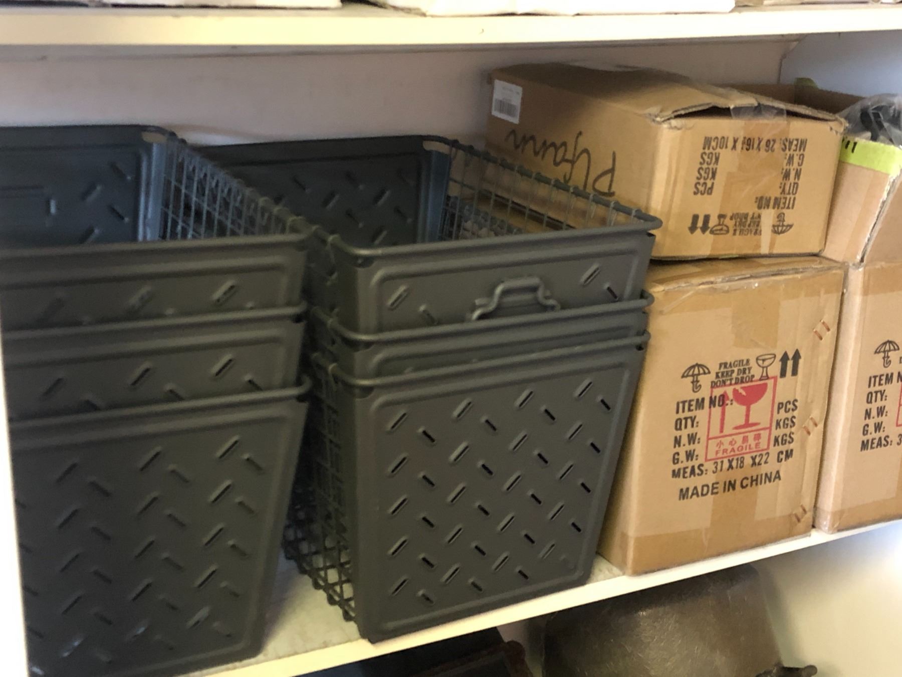 Shelf lot of small grey metal baskets & 3 "New" outdoor light fixtures (From the superhero show)