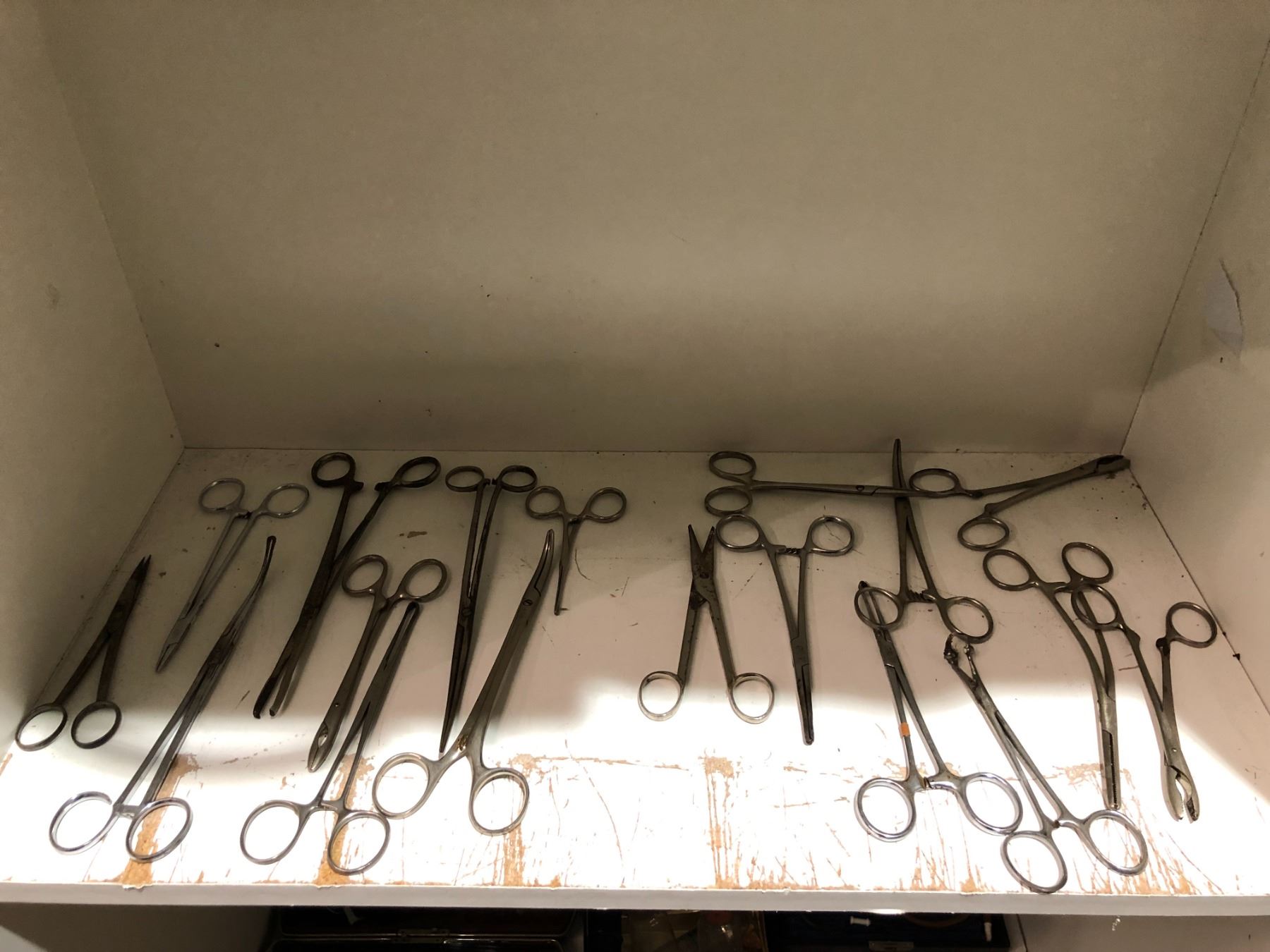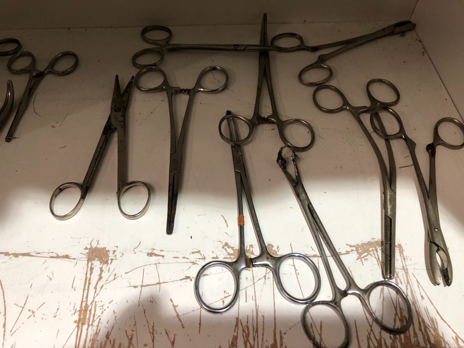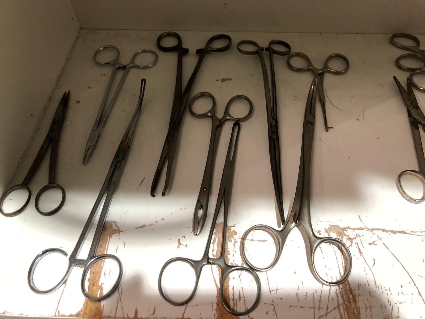 Shelf lot of vintage doctors equipment & instruments - approx. 18 vintage doctors assorted forceps & clamp instruments