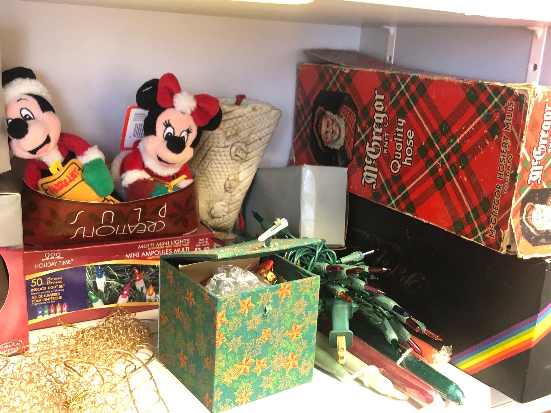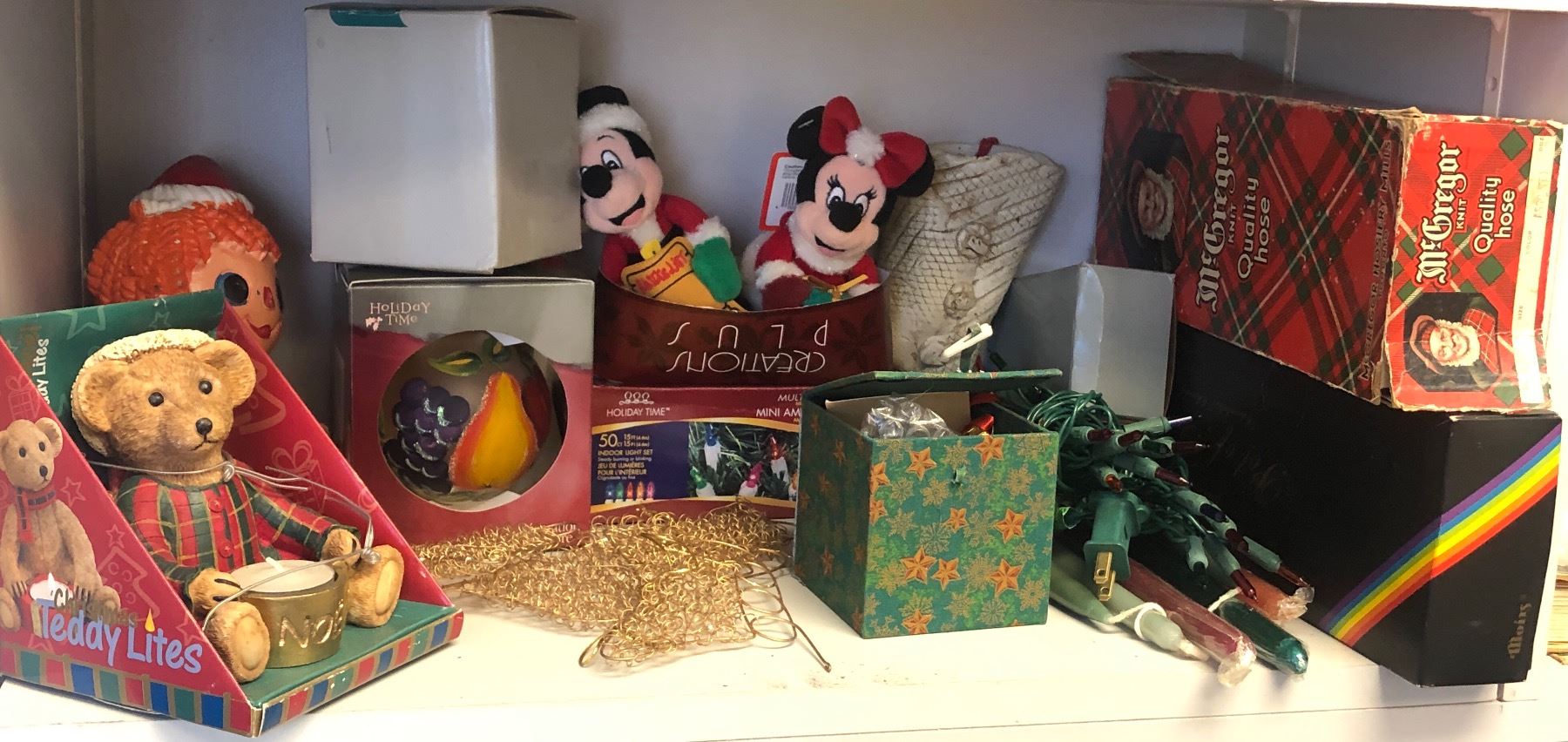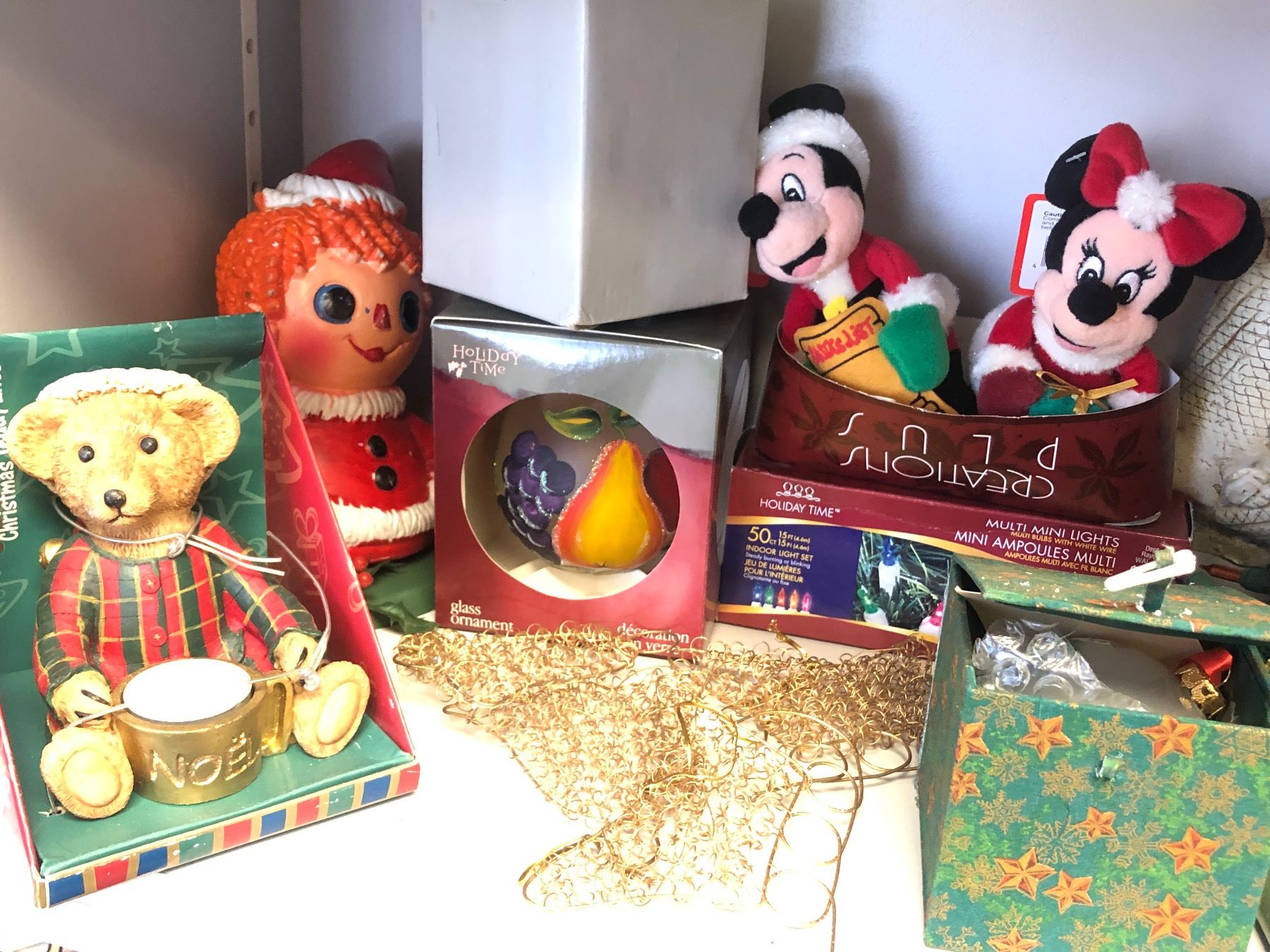 Shelf lot of vintage estate items - includes teddy lites Christmas candle / Raggedy Ann plastic tree ornament / glass ornament etc