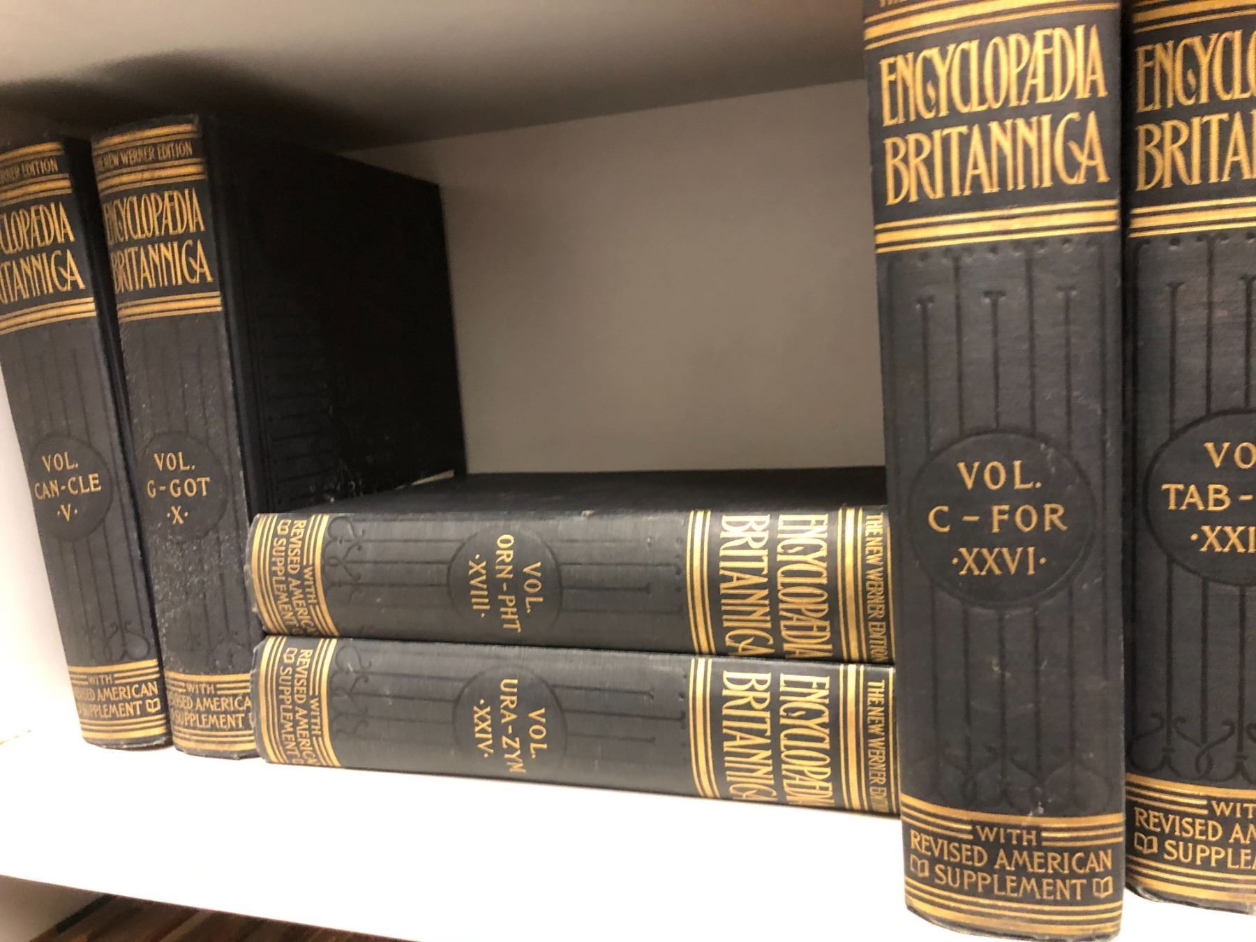 Shelf of encyclopedia britannica hardcover books from the popular sci-fi tv series