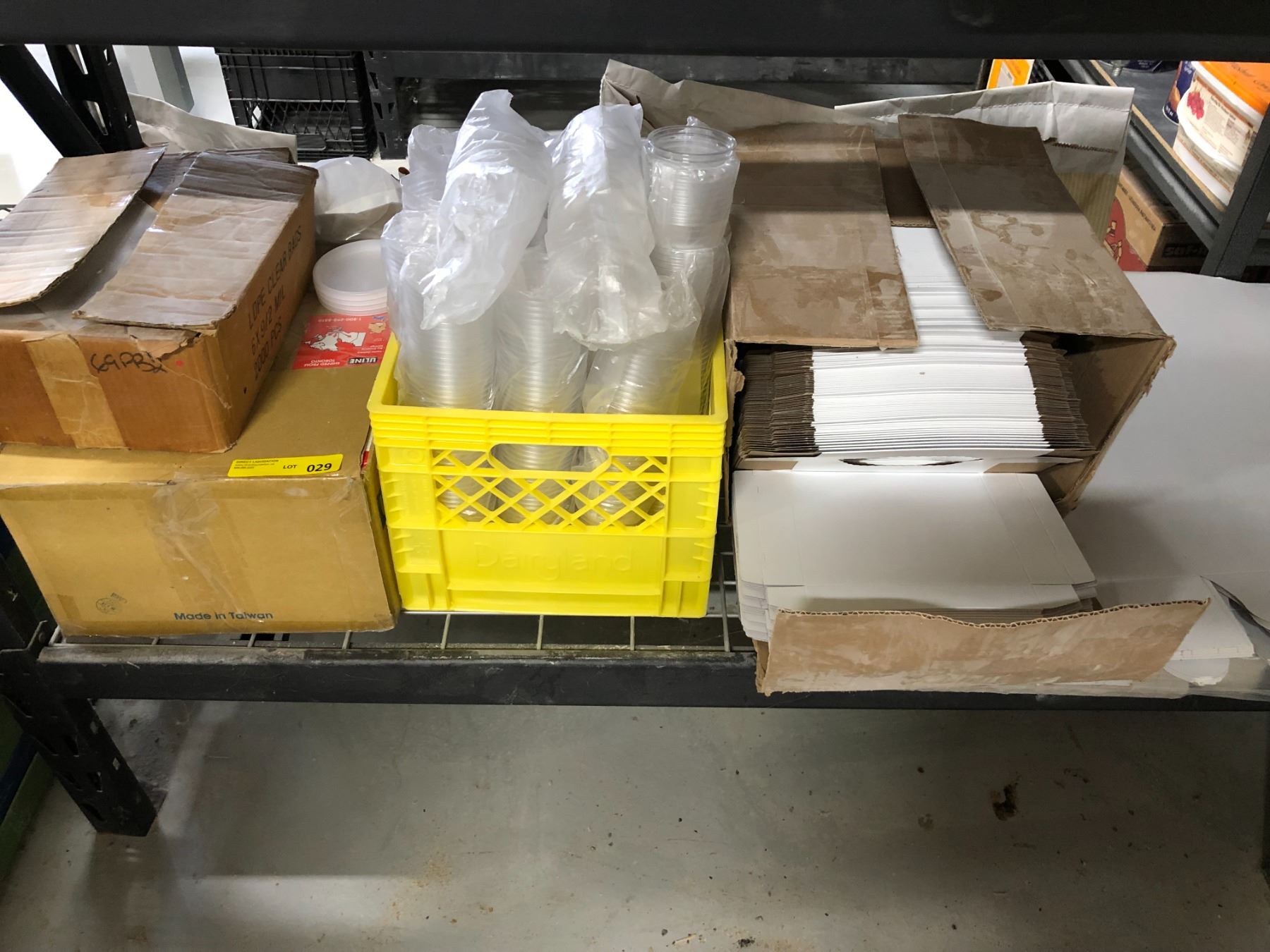Shelf of food packaging - assorted cake boxes/cups w/lids/etc...