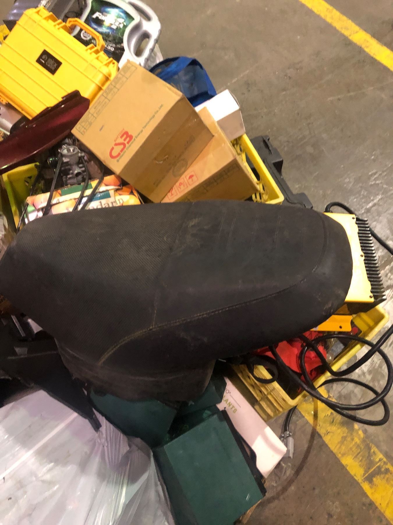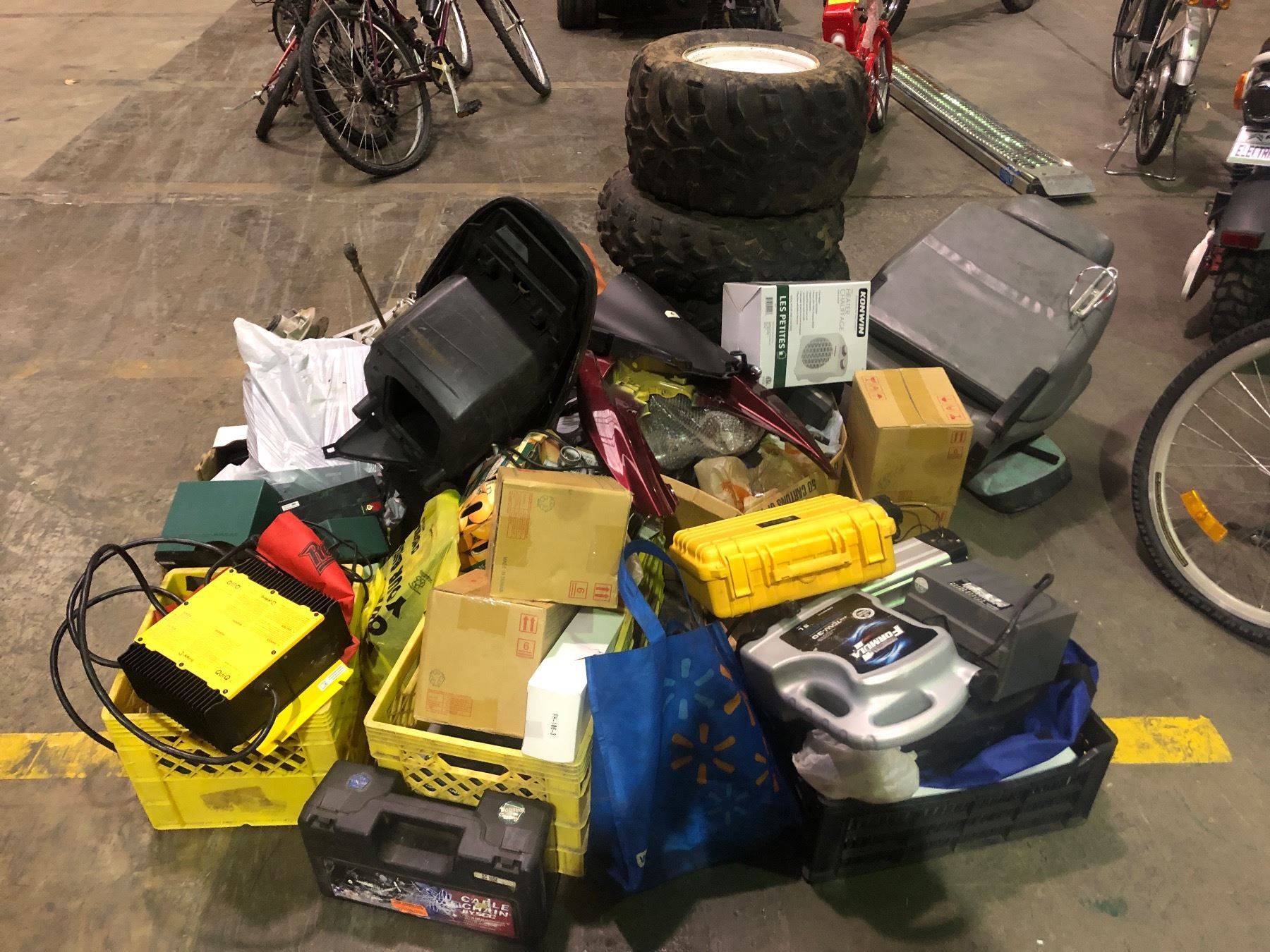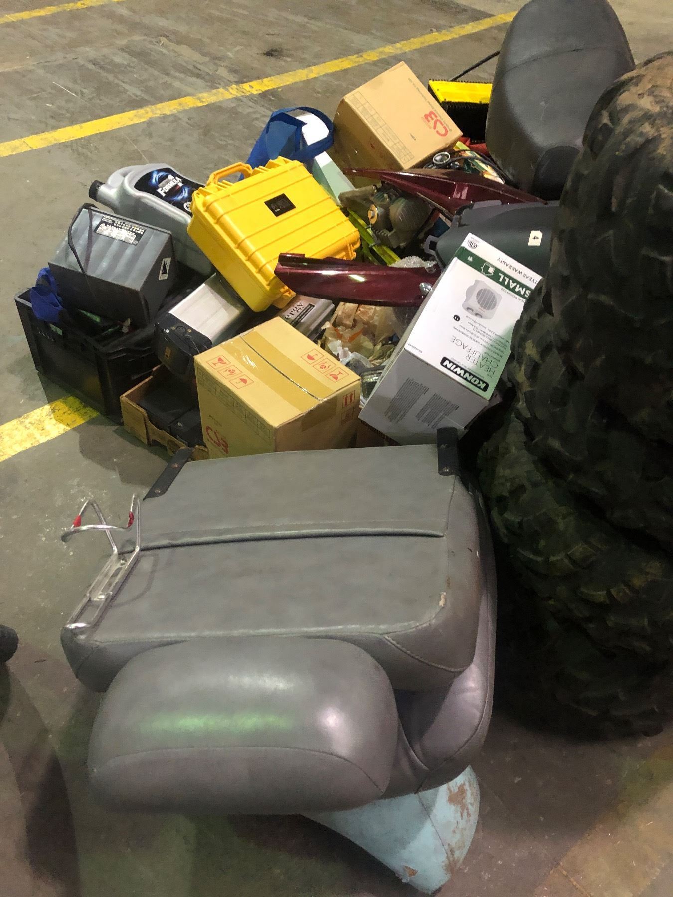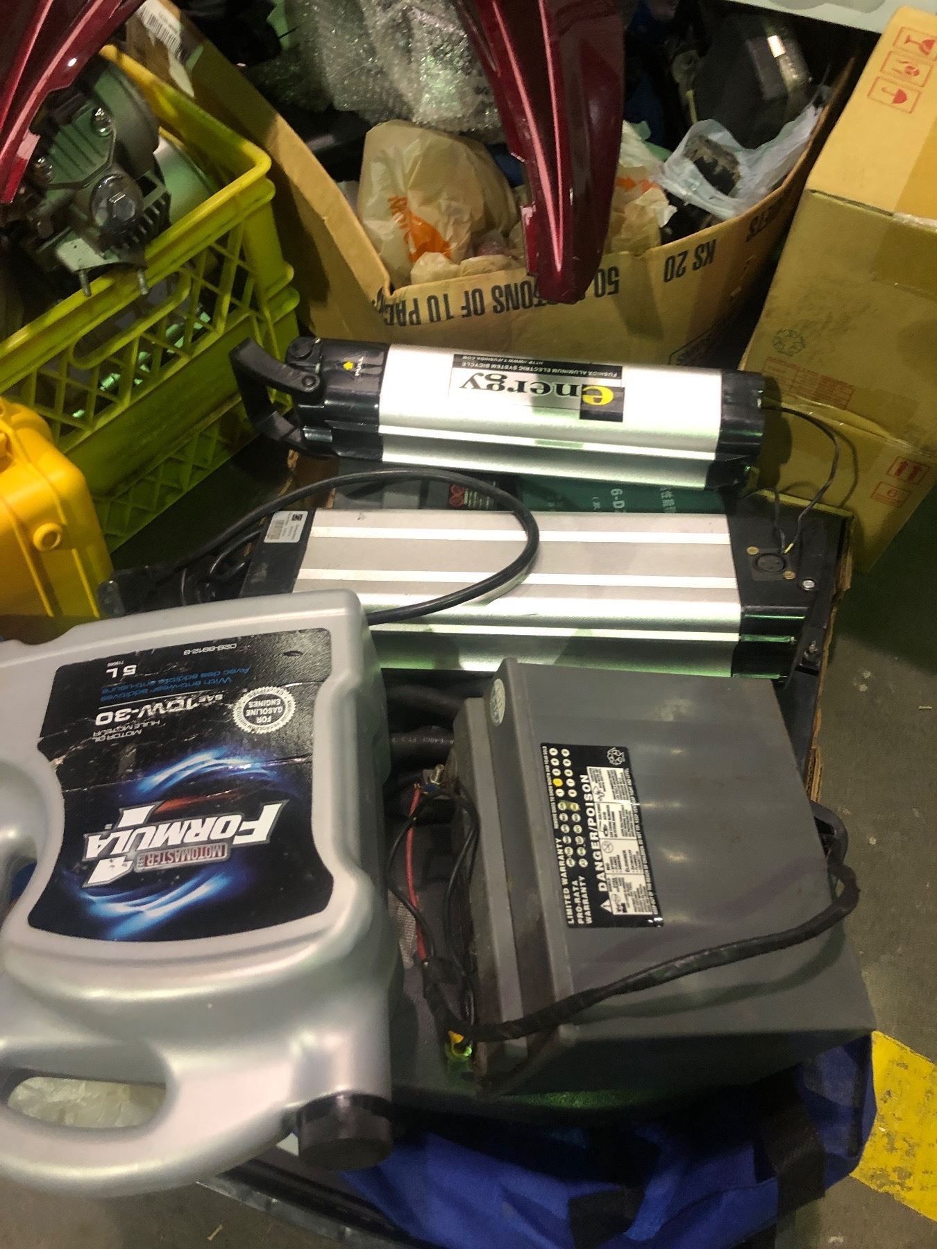 Shelf of misc bike/atv parts includes - motorbike engine, batteries, bike exhaust, suspension, Monst - clean up auction moving auction