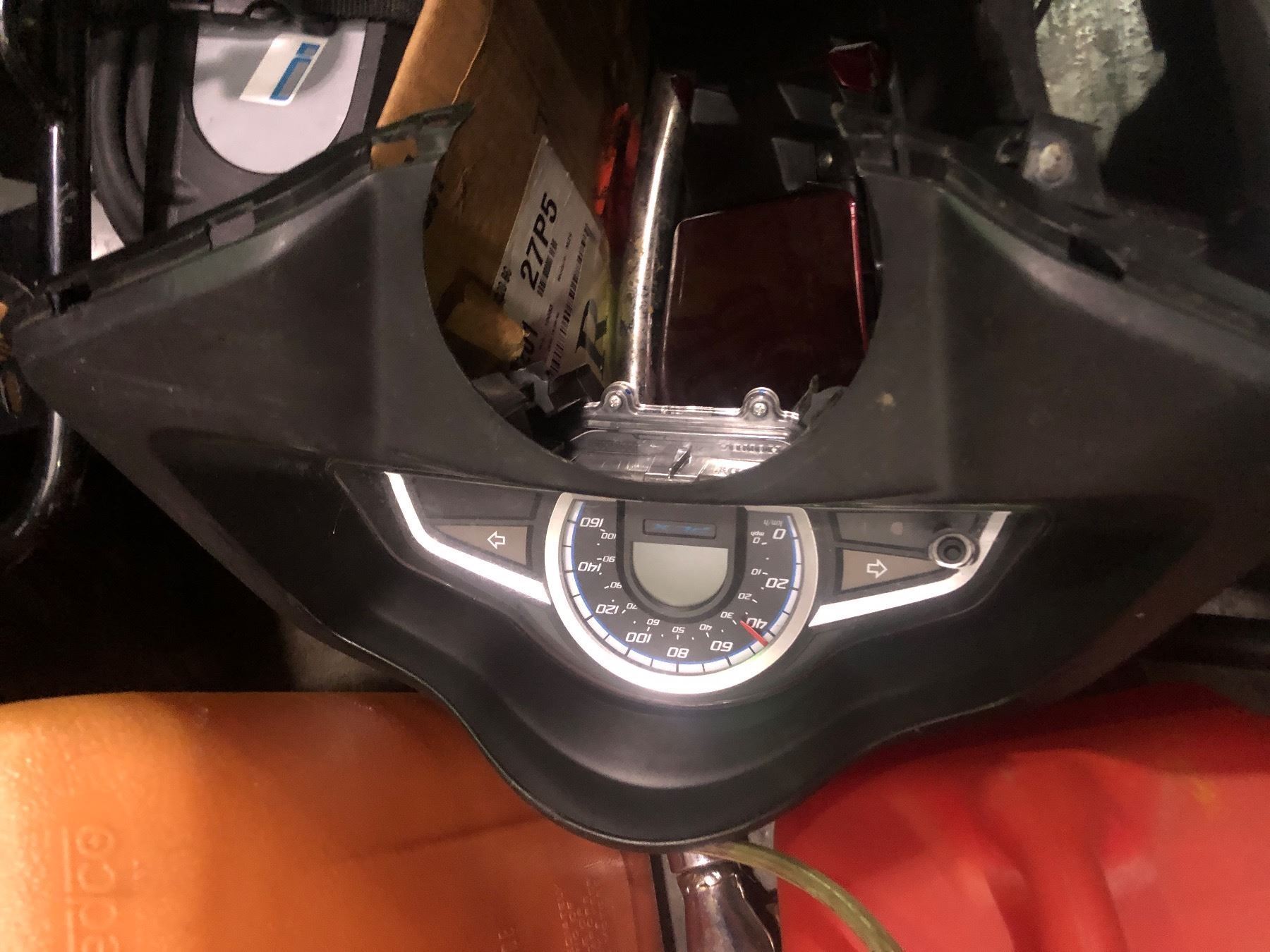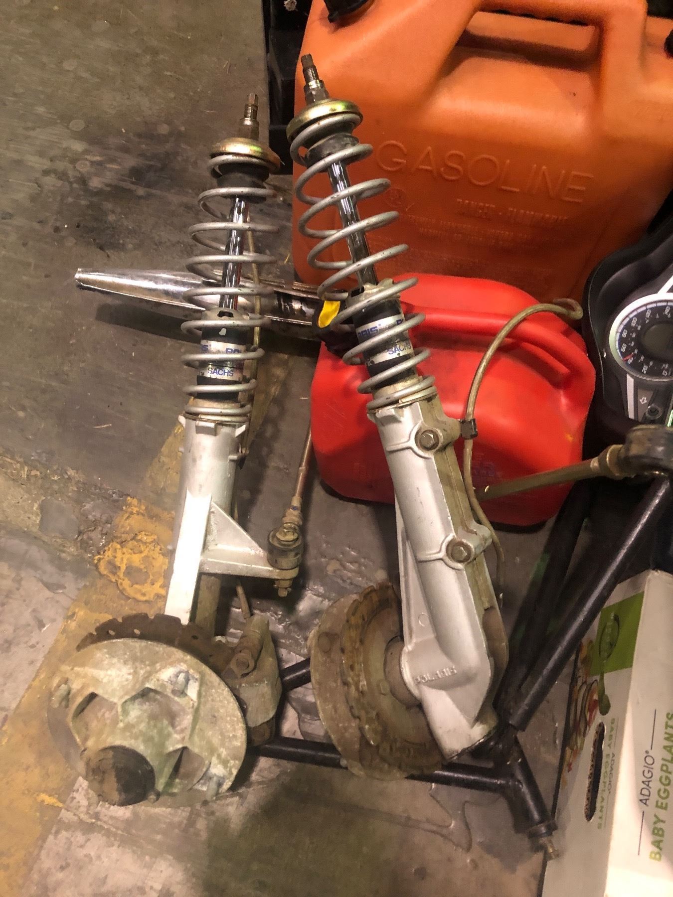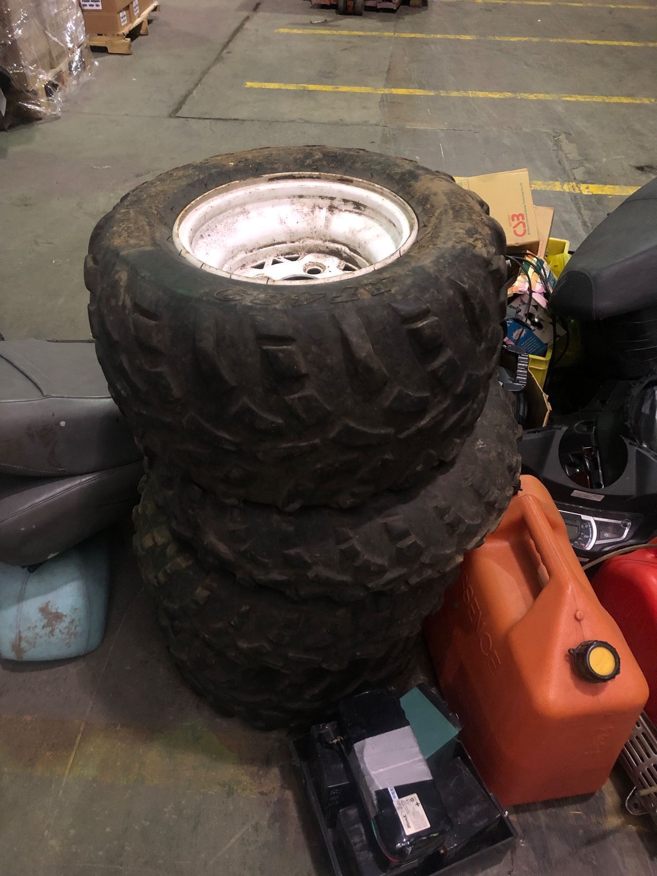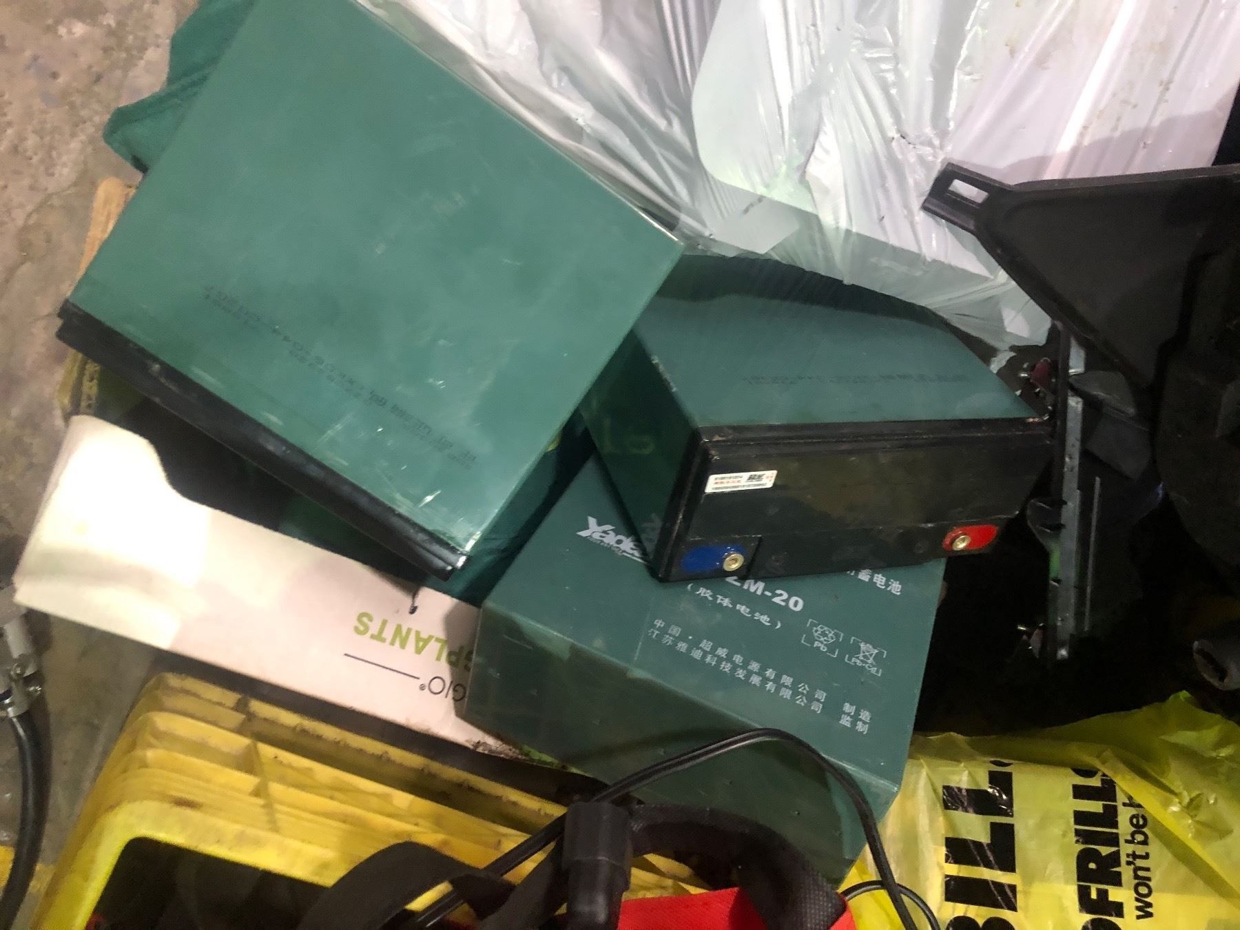 Shelf of misc bike/atv parts includes - motorbike engine, batteries, bike exhaust, suspension, Monst - clean up auction moving auction