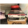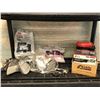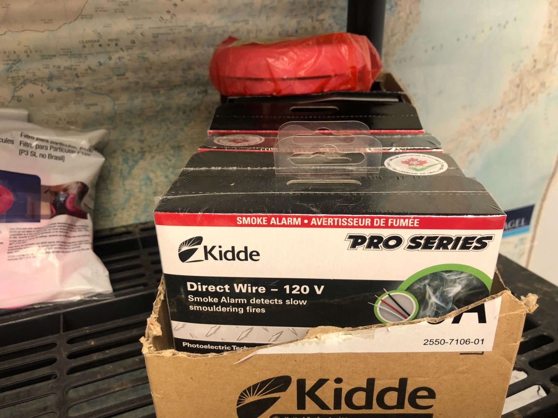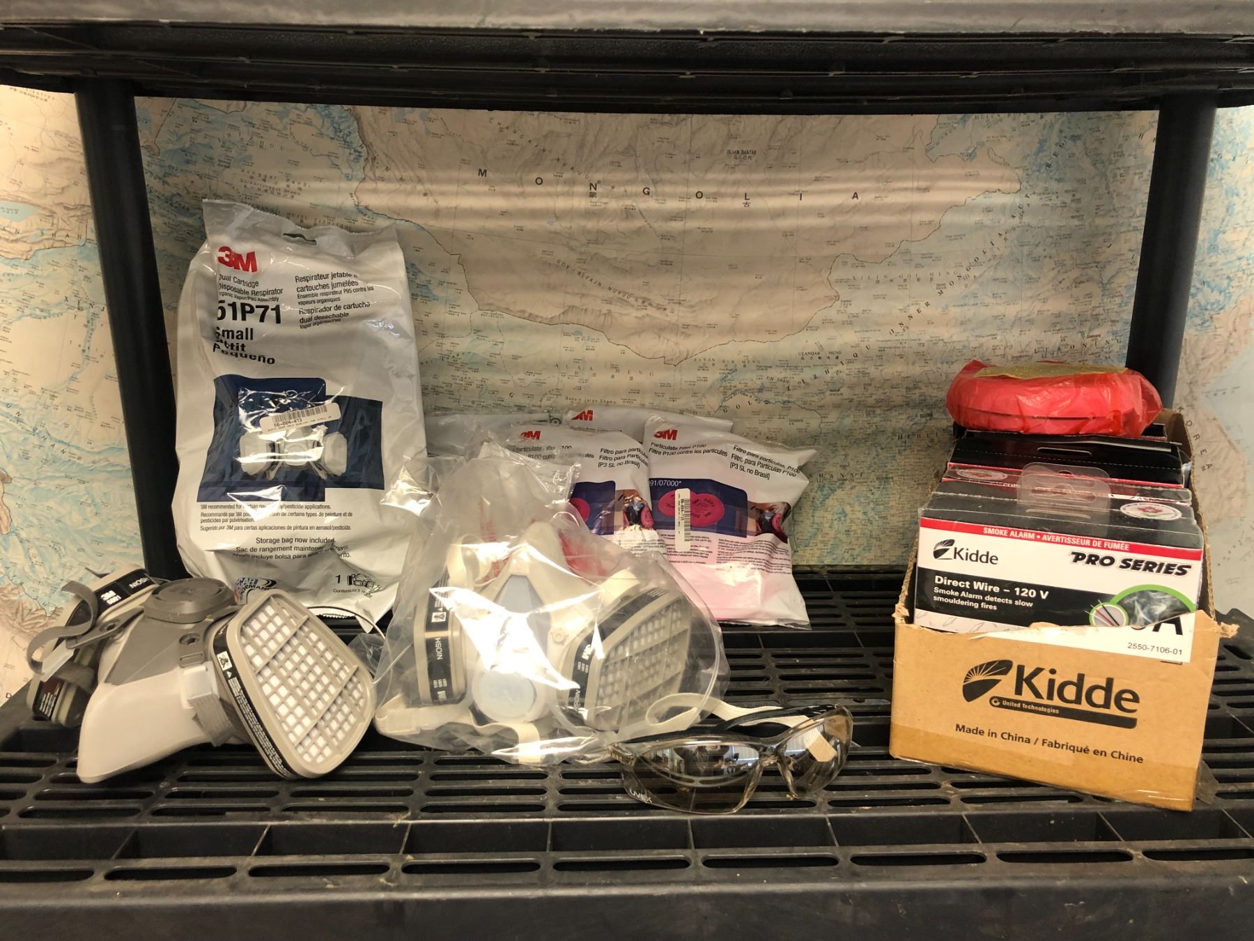 Shelf of new items - 3 respirators w/ 3M filters/ 7 Kidde Pro Series smoke detectors & 1 pair of Uvex safety glasses