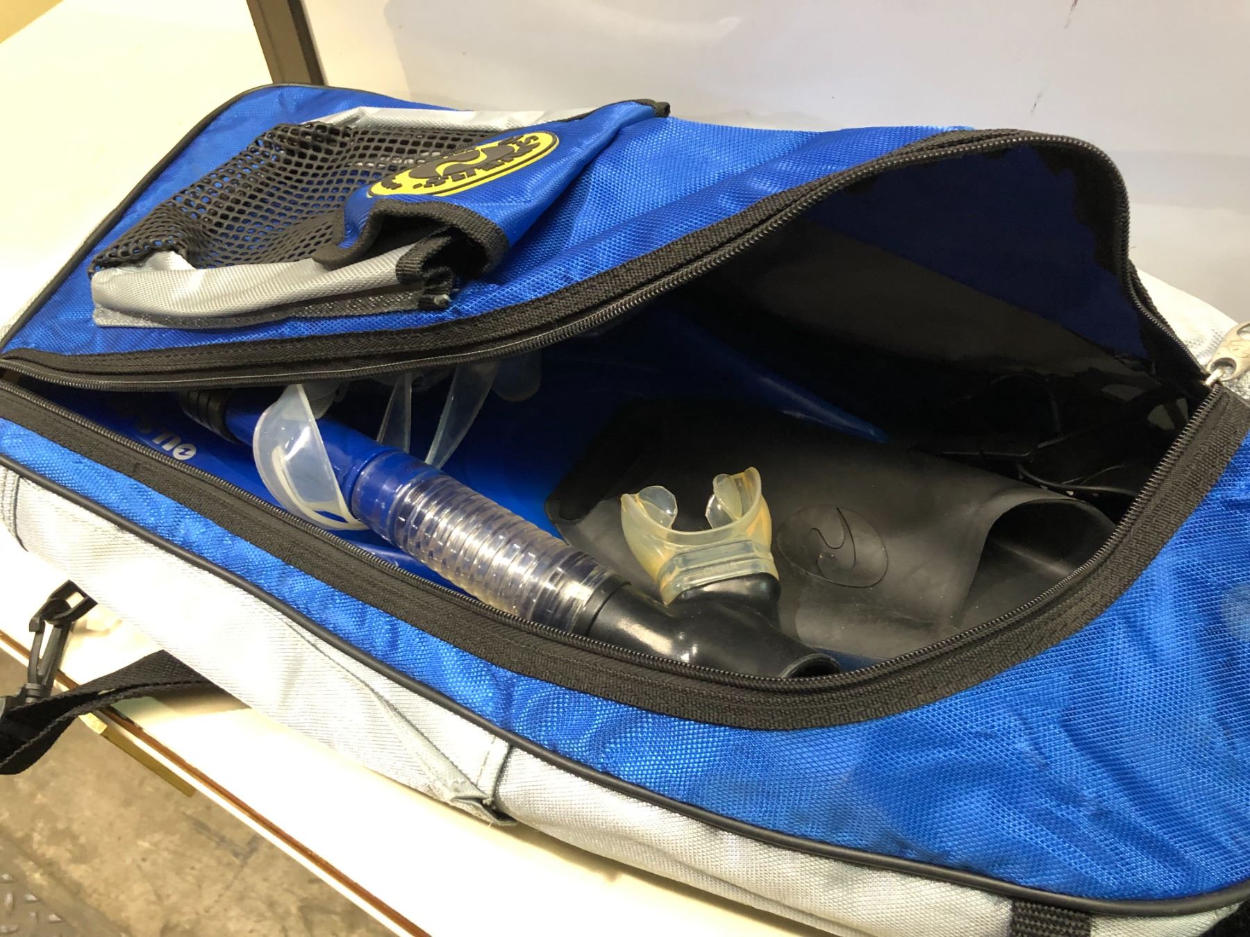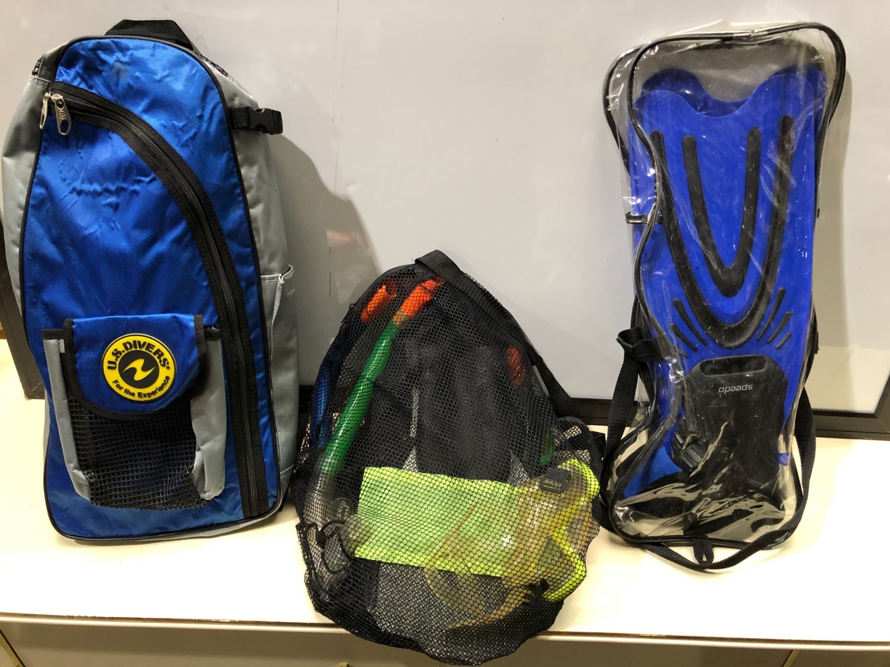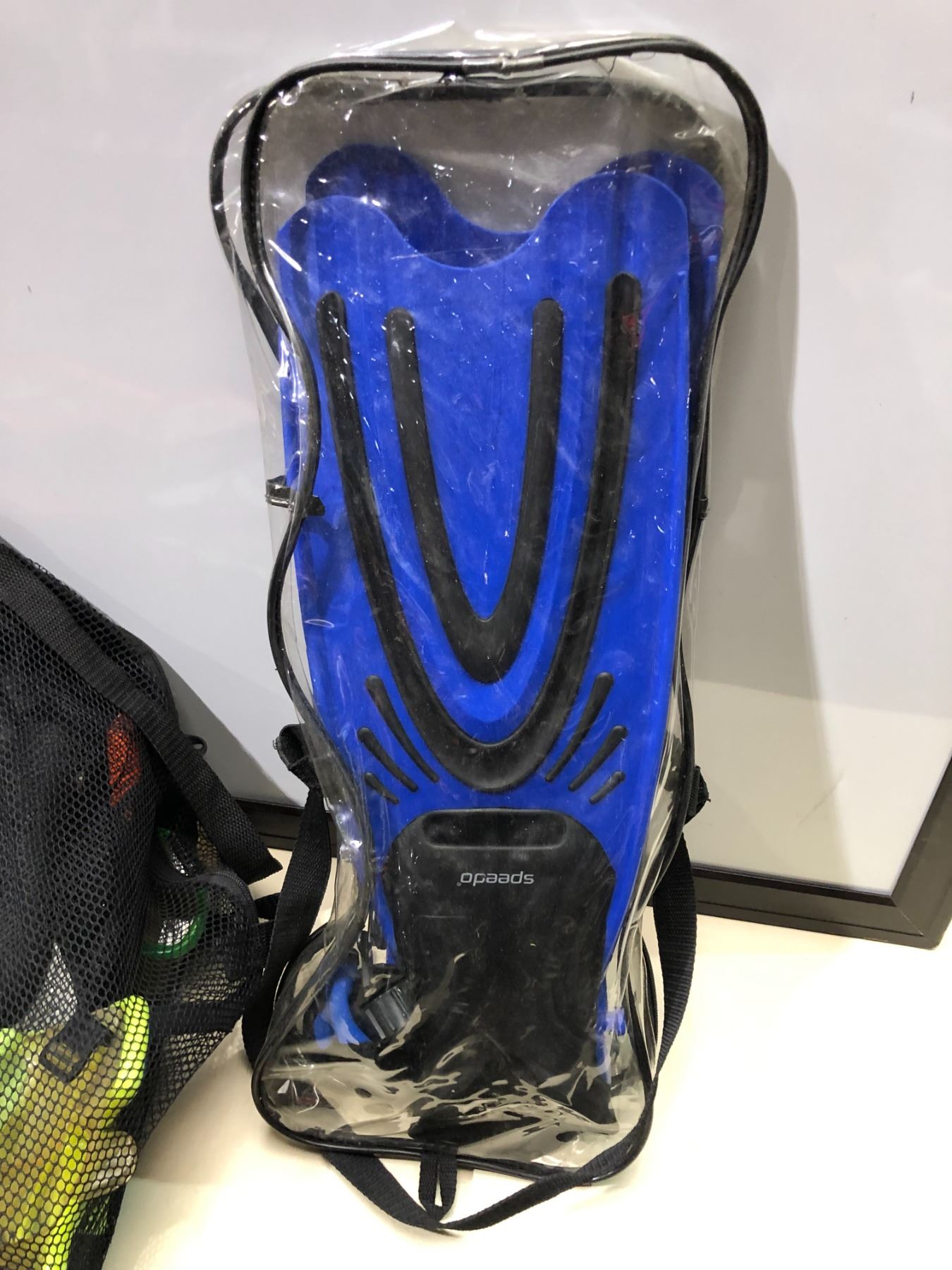 Shelf of watersport equipment snorkelling set, flippers, bags, etc...