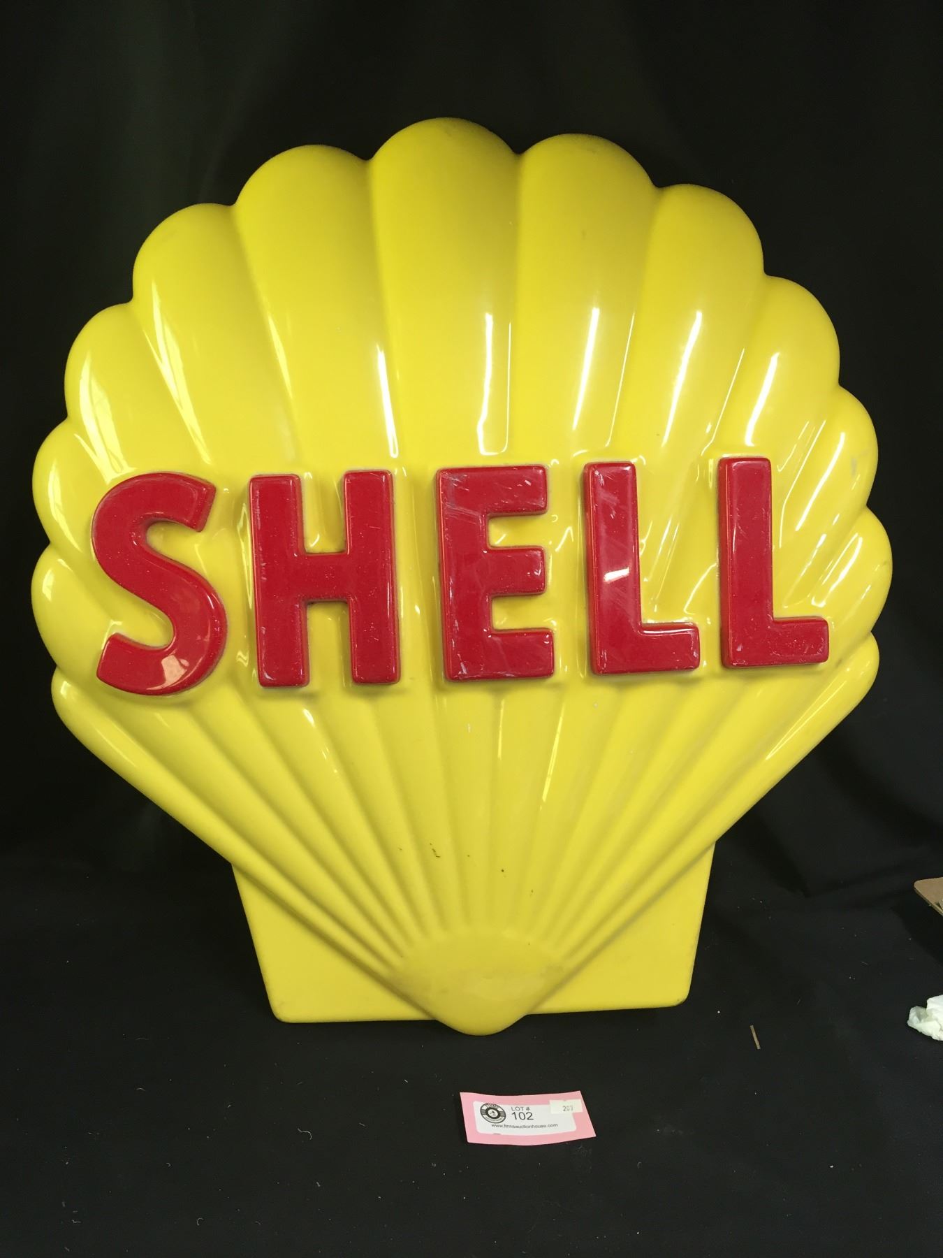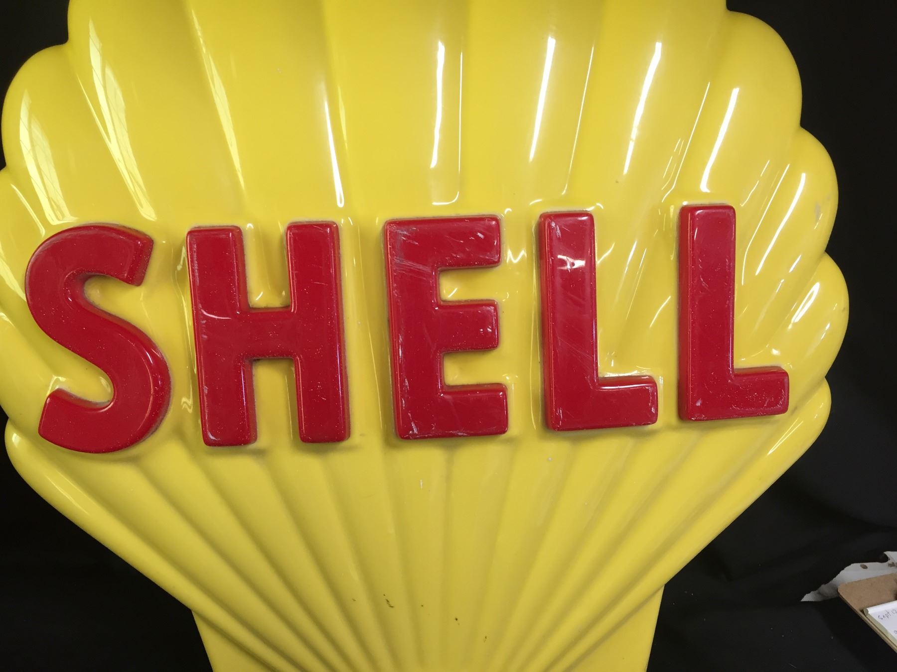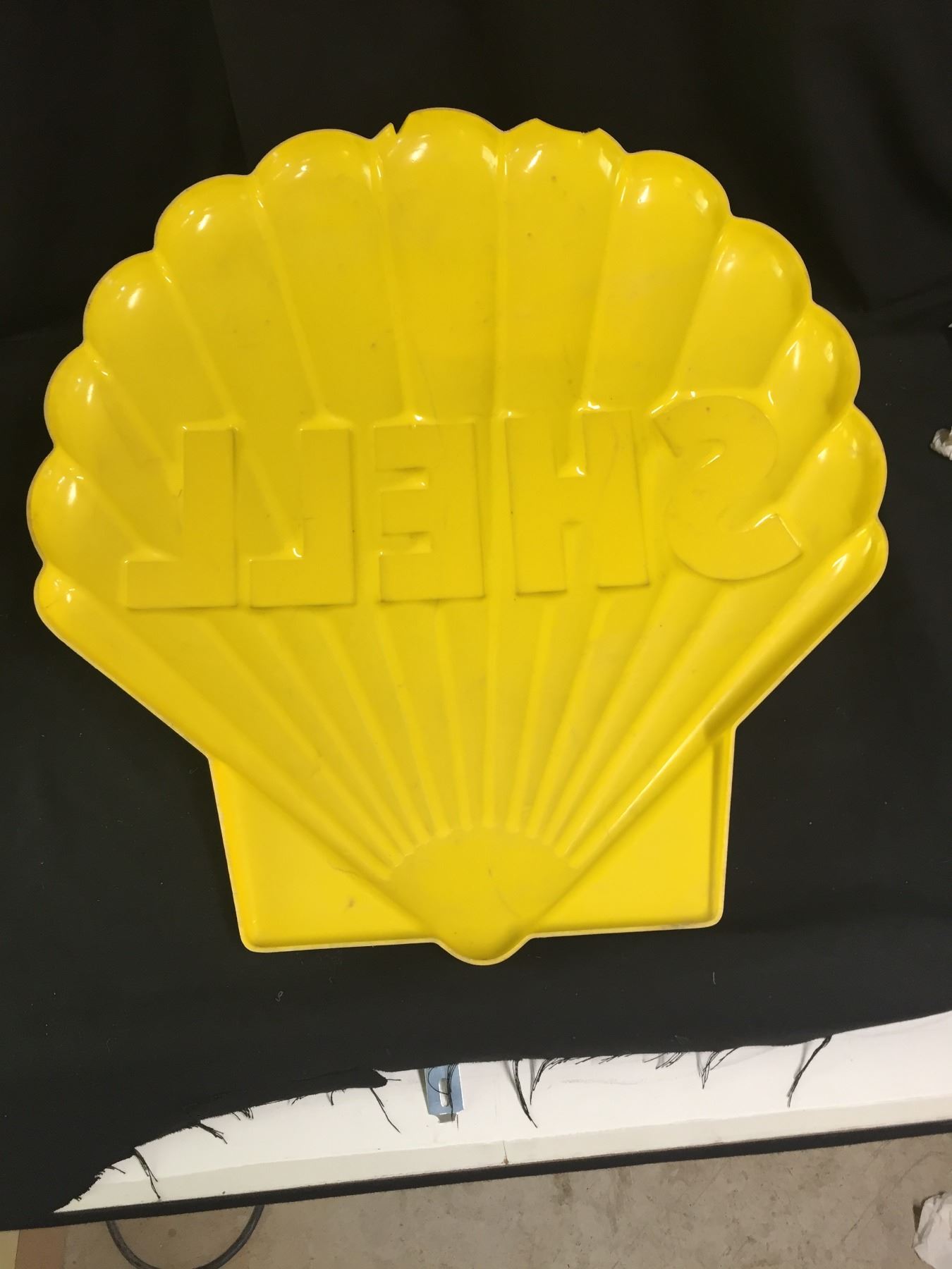 Shell Clam Sign From the 1960's-70's. 27" T x 24" W Made of Heavy Plastic with 2 chips on top from where it was taken down.Shows wear from hanging outside for years