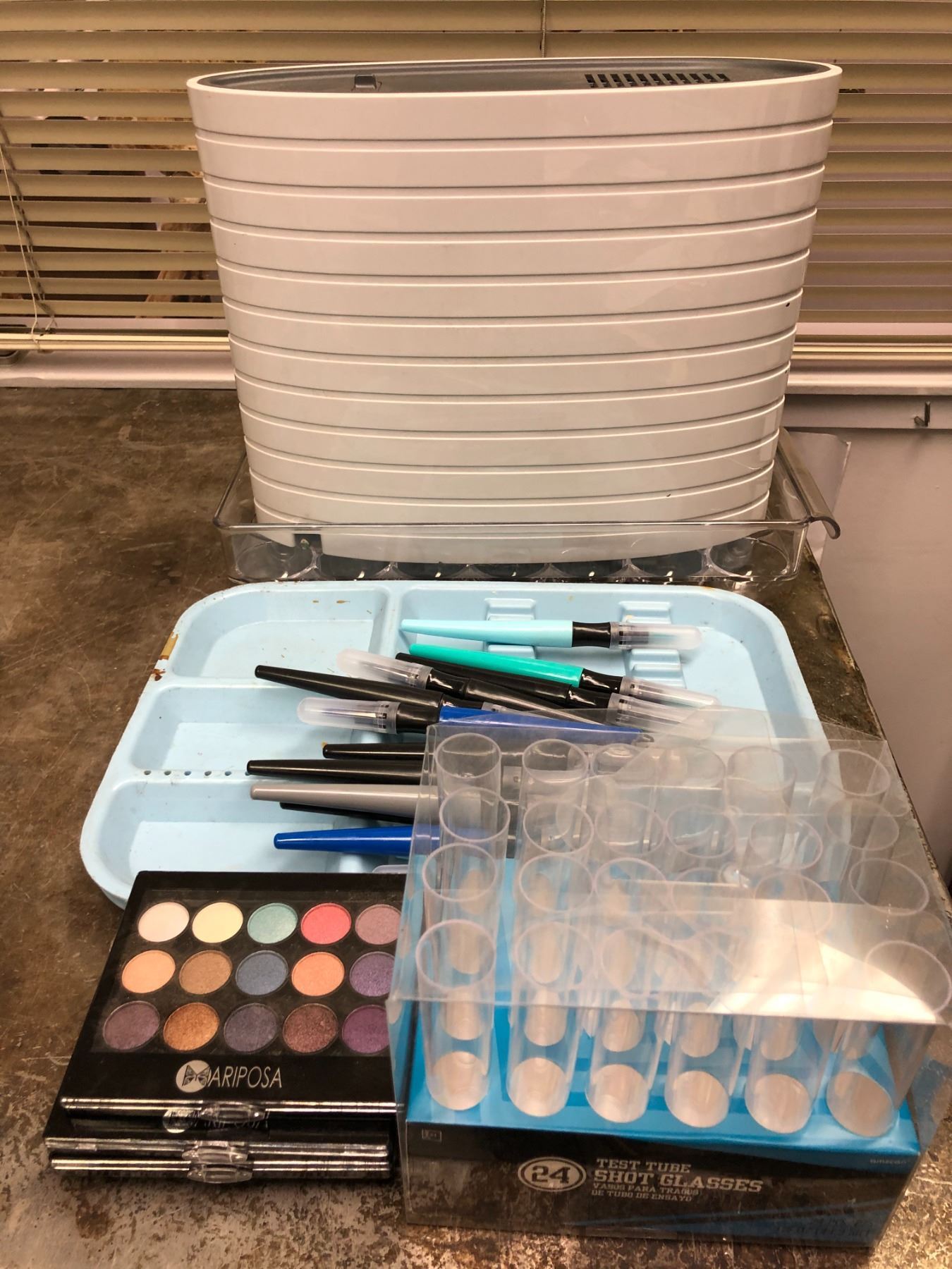 Show prop white fan mounted to egg tray assorted mariposa mascara & box of test tube shot glasses
