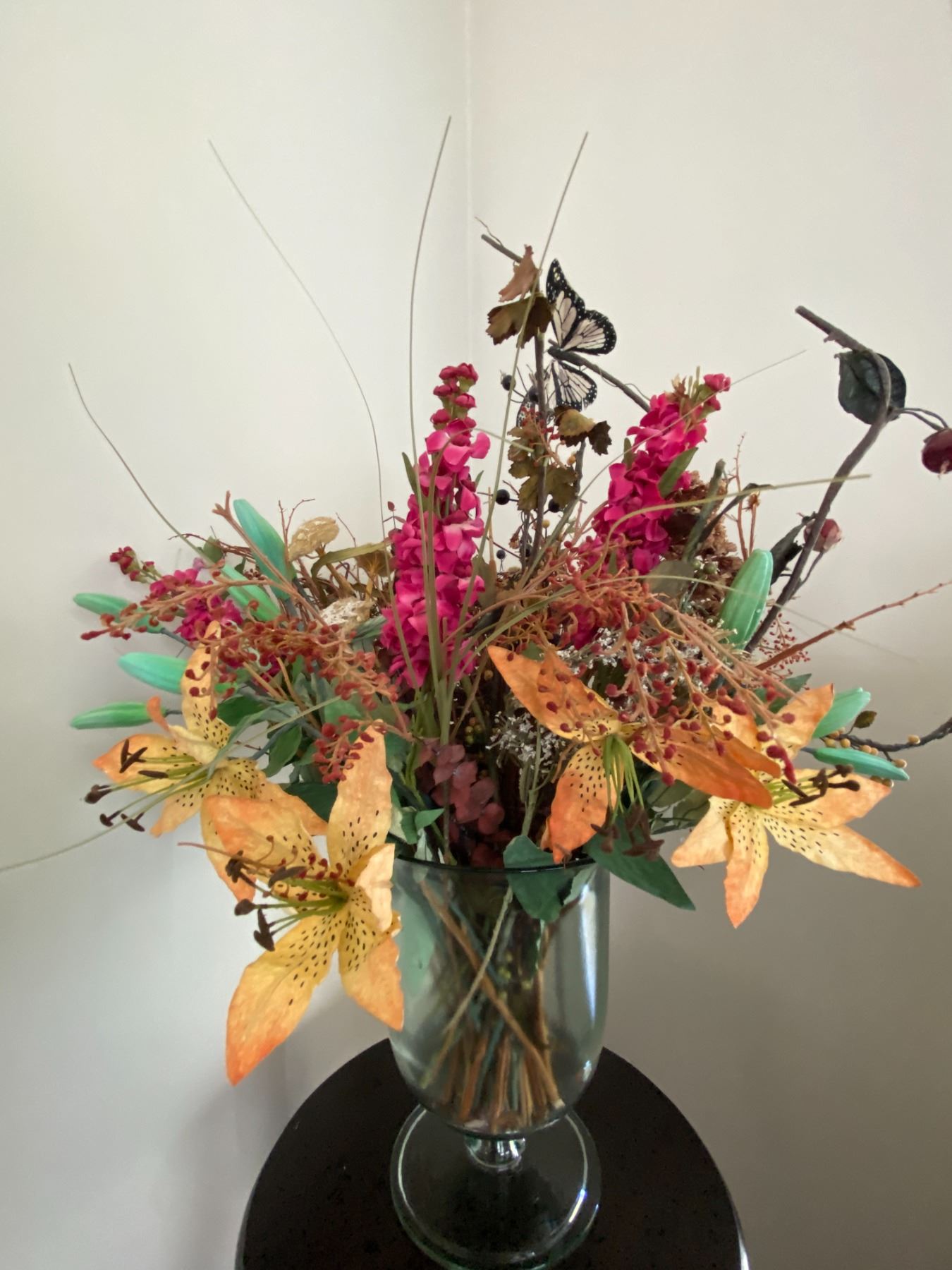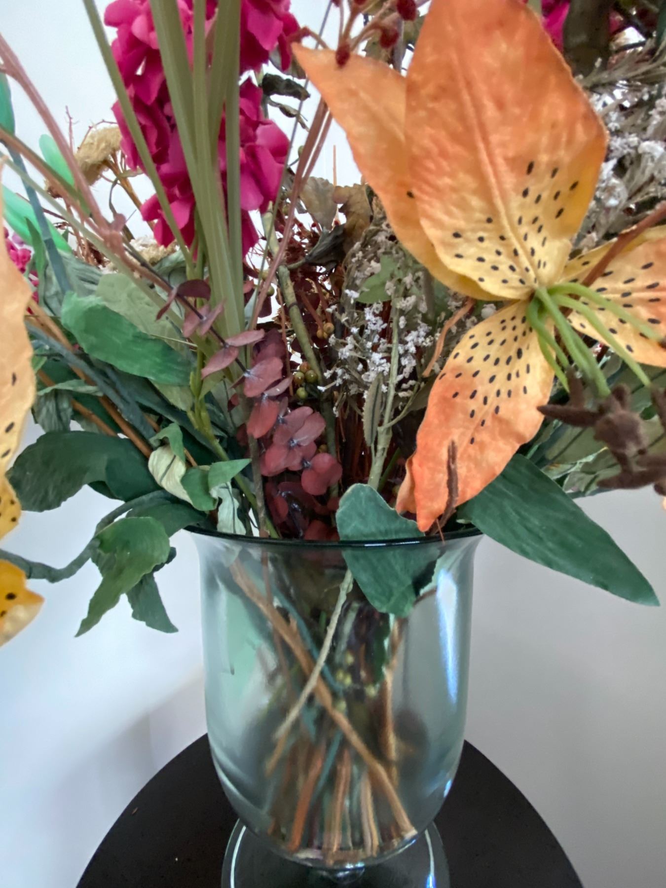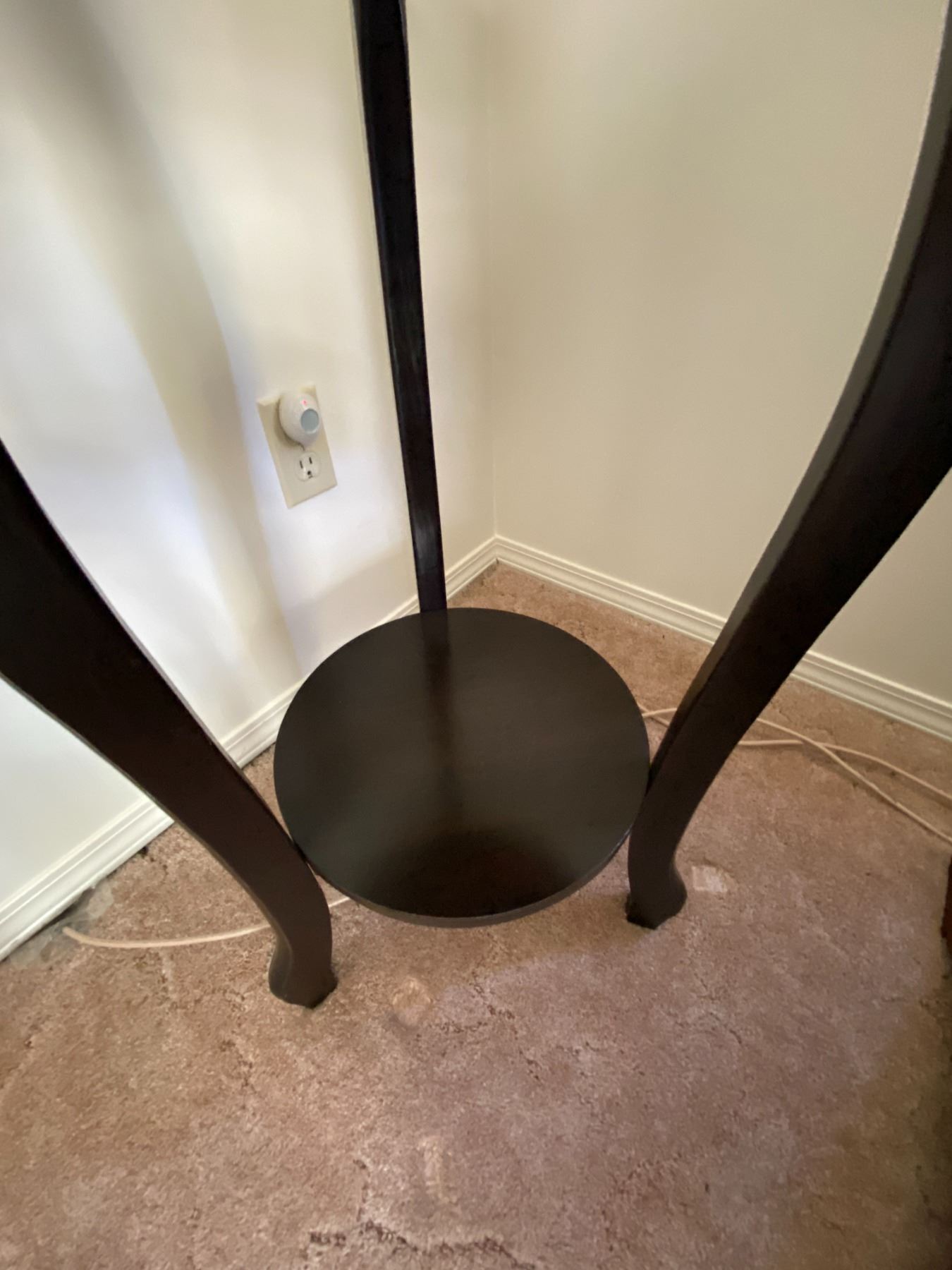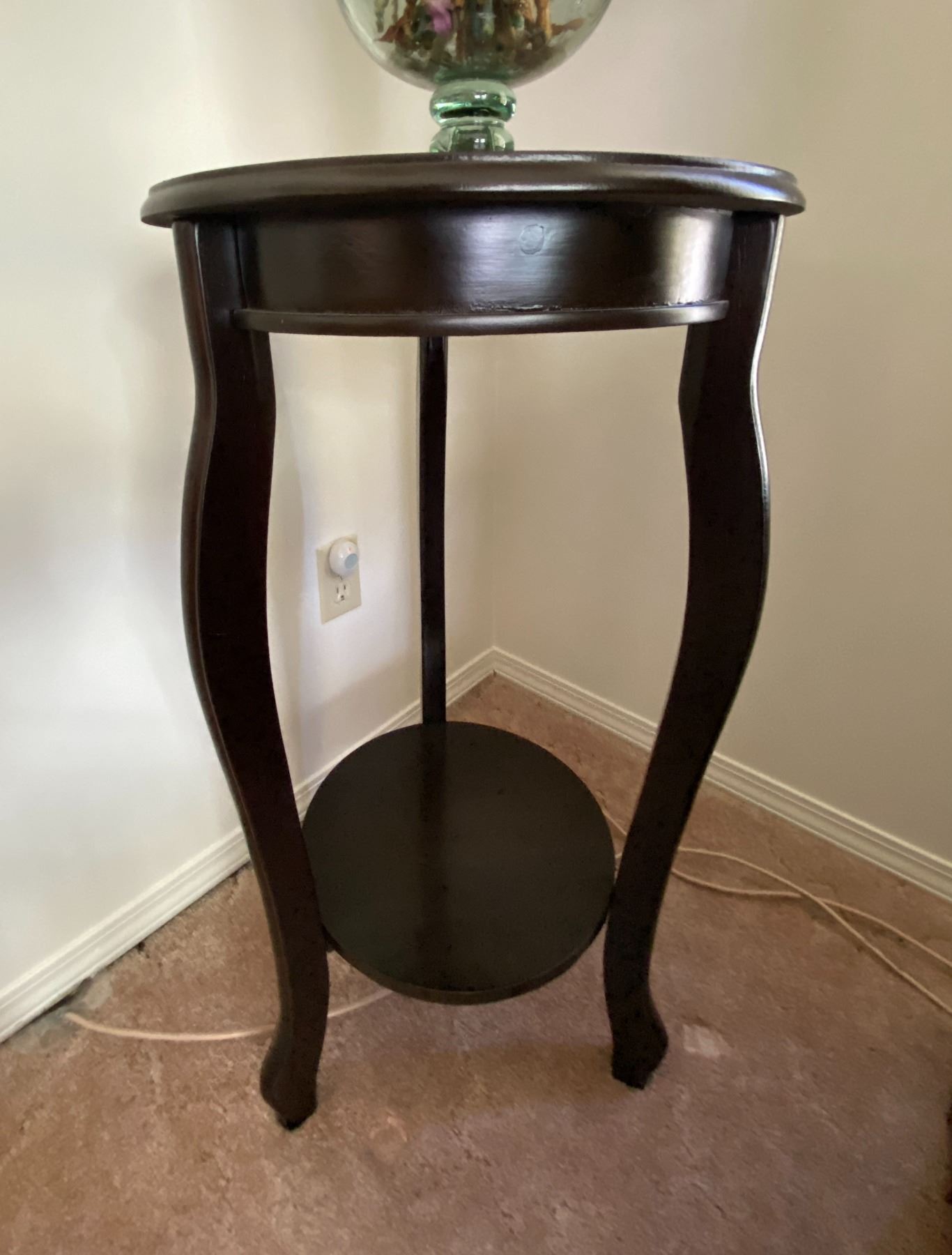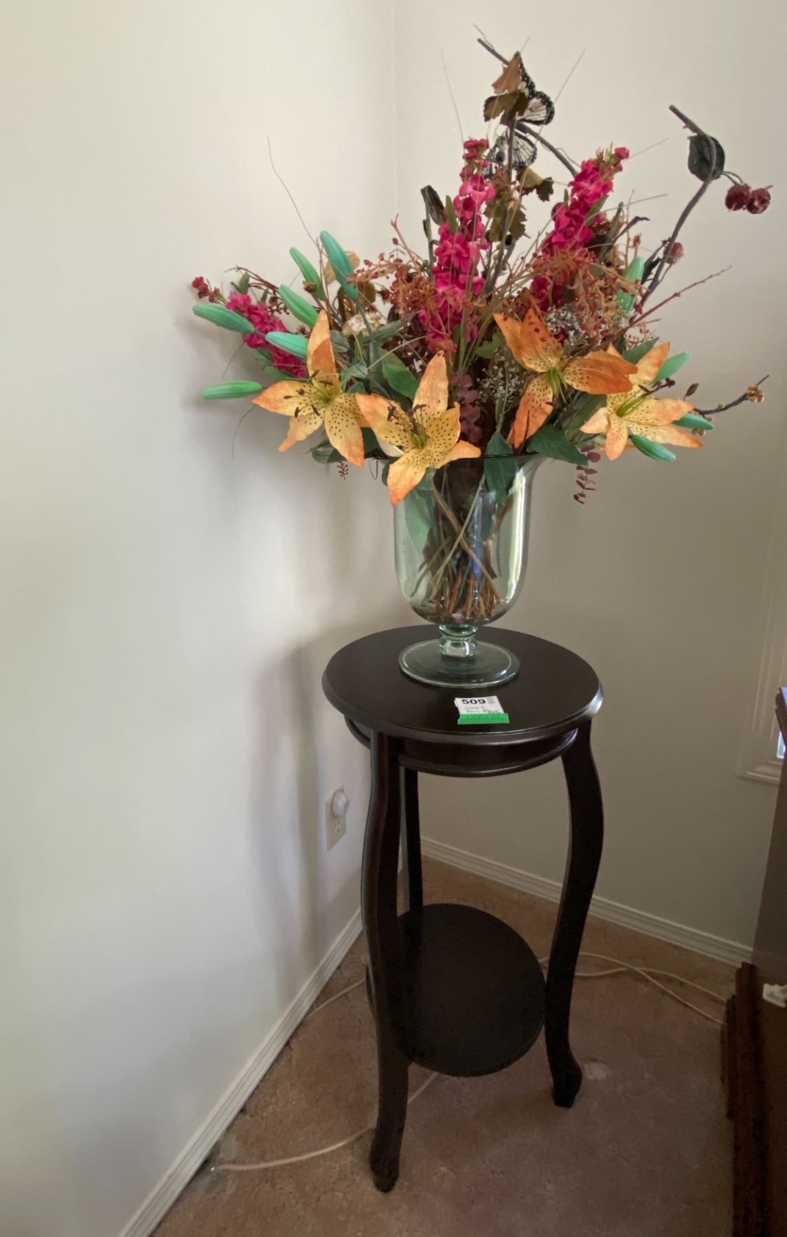 Side table is 15" diameter x 31"H. Faux flowers in vase.