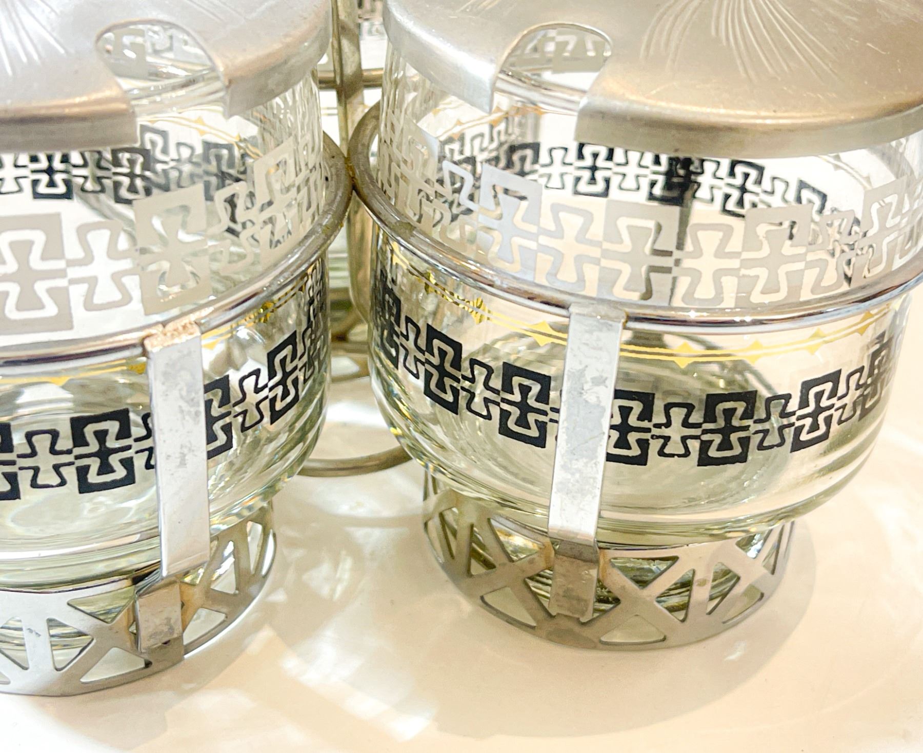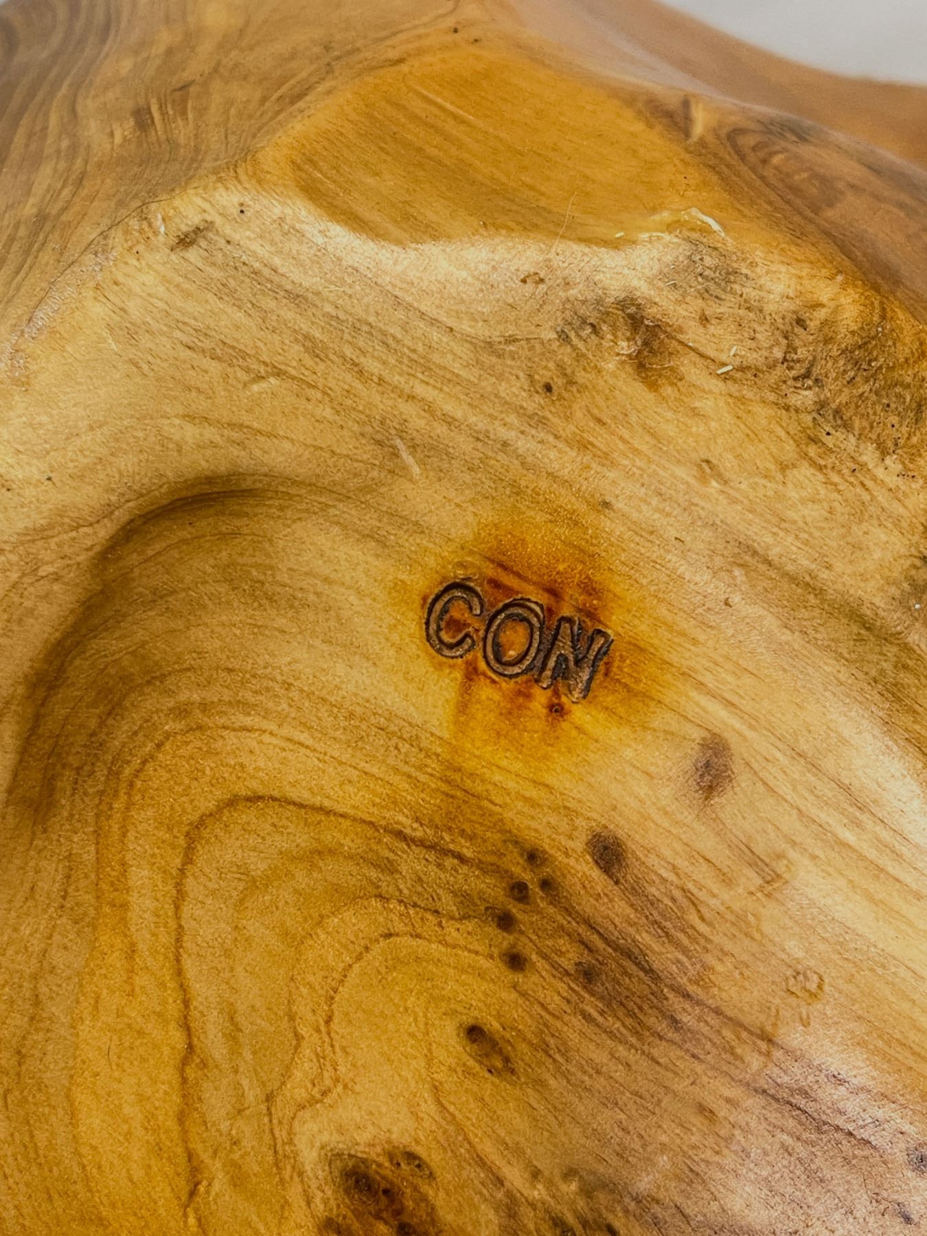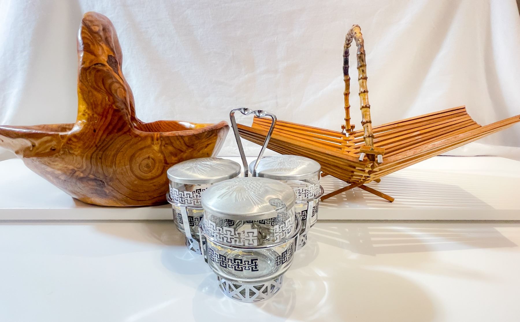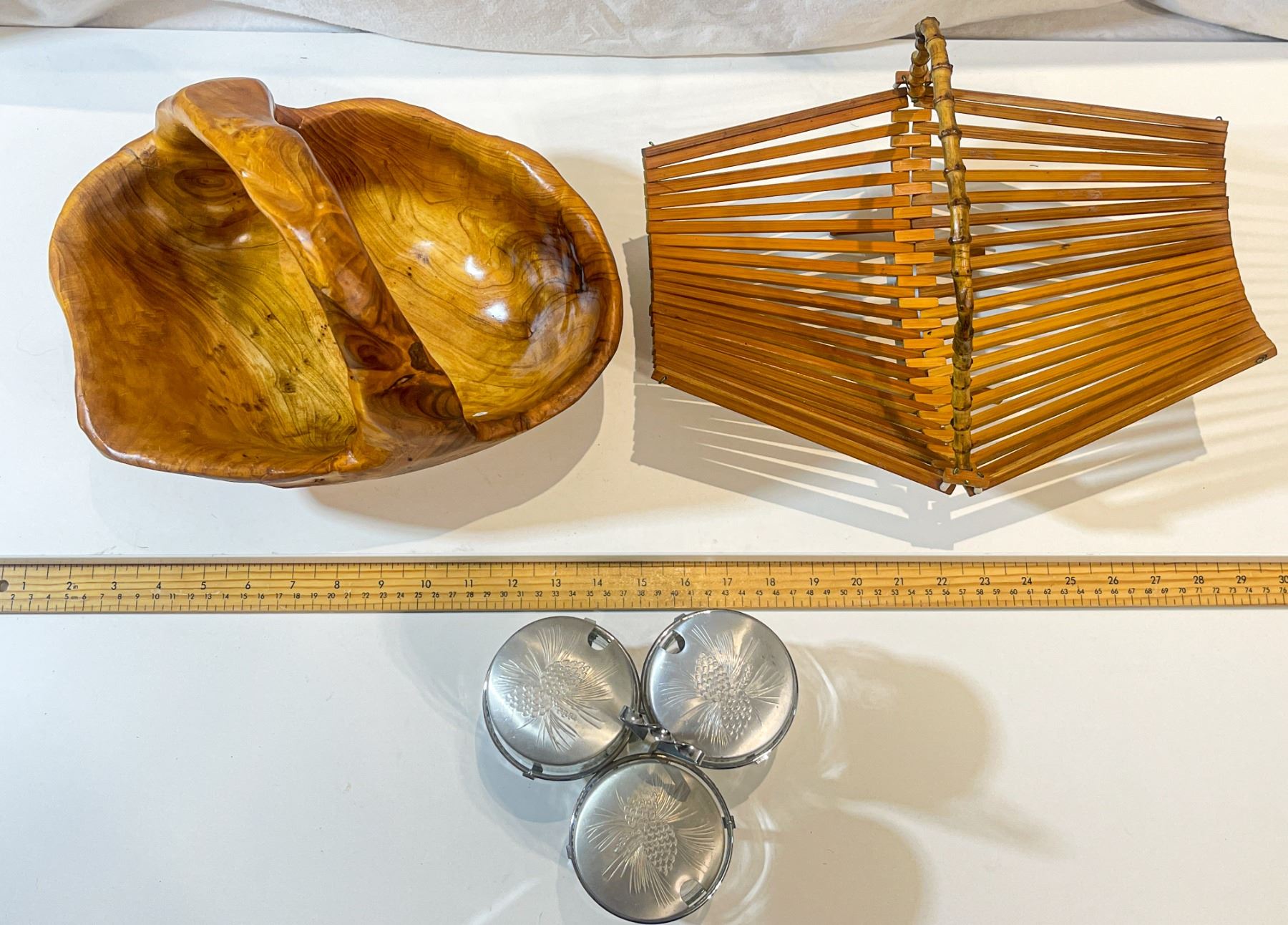 Beautiful mixed-material grouping including a handcrafted burl wood basket signed CON, featuring striking swirling grain and organic form. Also includes a collapsible bamboo handled basket and a vintage glass condiment set with aluminum lids and geometric silver-tone holders. Each piece showcases natural craftsmanship and mid-century style. Light wear consistent with age; perfect for rustic, boho, or retro-inspired décor.