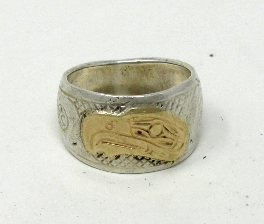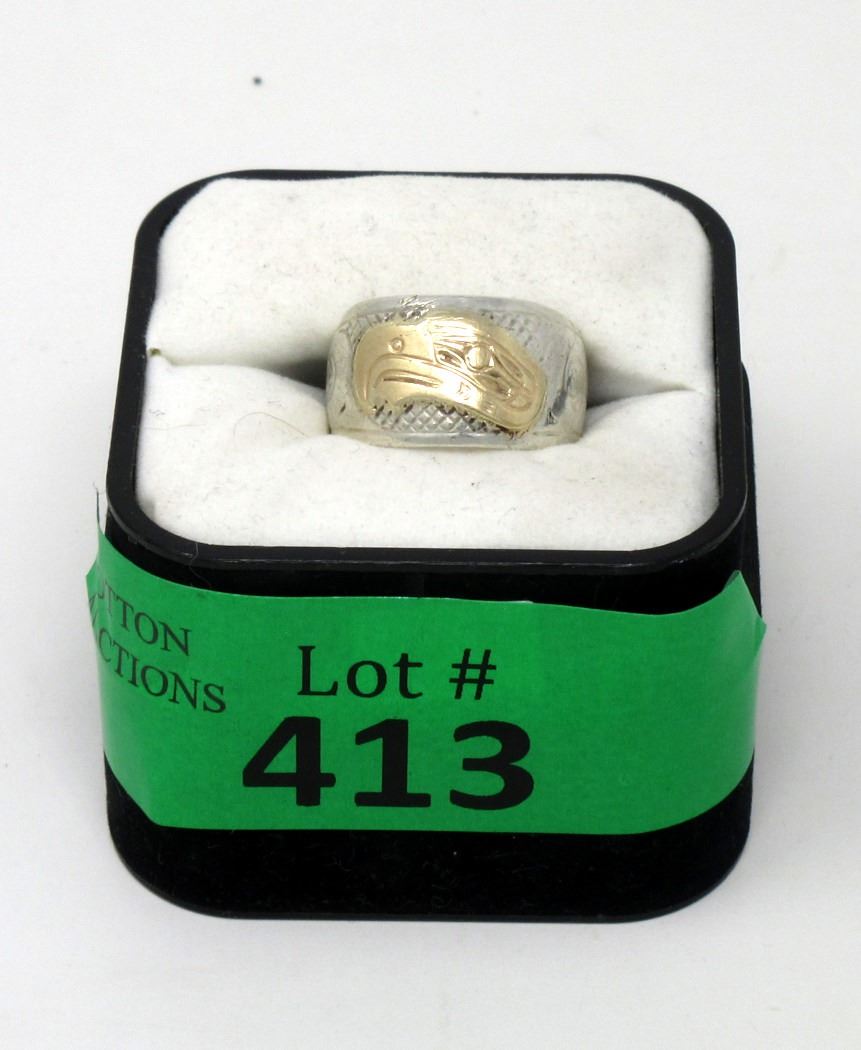 Eagle design on 1/4" wide band. Size 9. Solid Sterling Silver with applied 14KT Yellow Gold Eagle Head.