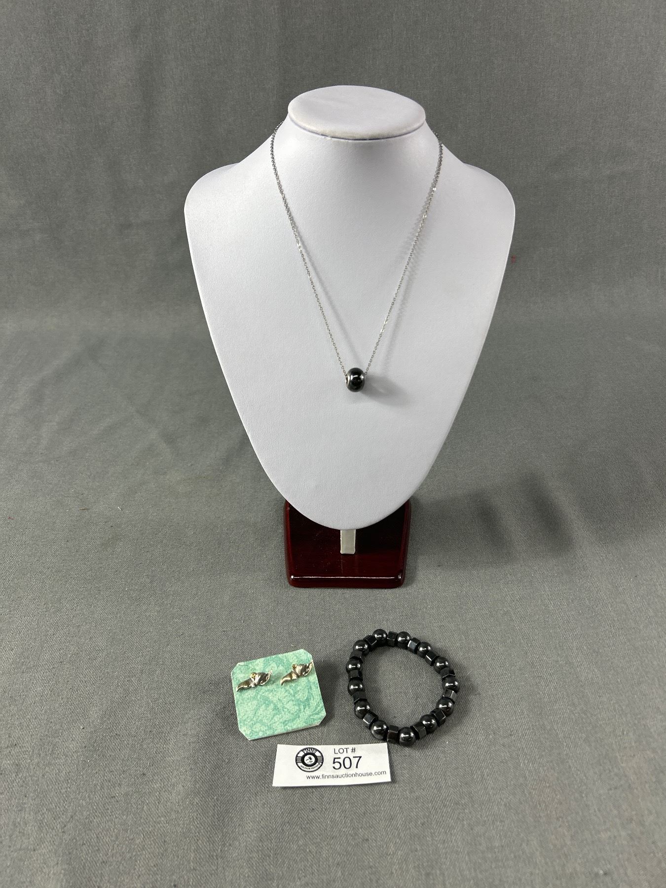 Silver Necklace with Black Bead Pendant, Black Bracelet and Pair of Earrings