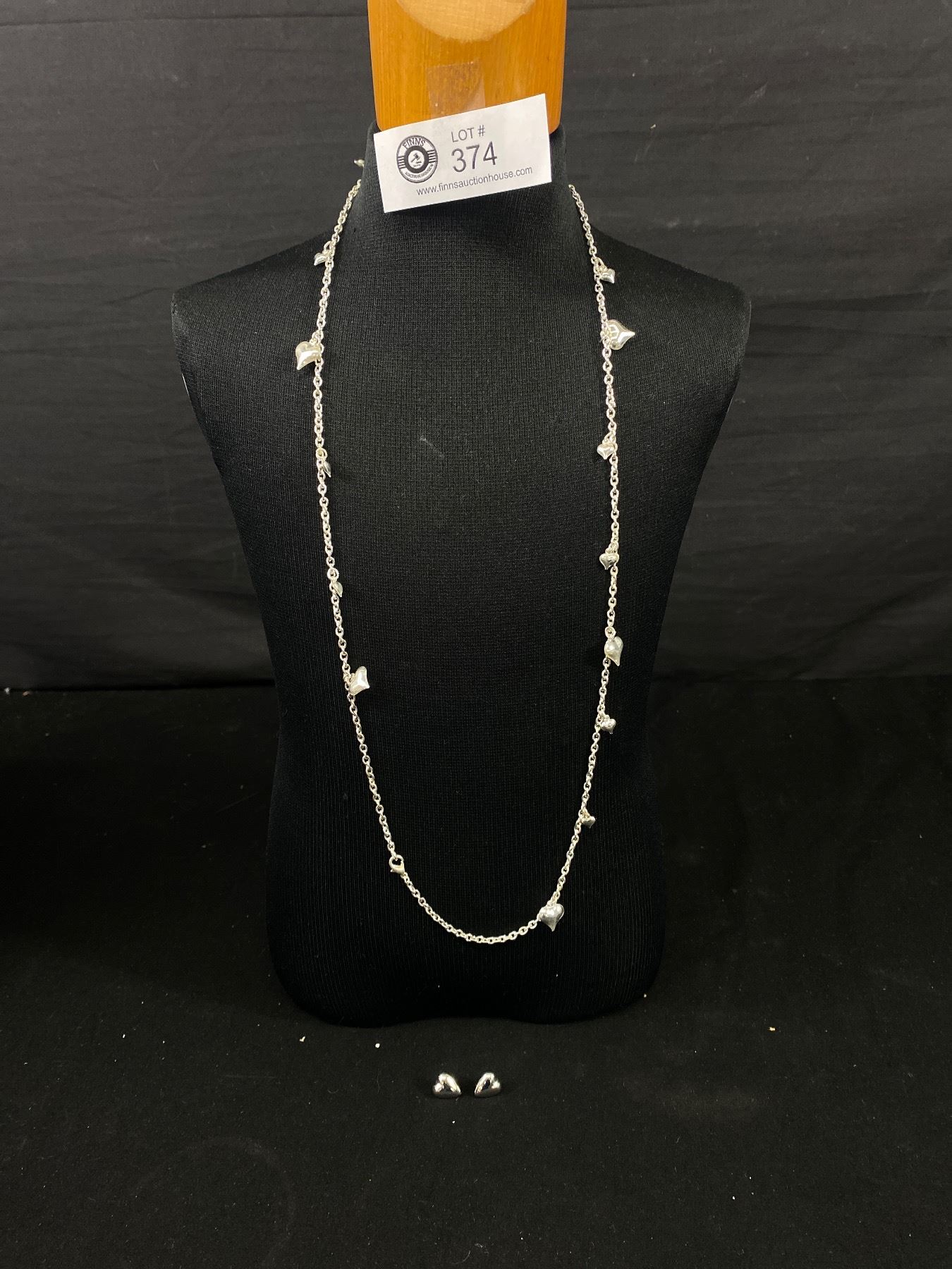 Silver Plated Double Length Heart Charm Necklace 32" L & Hearts Earring Sets