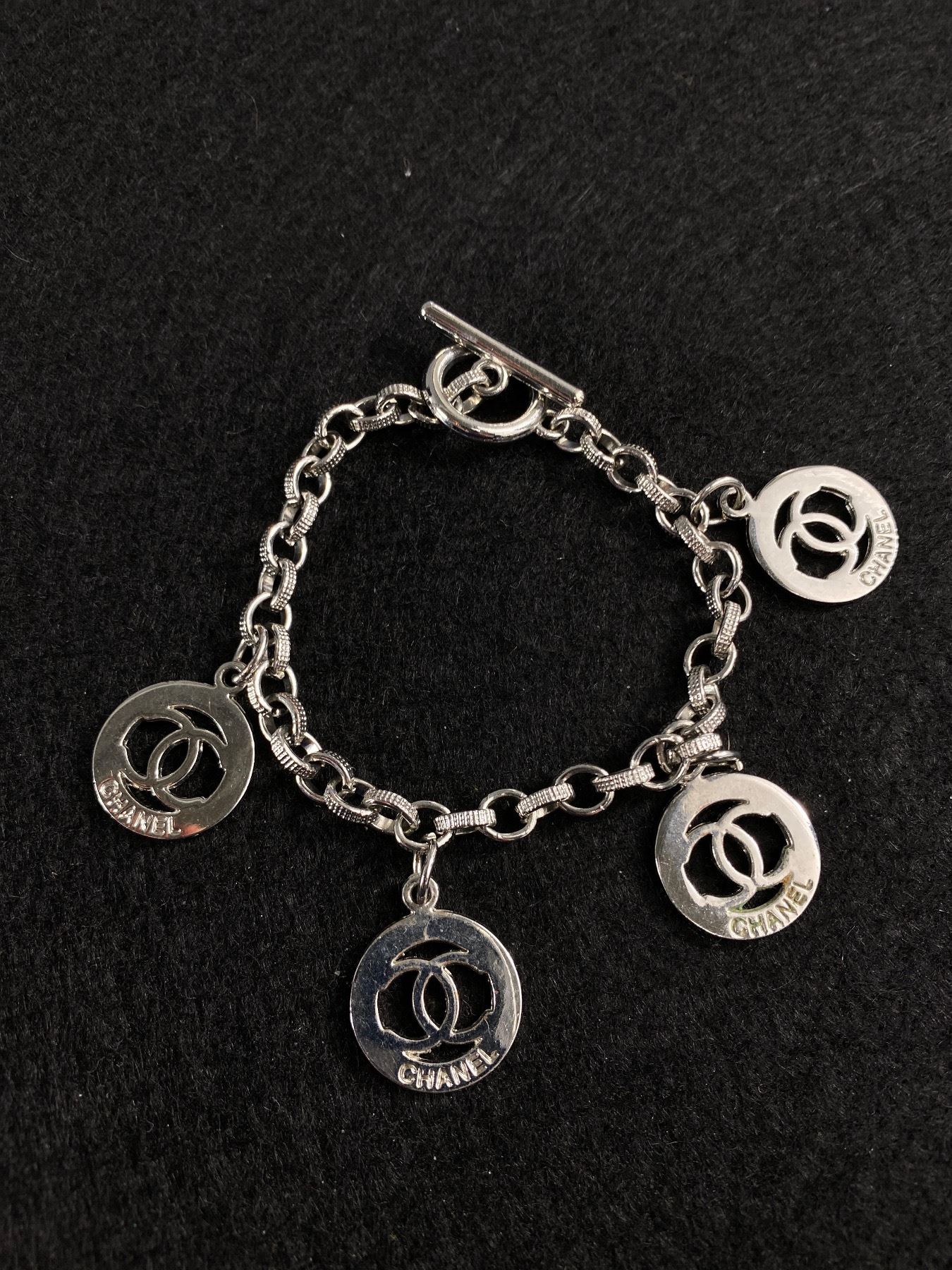 Silver Tone Link w/ 4 Marked CHANEL Charms Bracelet, Original Clasp. Good Condition