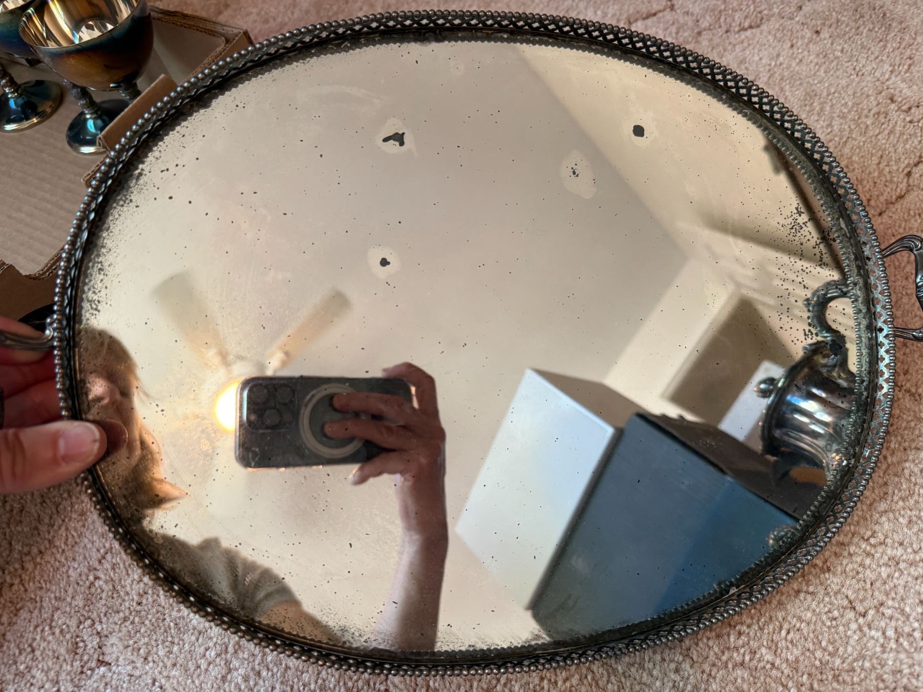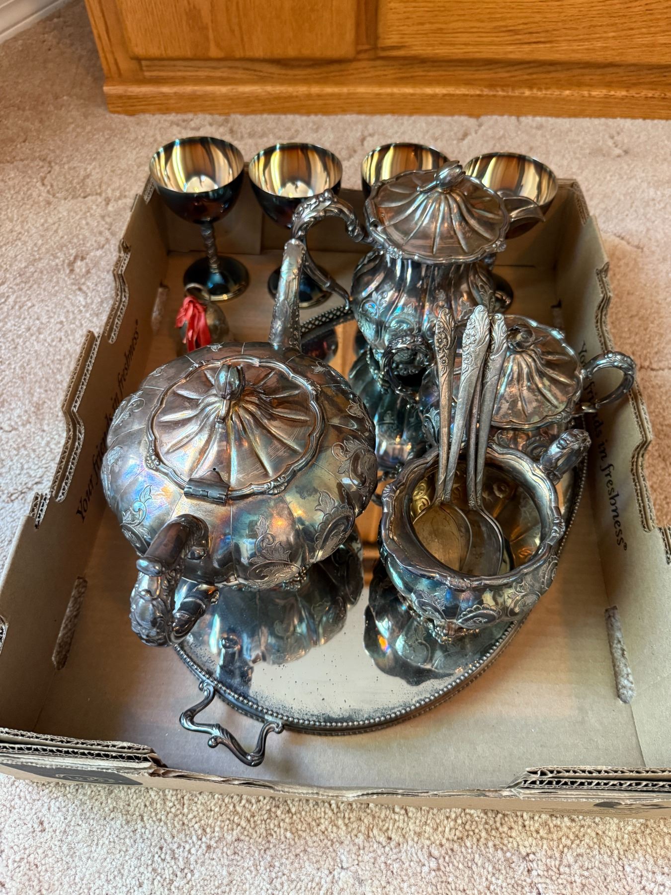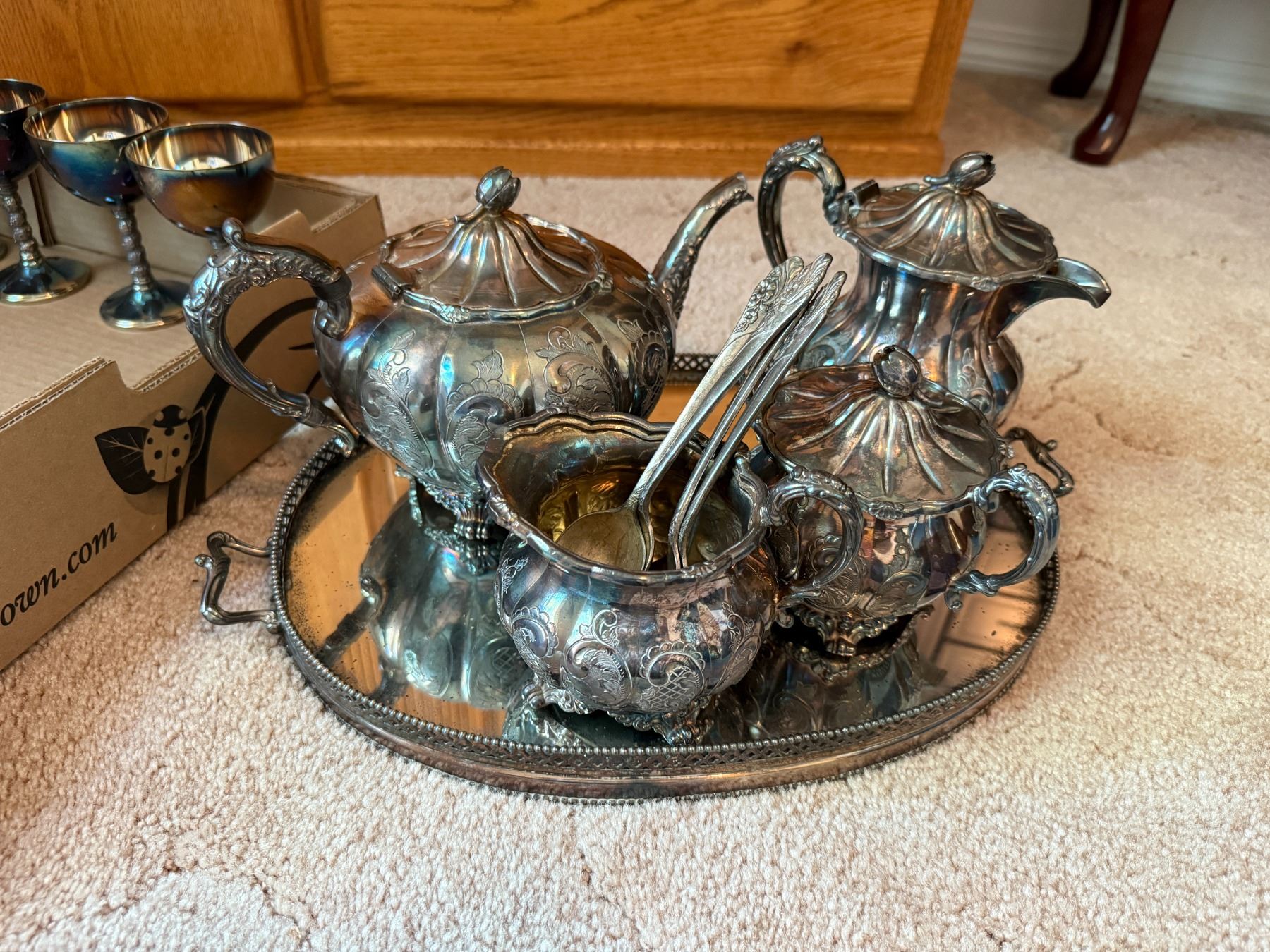 Tea set on mirrored tray - age marks, goblets, spoons. In bedroom 2.