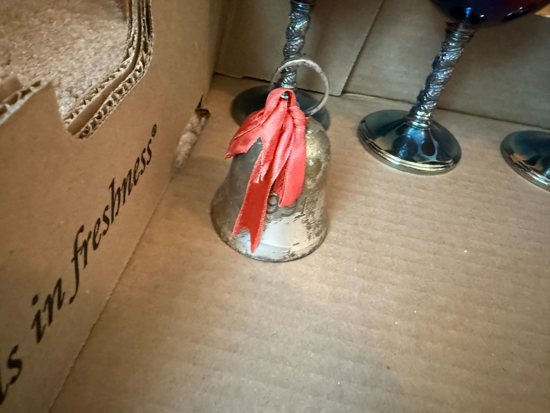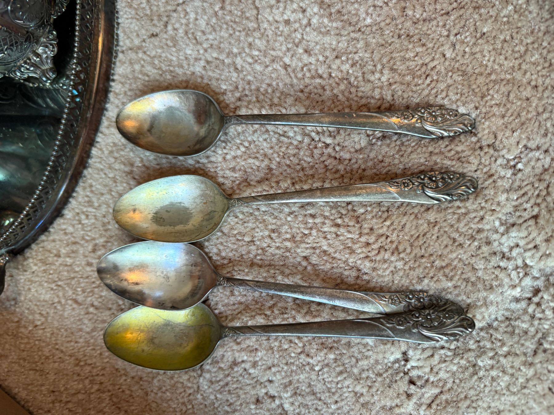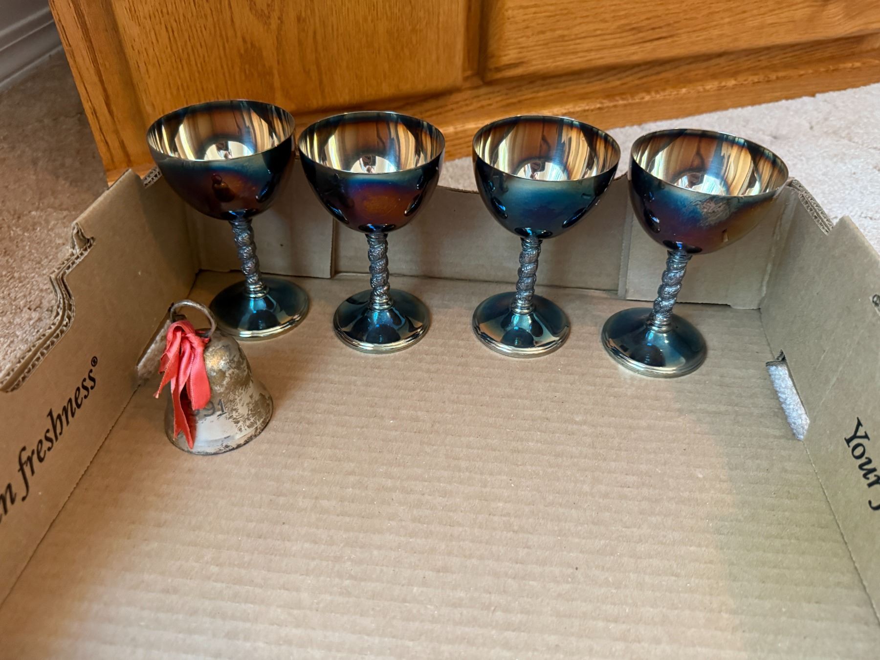 Tea set on mirrored tray - age marks, goblets, spoons. In bedroom 2.
