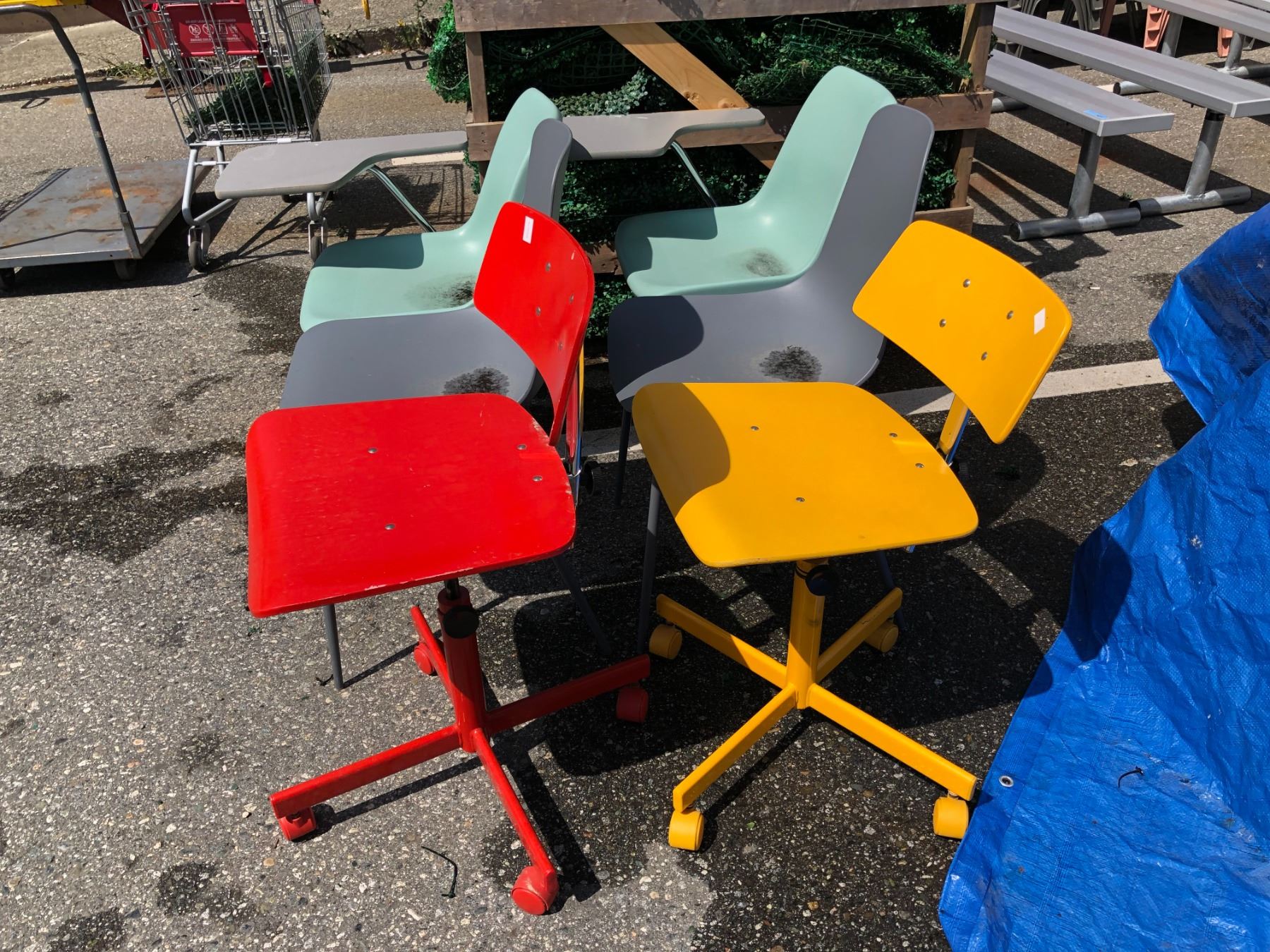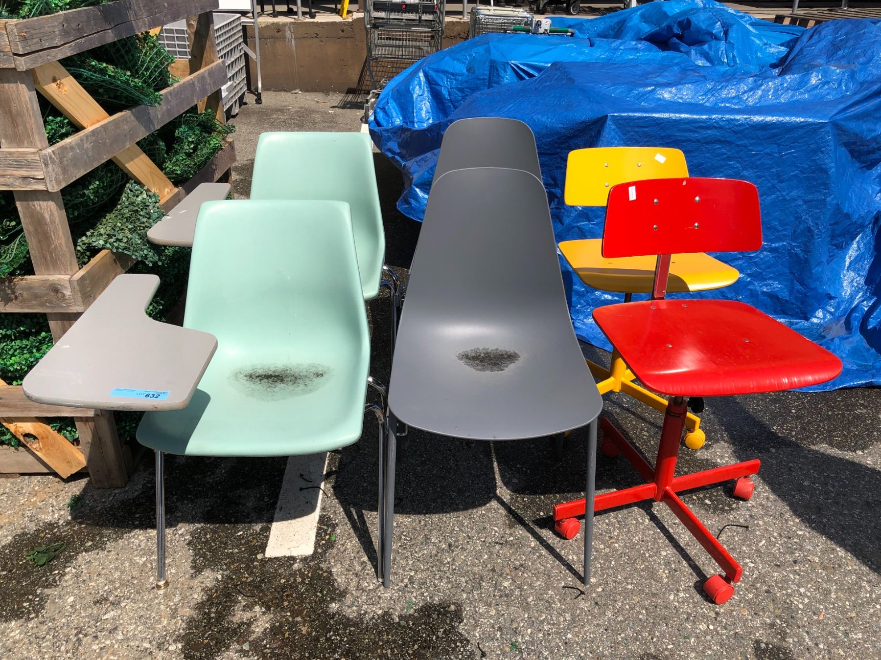 Six assorted chairs - 2 school desks & 2 scoop side chairs & 2 office chairs