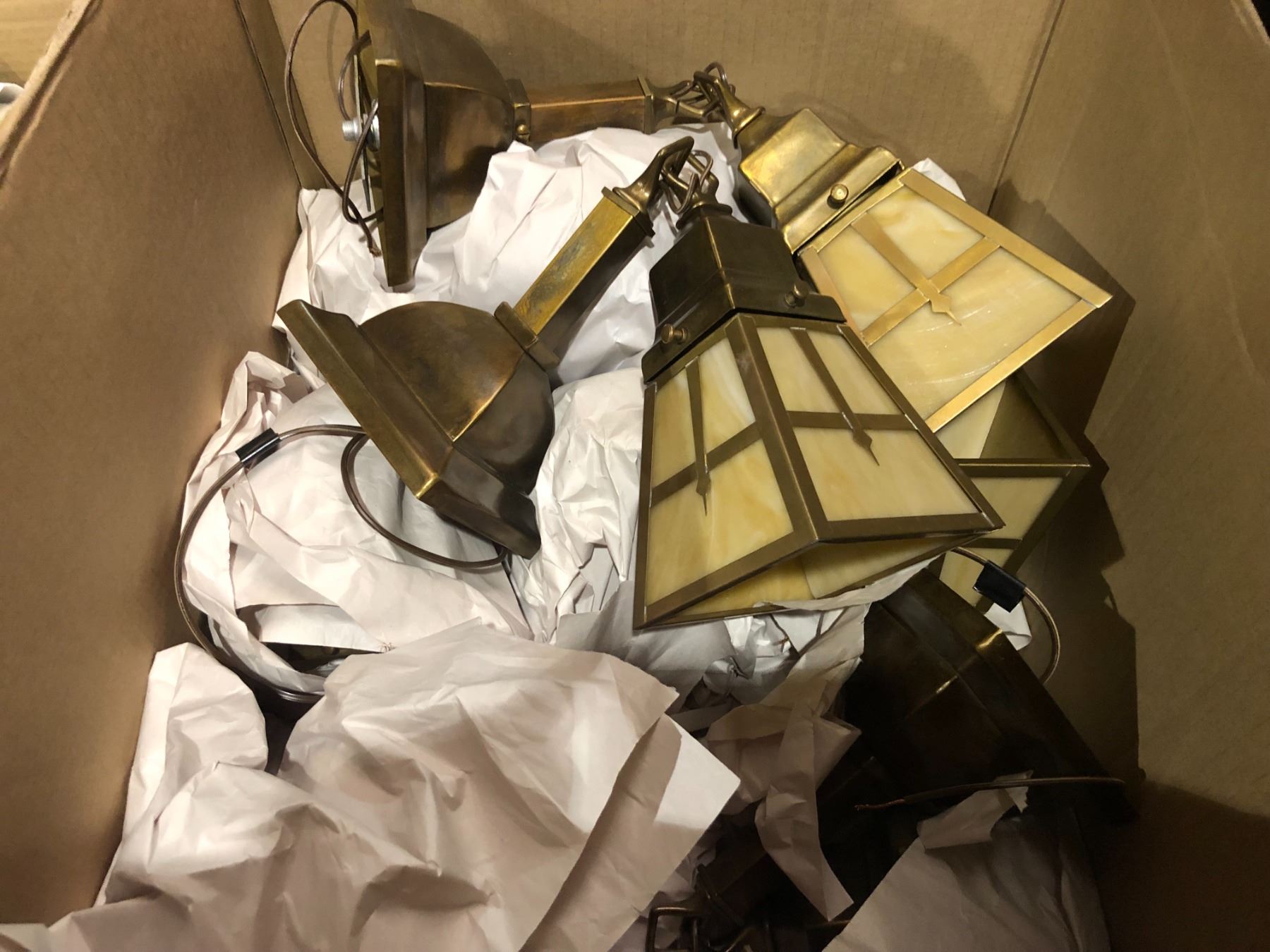 Six brass sconces light fixtures w/ slag glass shades from the love show
