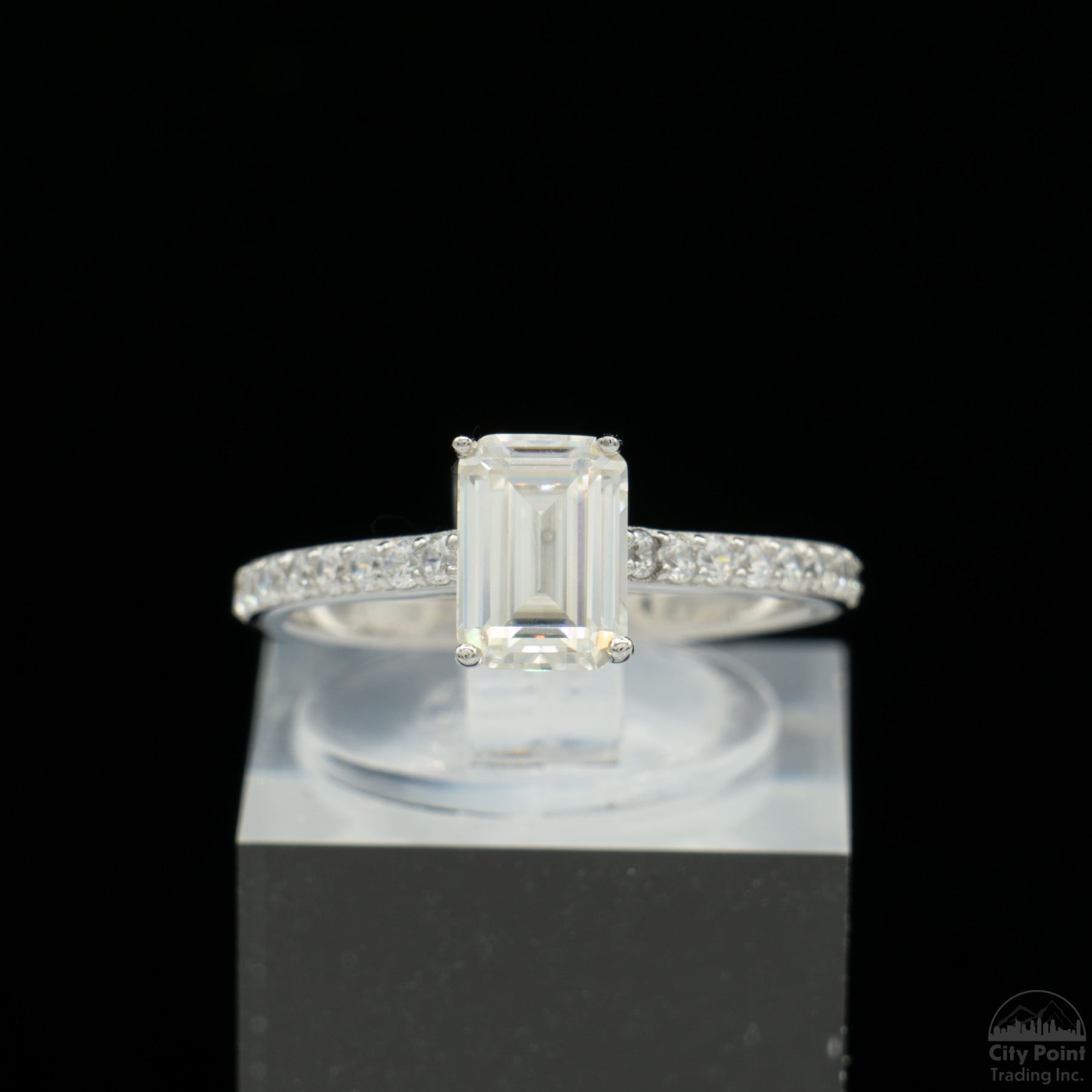 One stamped S925 sterling silver adjustable ring with a bright platinum-plated finish. The ring weighs 1.53 grams and is identified with markings of "S925." Containing: One prong-set emerald cut moissanite, approximately 1.00 carat. Condition is new. Comes with a box, pouch, and display box.