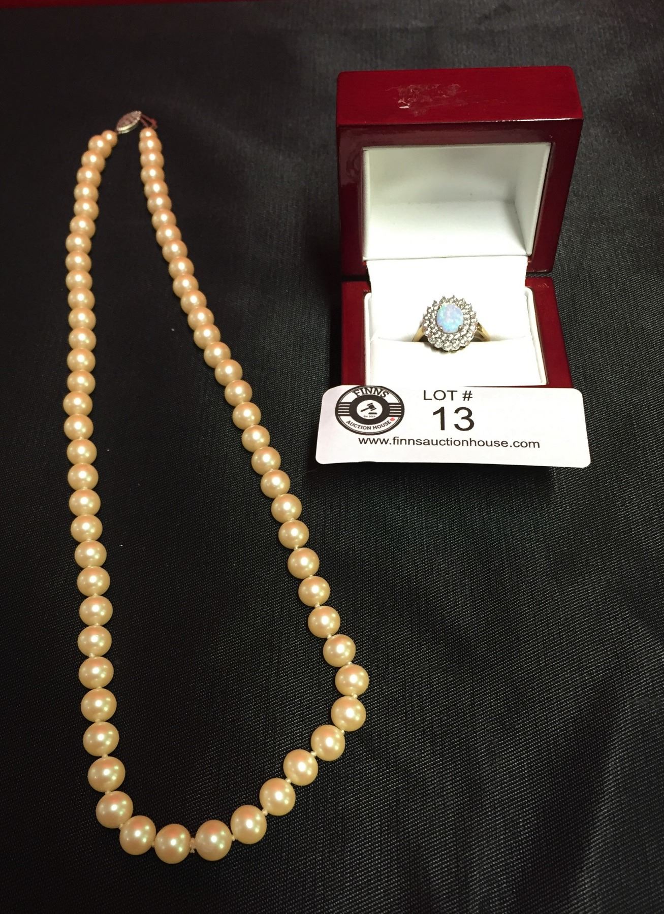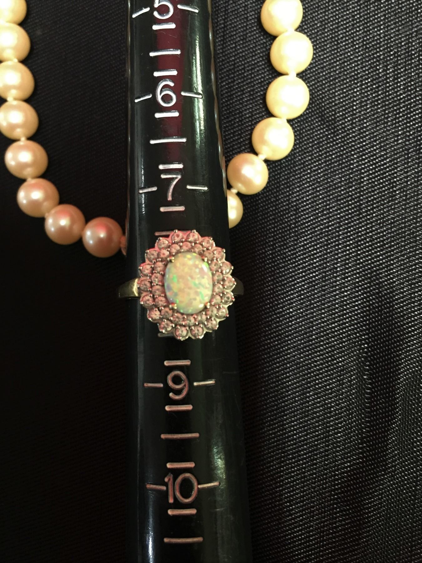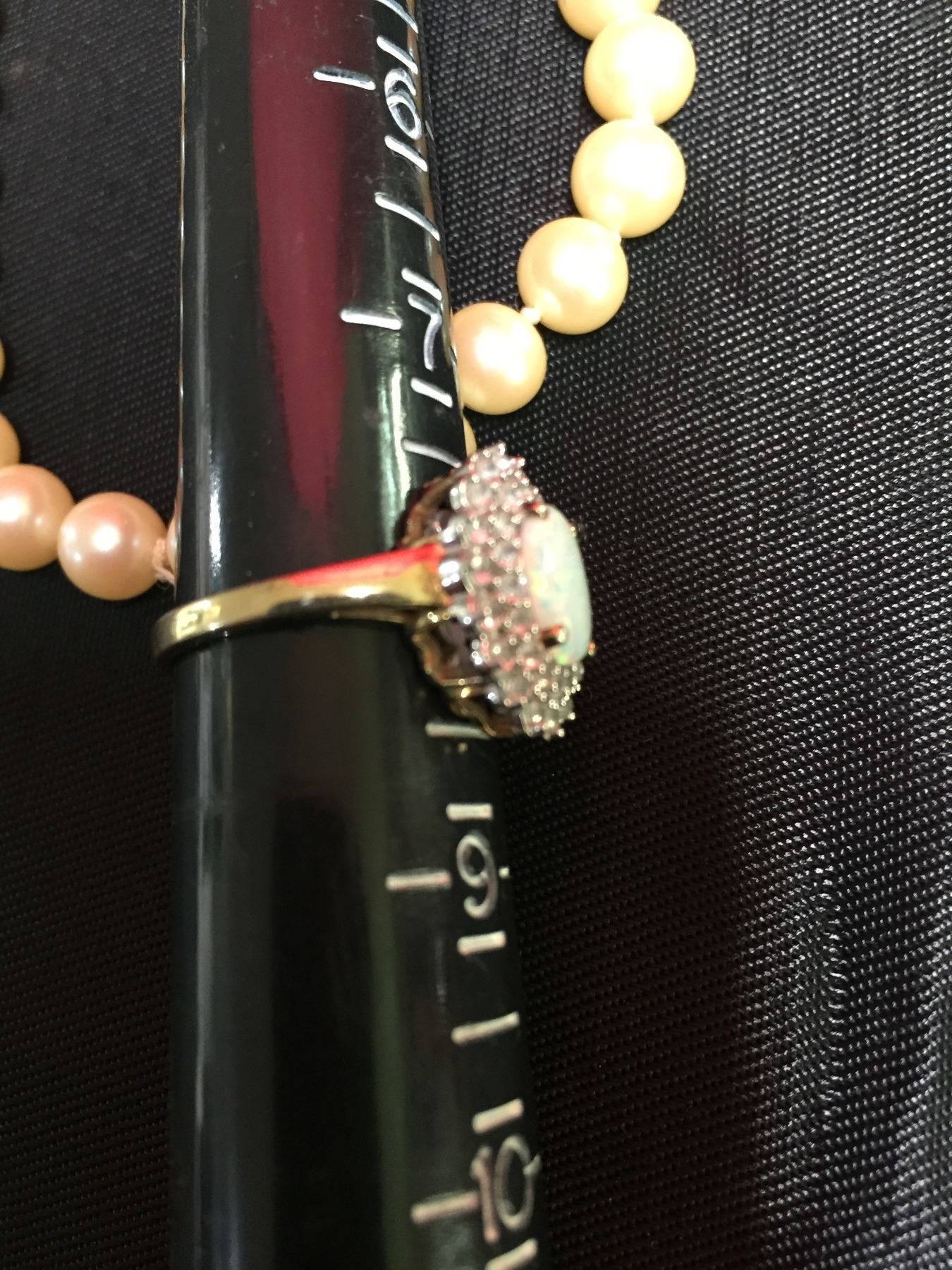 Size 8 Gold Plated Ring with Opal Stone and 22 inch Pearl Necklace