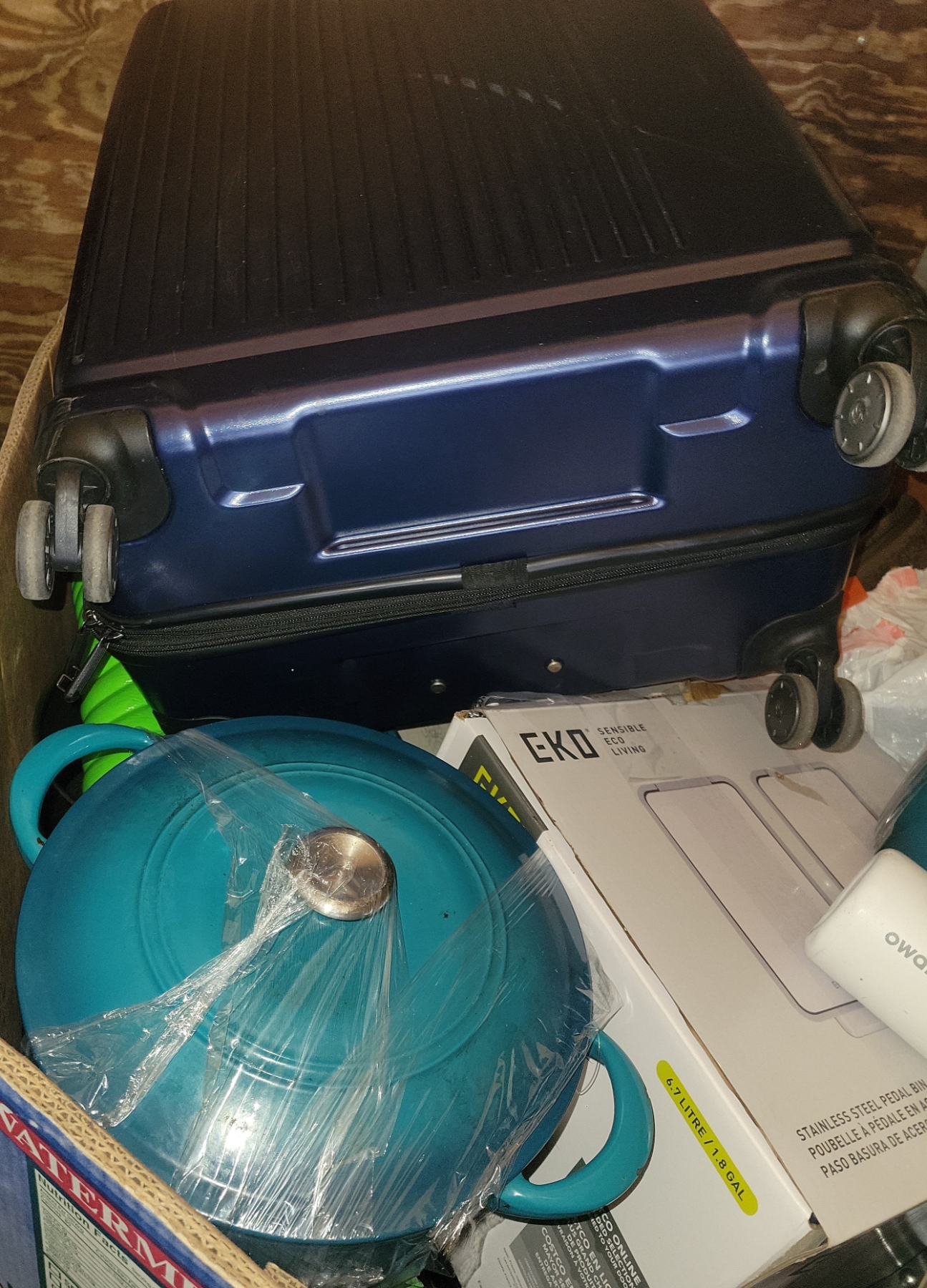 As is. Includes pot, suitcase and EKO stainless steel pedal bin.