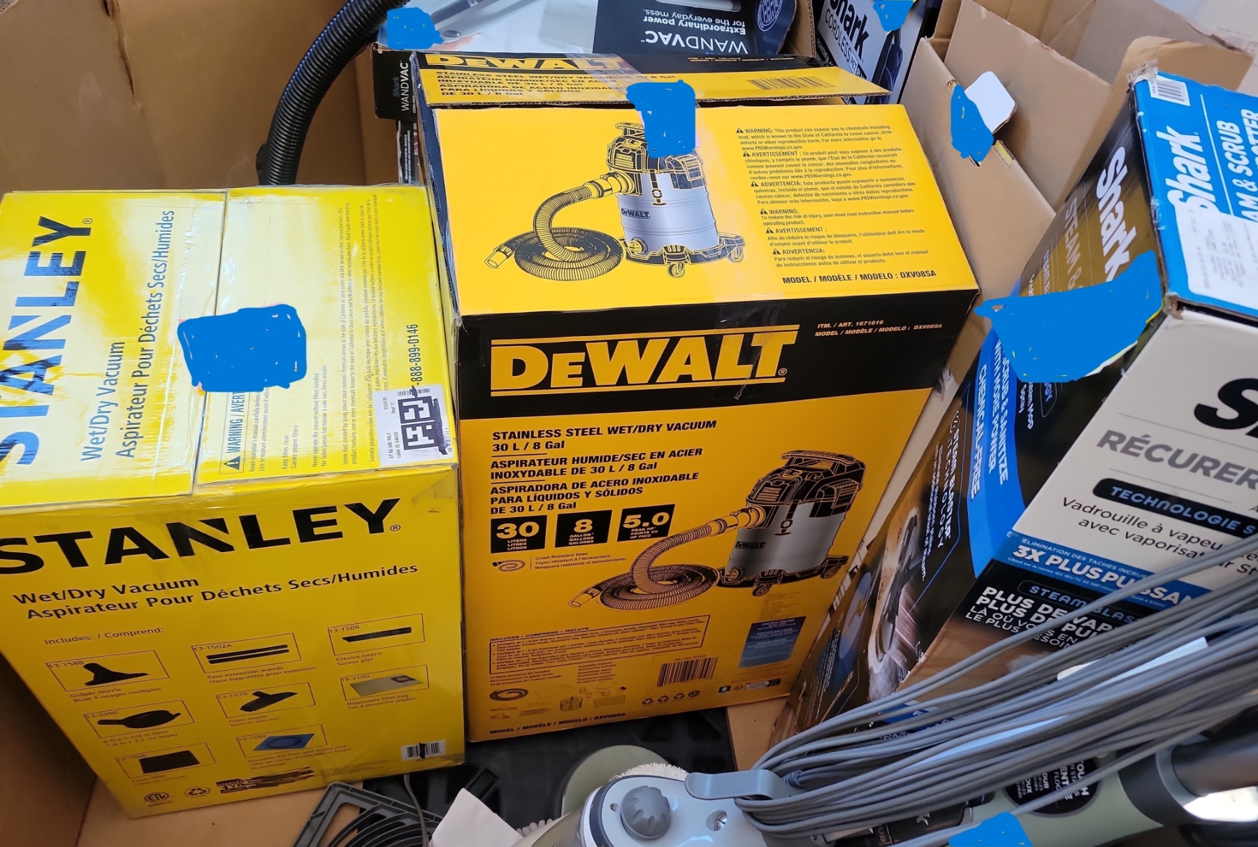 As is. Includes DeWalt stainless steel wet/dry vacuum and Stanley wet/dry vacuum.