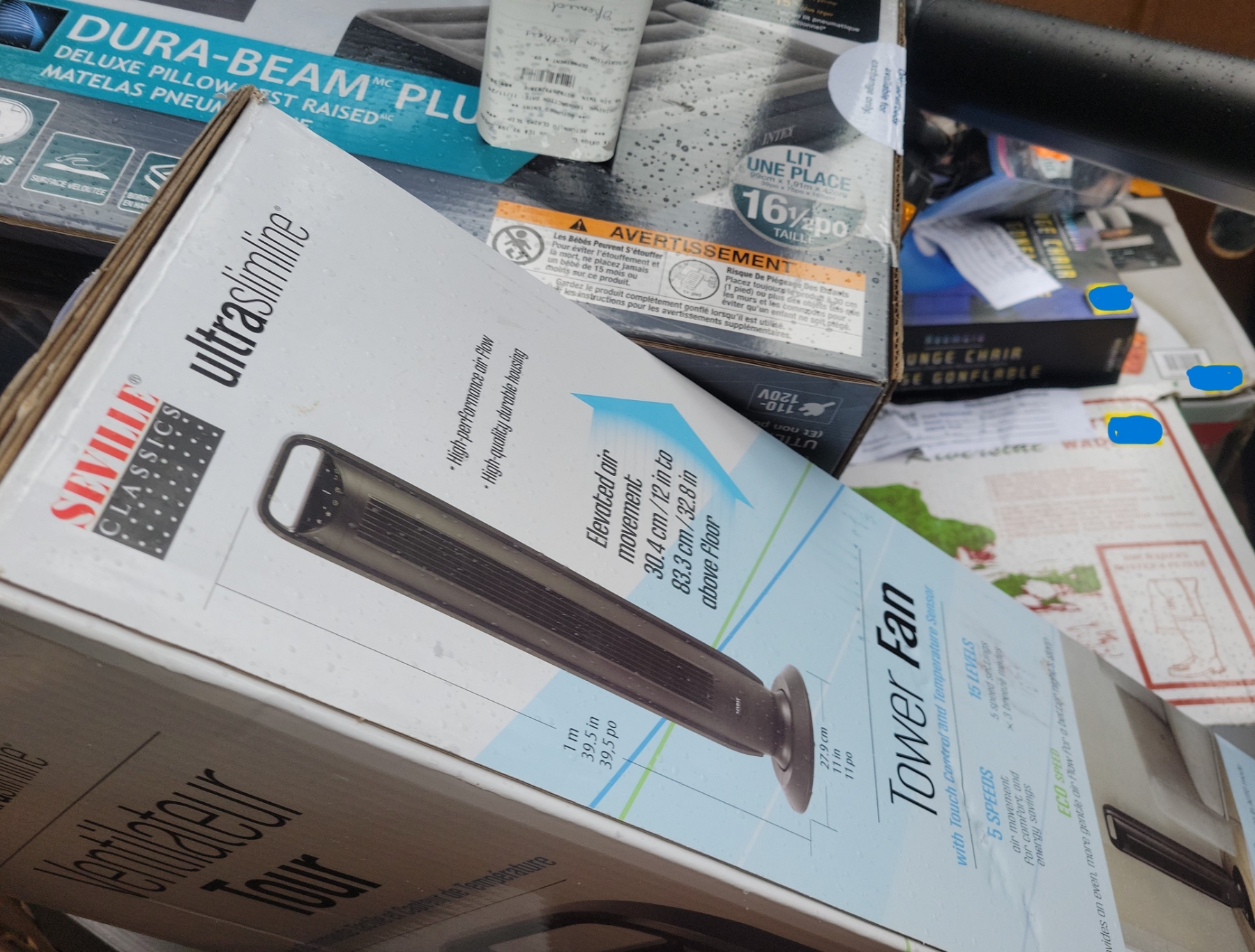 Customer returns. As is. Includes tower fan, inflatable air mattress.
