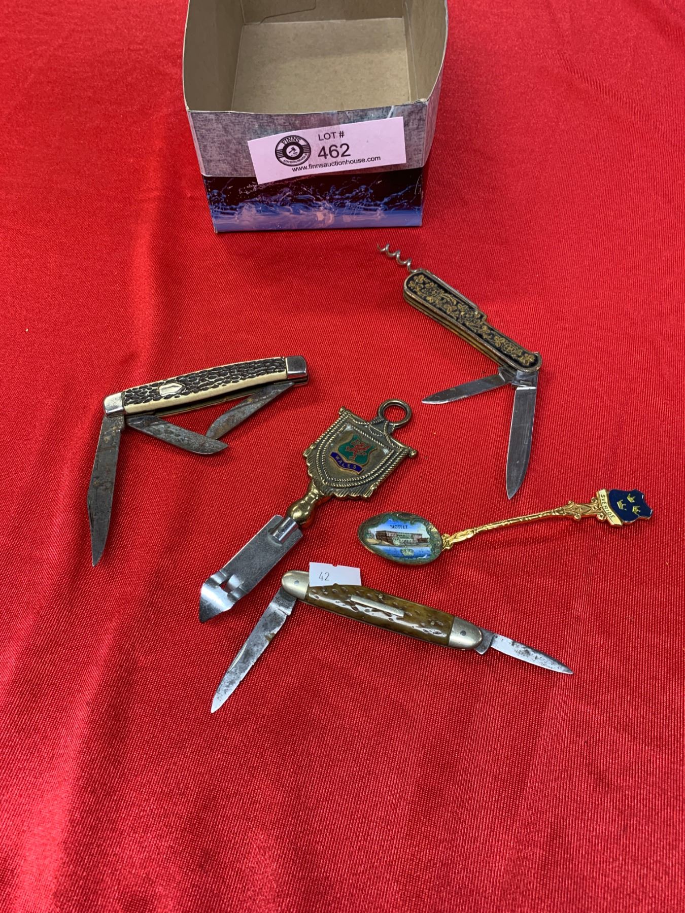 Small Lot of Pocket Knives, Souvenir Spoon, and a Wells Bottle Opener
