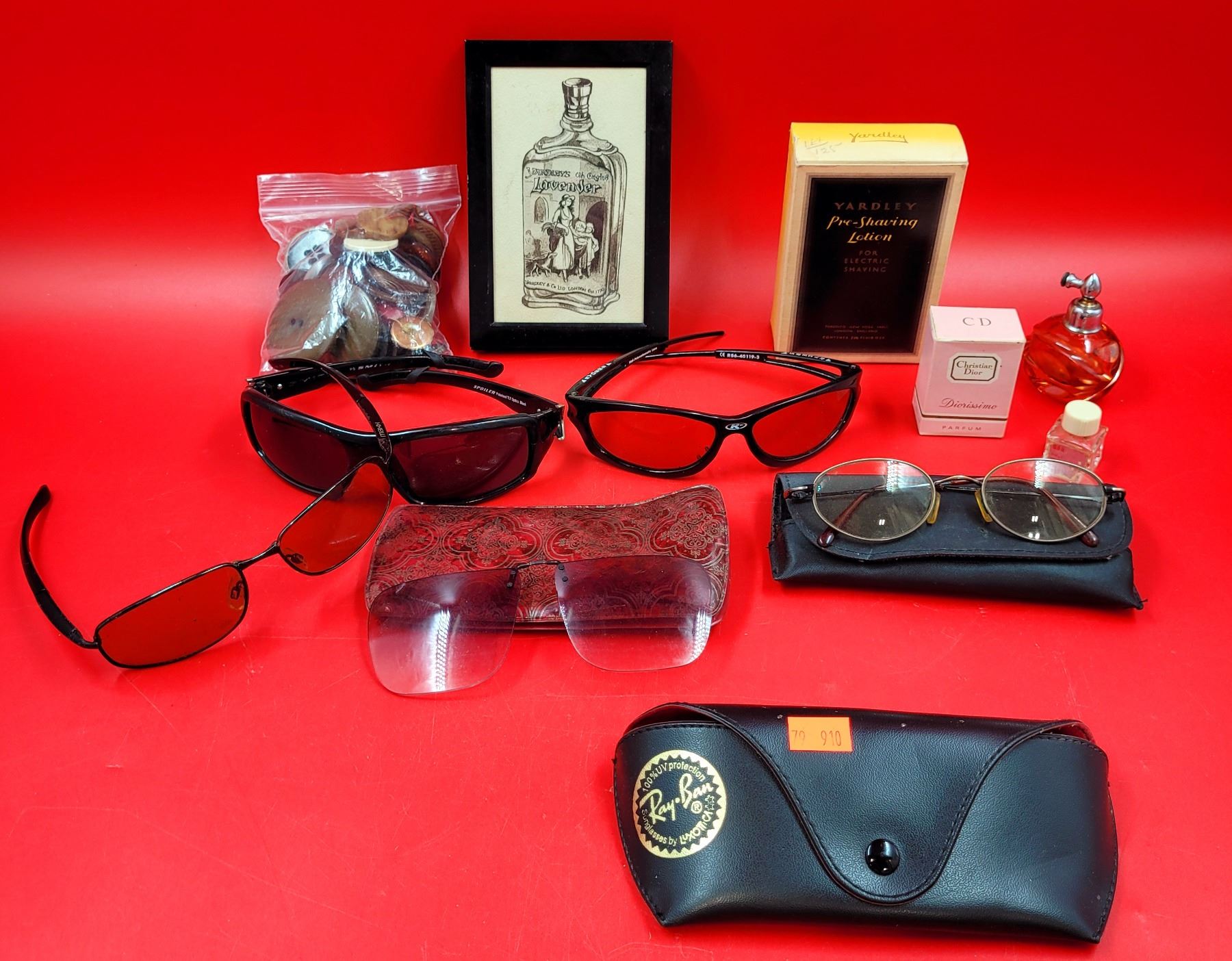 Smalls Lot w/ Perfume Bottles, Sunglasses, & VTG Bakelite Buttons