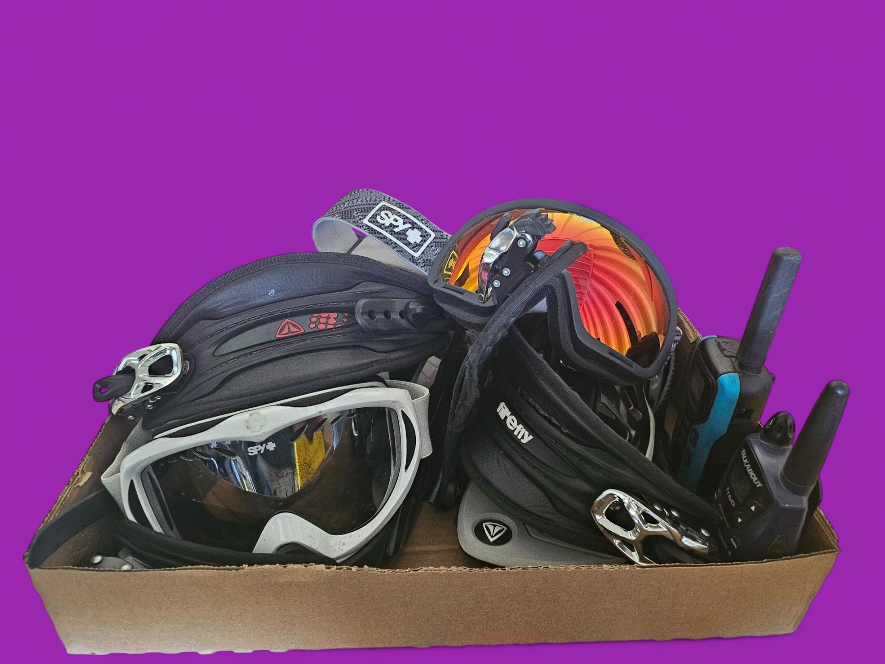 Snowoard Accessories, Firefly Bindings, two pair Spy goggles, and two communicator radios