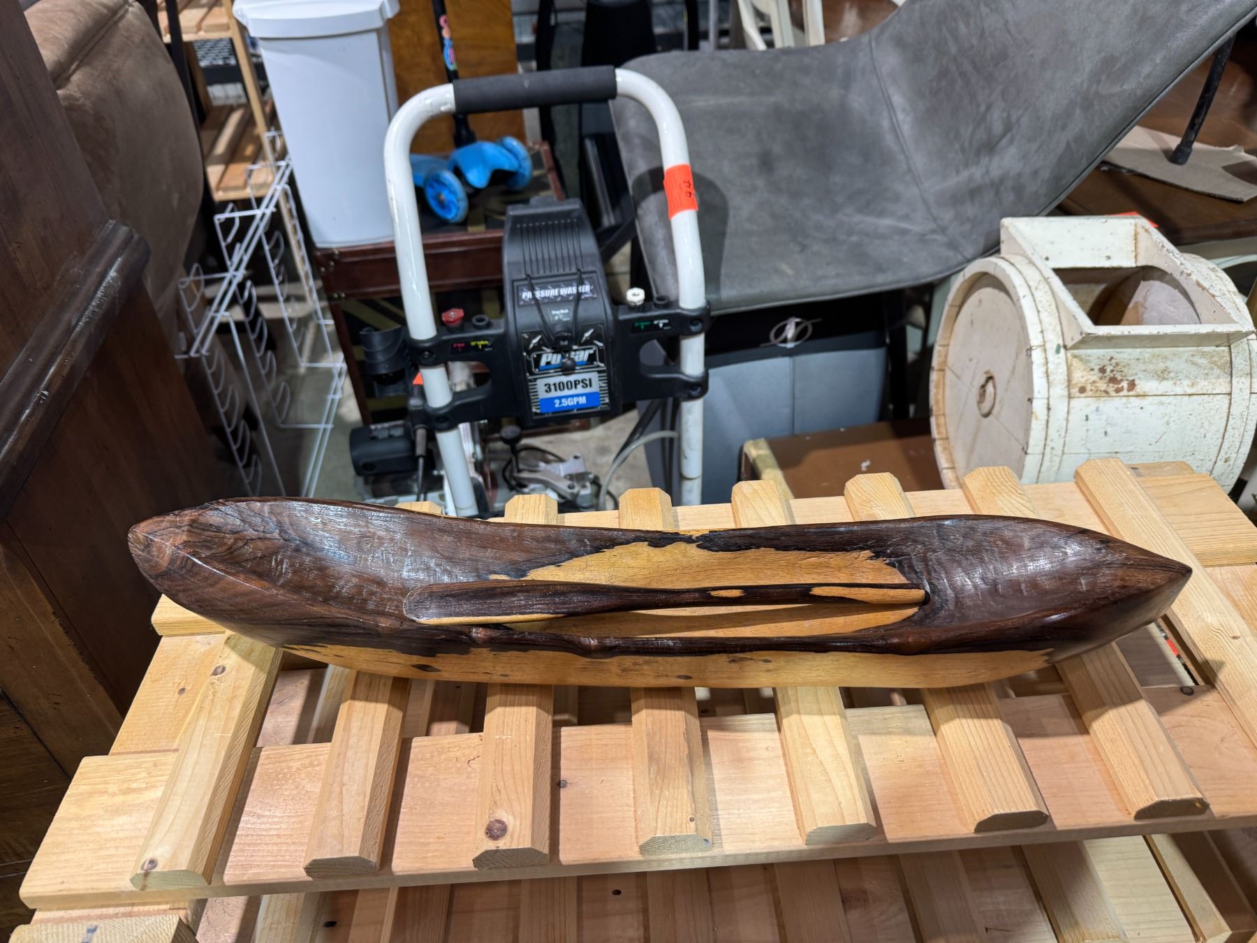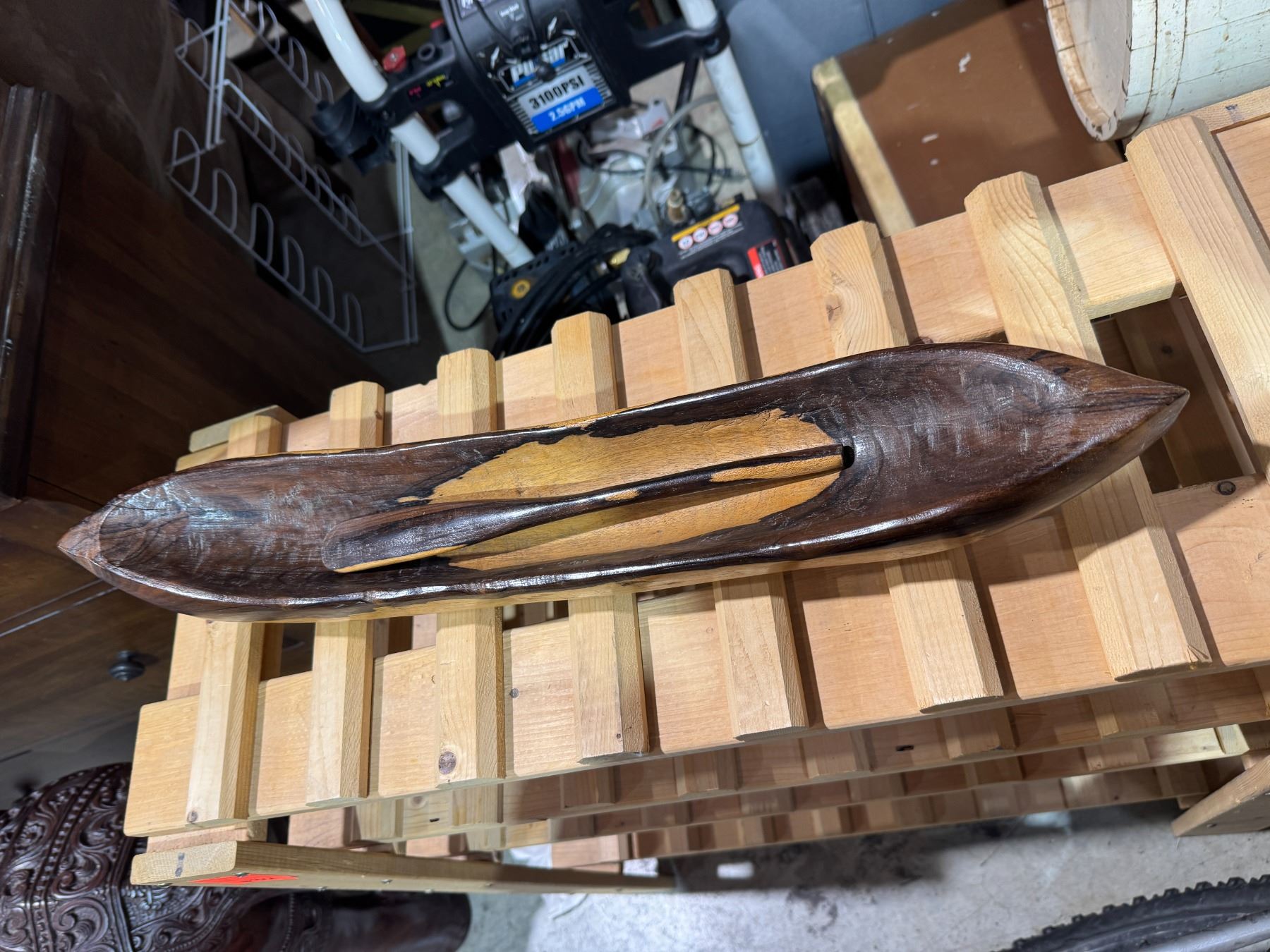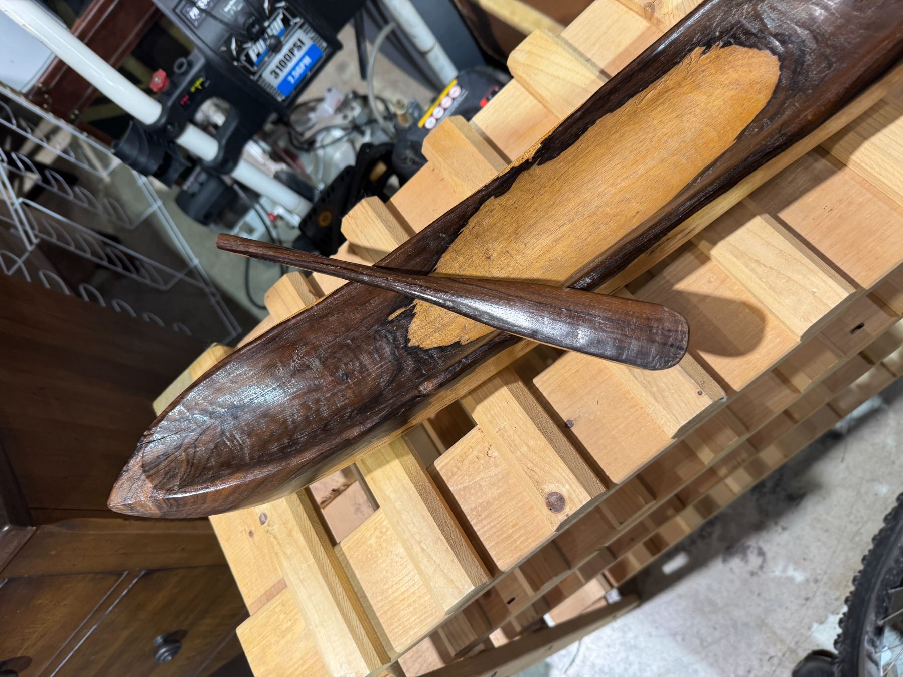 Solid wood canoe with paddle