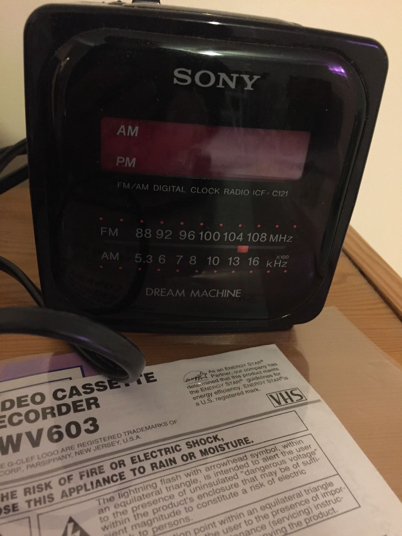 Sony short wave radio model crf 220 untested. Crate of records 45 & albums, Magnovox video player CMWv405 untested. Emerson video player model EWV603 untested, Sony Dream Machine untested. Cabinet 18x13x10. metal record album rack and more. Come to pickup at Category C time slot, (11:00 - Noon)