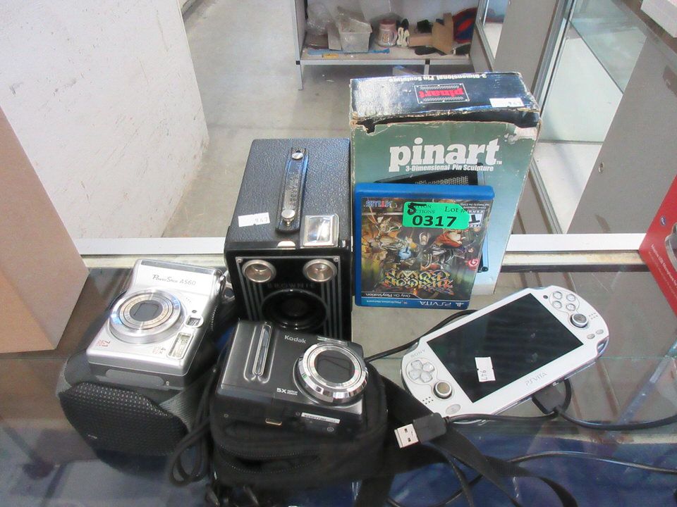 Vintage Brownie box camera, Kodak digital camera and a Canon PowerShot A560.