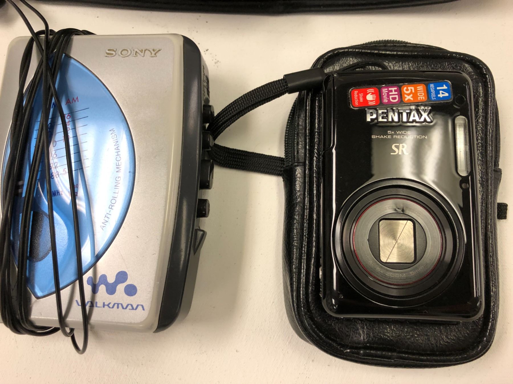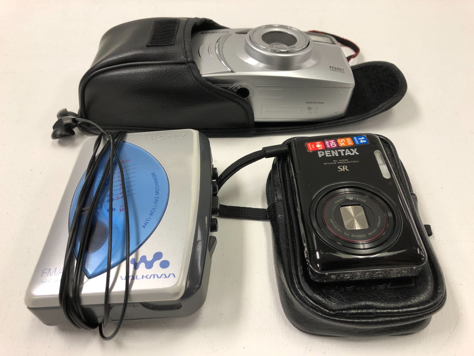 Sony walkman/ Pentax digital camera & polaroid 35mm film camera