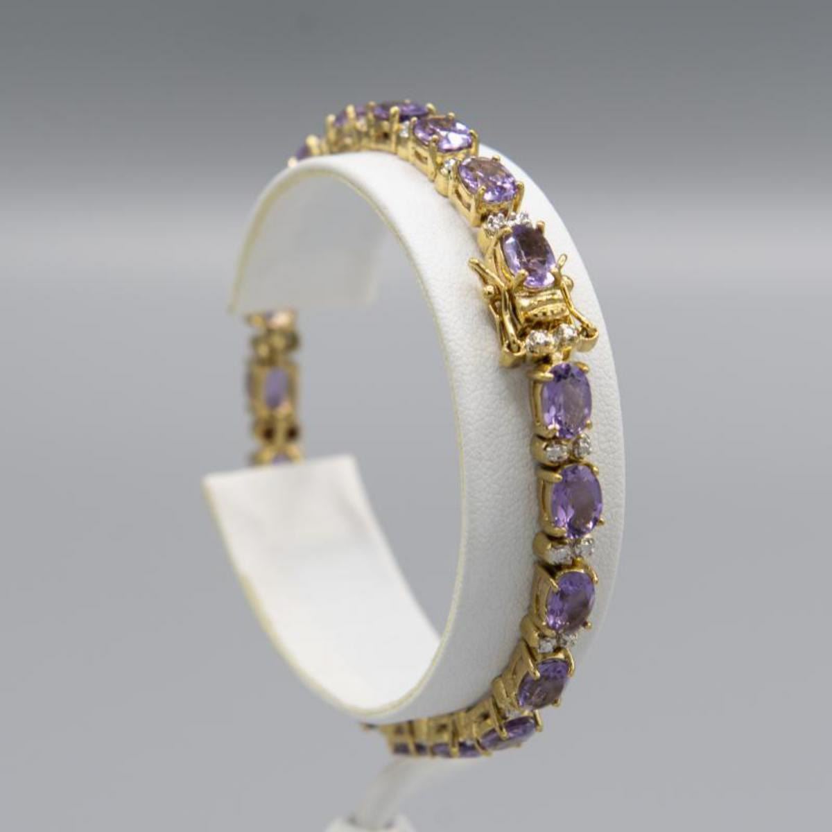 Sparkling 9.08 Ct Amethyst And Diamond Bracelet. The Bracelet Features 20 Pieces of Genuine 6 x 4 mm. Faceted Oval Cut Amethysts Complimented By Four 1.1 mm. Natural Round Cut Diamonds.Color: I-J & Clarity: I2-I3 . No treatment.The Amethyst and Diamonds Are Mounted In 18 Kt Gold Overlay.Bracelet length is approx 7 1/2 inches.The Bracelet Is Weighs Approx 75 Cttw or 15 Total Grams. Absolutely Gorgeous !