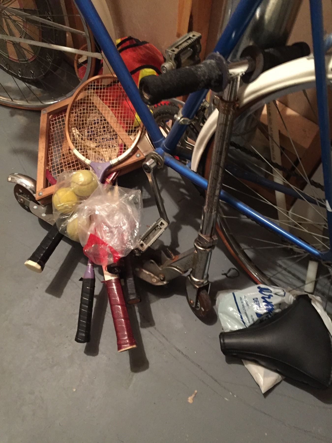 Vintage racing bicycle, fishing rods & reel, tennis rackets, tennis balls, dart board, bike rack and more. Bring packing materials. Come to pick up at Category A time slot, (9:00 am to 10:00 am)