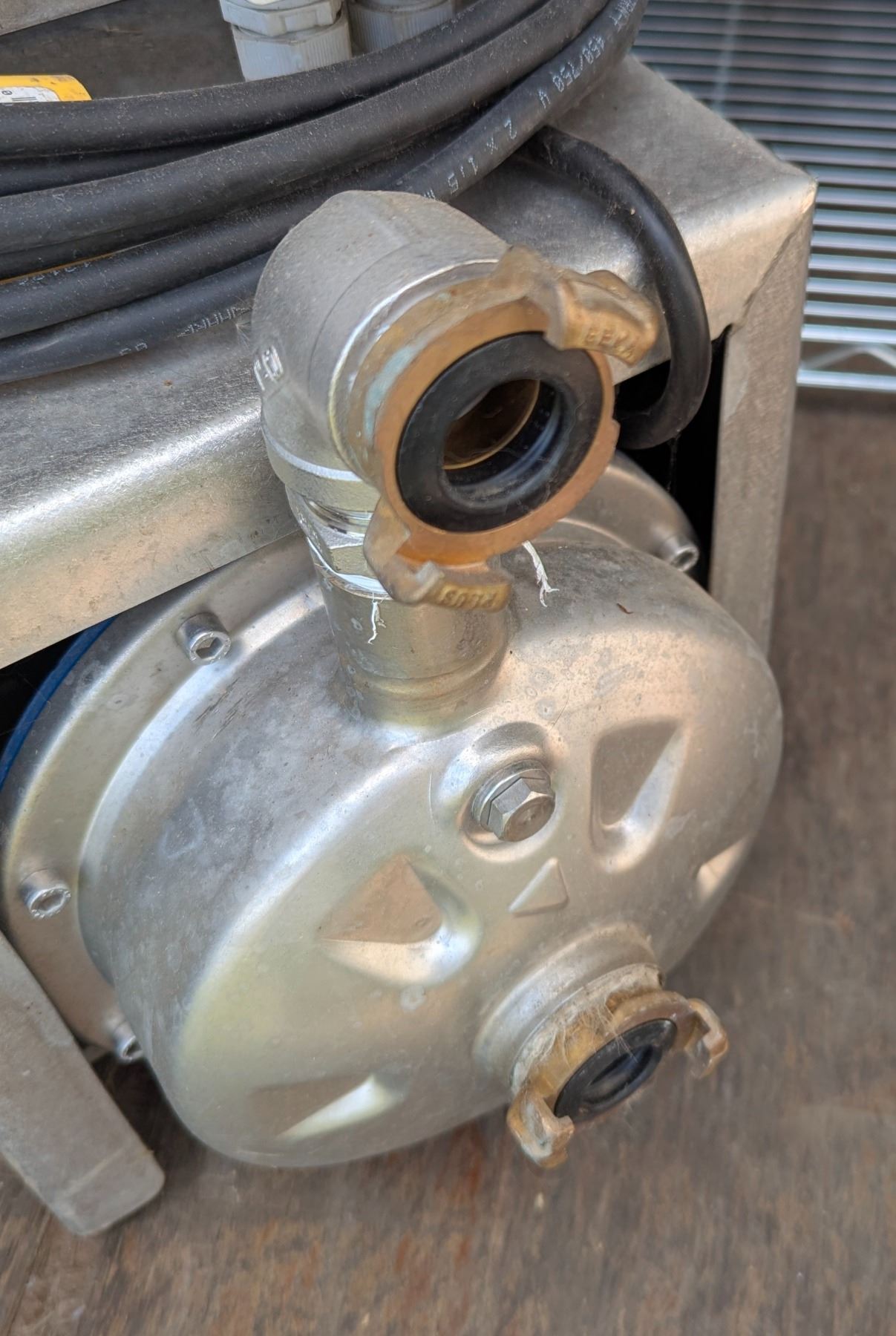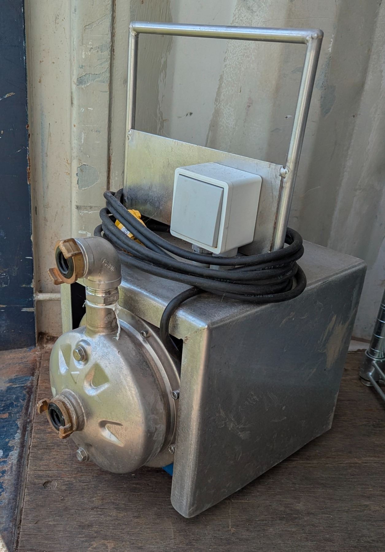 Stainless steel transfer pump for processing. Stainless washdown cover. Glad hand hook ups but can easily be changed to your fitting type. 15amp 220V wiring, but also can be changed by an electrician.
