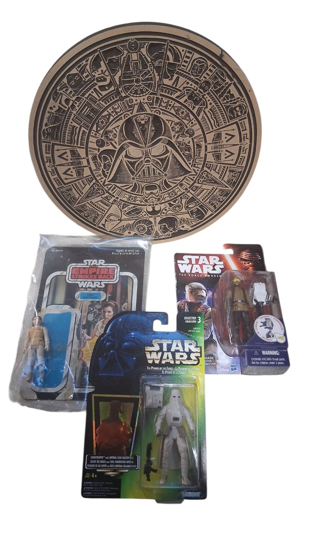 Star Wars lot inc. 3 figures & wooden custom CNC'd plaque 12" dia