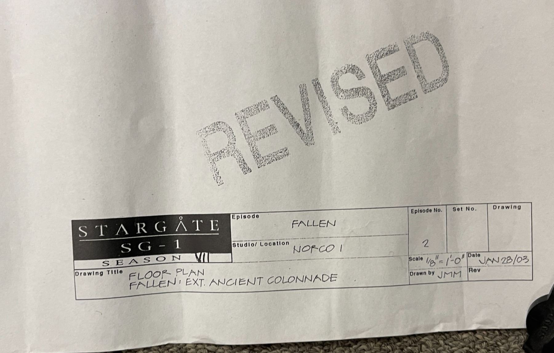 "Stargate SG-1" - Group of 4 set drawings - includes 3 Season 6 Episode #1G Fragile Balance, Location Bridge Studios Stage 6 Loki's Lab & Season VII Episode #2 Fallen Norco I Location Floor Plan Fallen EXT. Ancient Colonnade