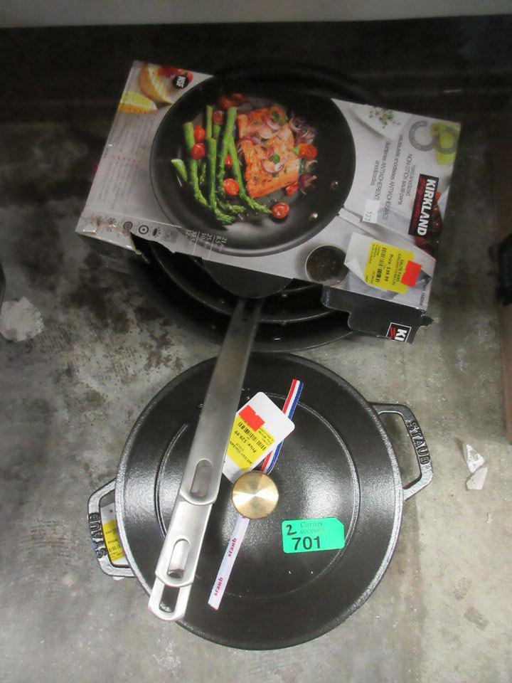 1 Quart Staub pan is lidded. Kirkland brand non-stick pans. Customer returns.