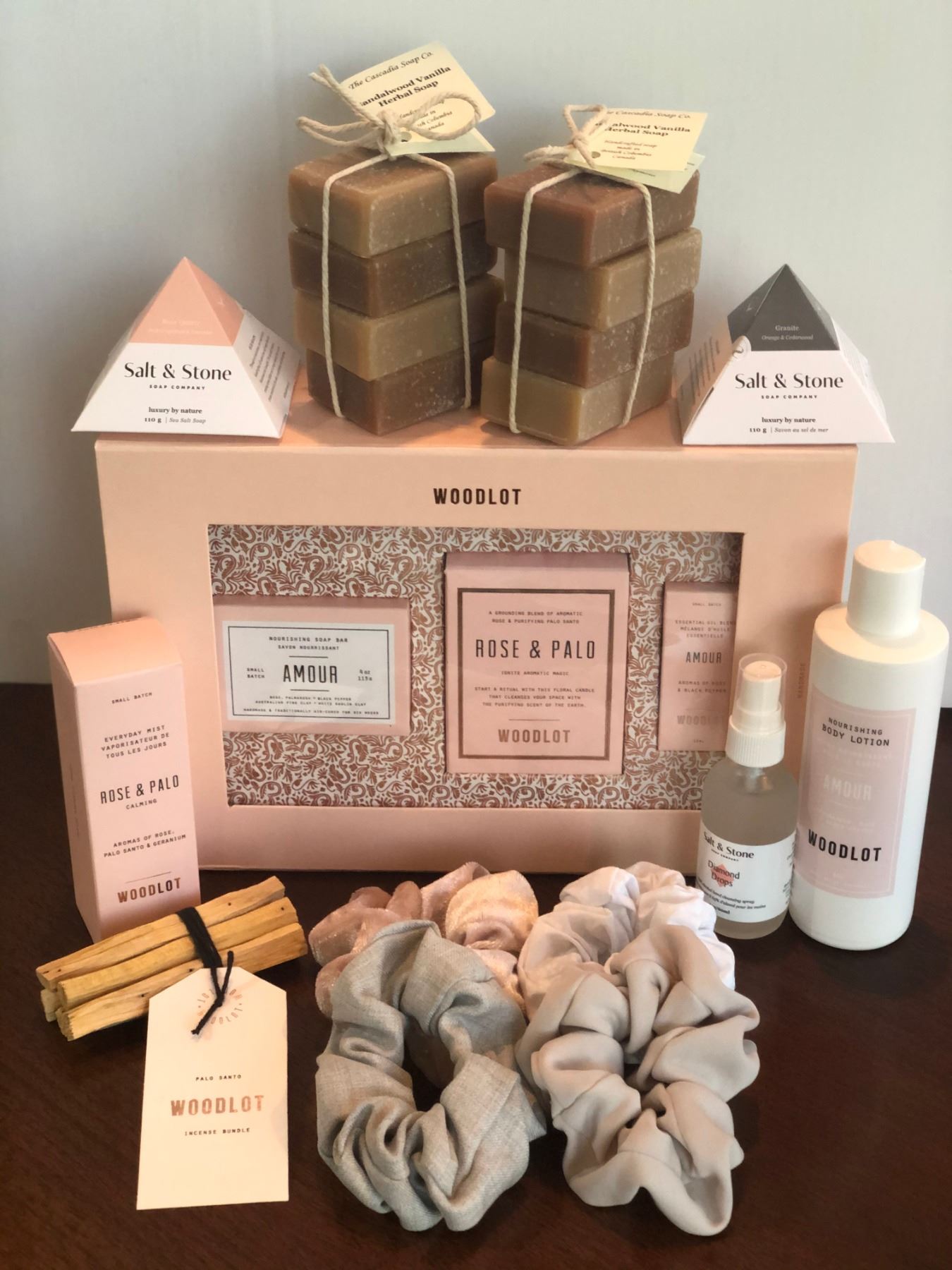Includes: One $100 Gift Card to Ativo Skin Care, four handmade scrunchies from Top Knotz by Romea Cristina, one David’s Tea Gift Basket (Sachet Wheel, XL tea latte mug, perfect tea ball, iconic tin, perfect spoon), one Woodlot Gift Basket (8 oz Rose & Palo Santo Candle, 4 oz Amour Soap Bar & Amour Essential Oil Blend, 8 oz Amour Lotion, 2 oz Rose & Palo Mist & Palo Santo Incense Bundle), one Salt & Stone Gift Basket (Diamond Drops, Granite sea salt soap, Rose Quartz sea salt soap) & two soap bundles from Cascadia Soap Co.