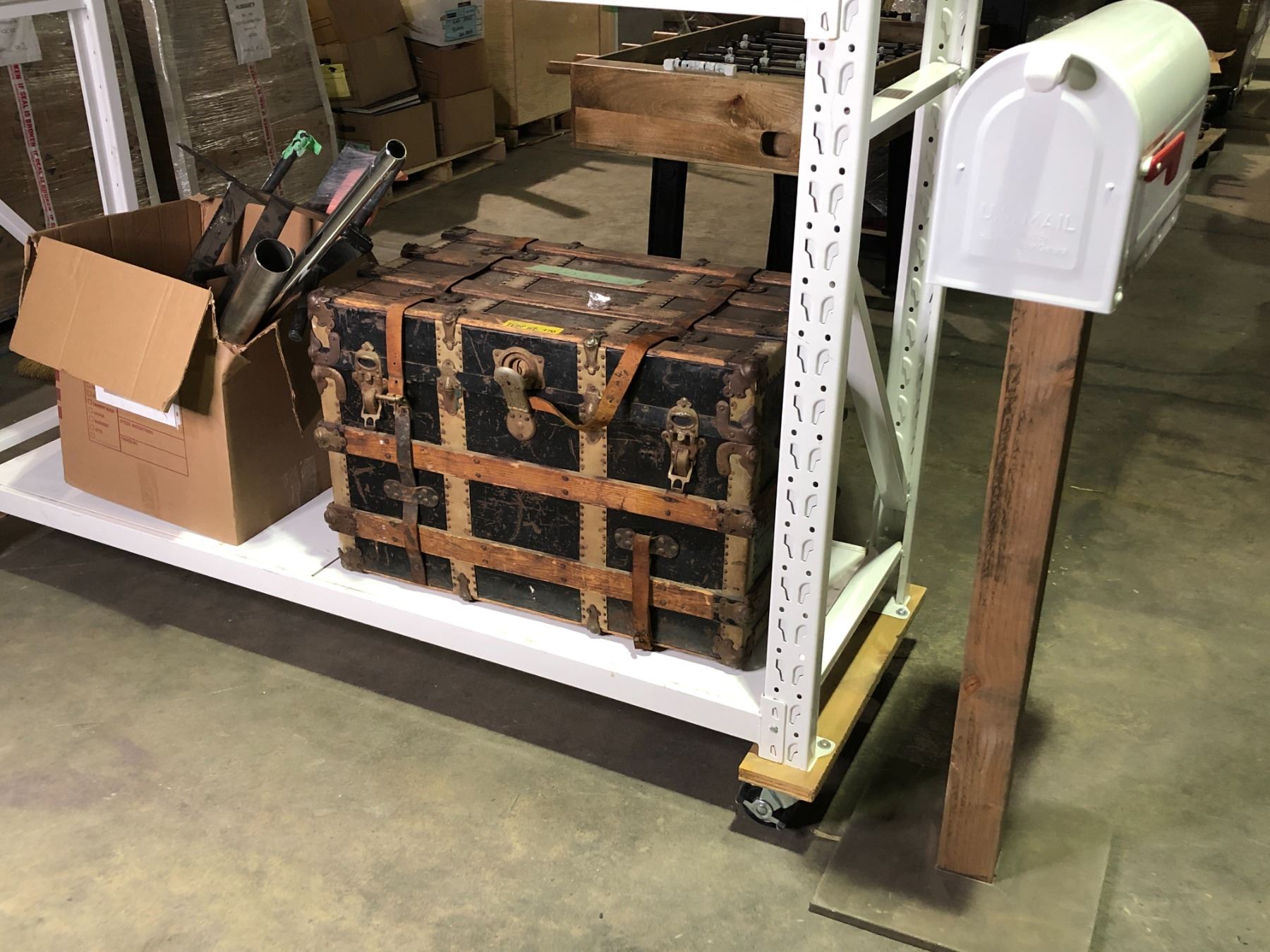 Steamer trunk (32in wide x 18 1/2in depth x 22in height) w/ metal mailbox and stand/ box of misc.