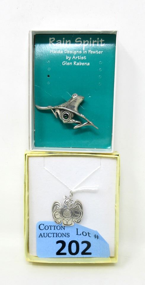 Haida Rain Spirit Frog Brooch measures 2" x 1" tall and First Nations Sterling Eagle measures 1" diameter.