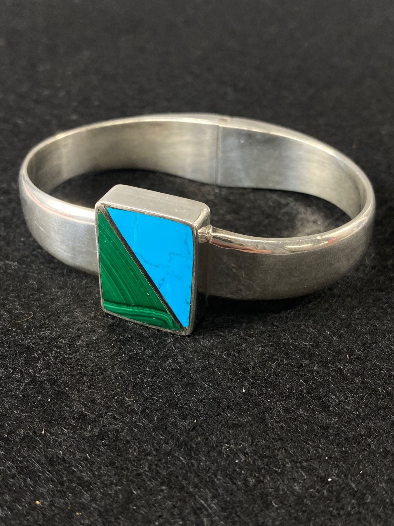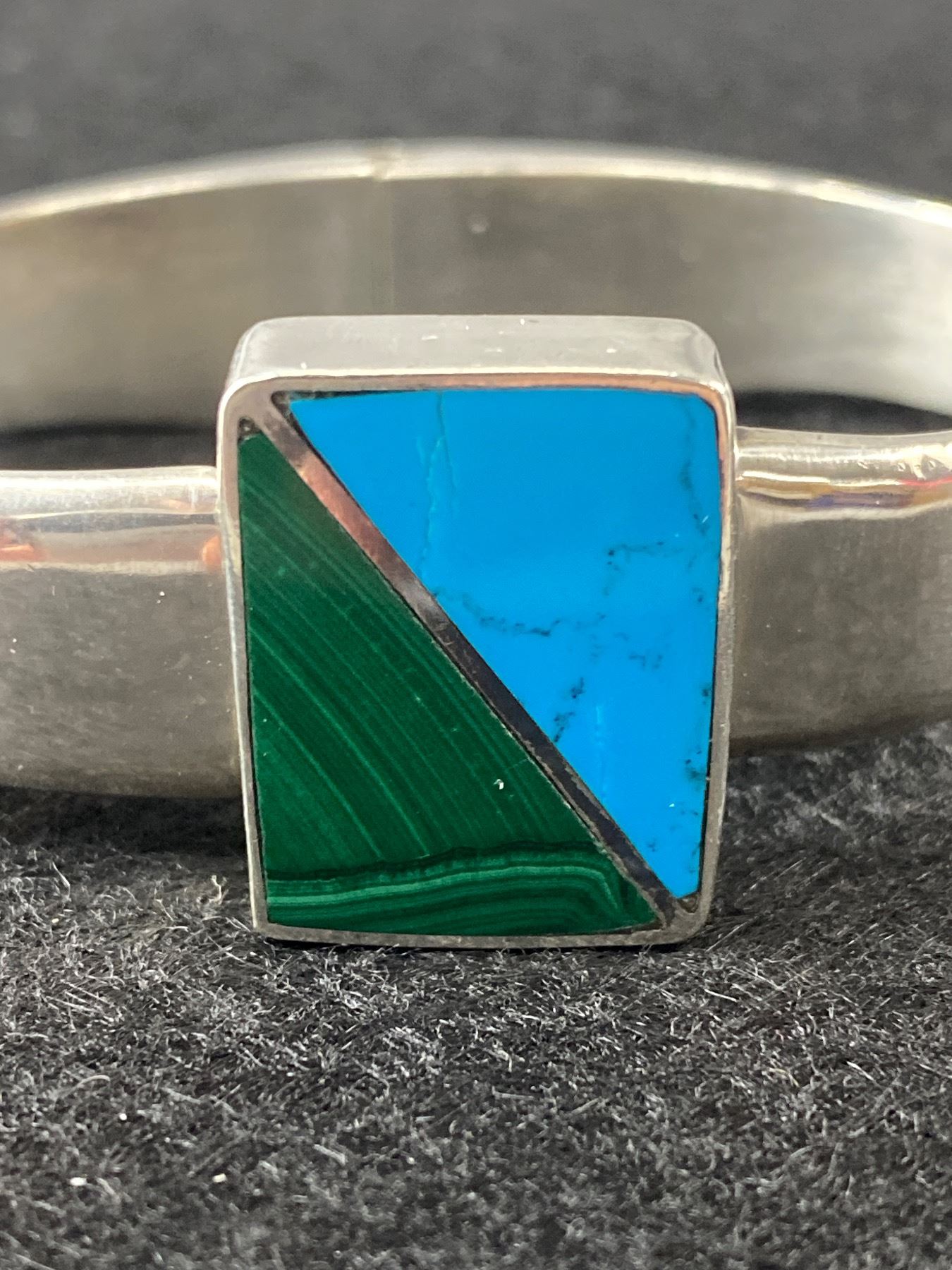 Sterling Silver 925 Mexico TL-63 Turquoise Malacite Hinged Bracelet 58.7 Grams - Marked & Tested