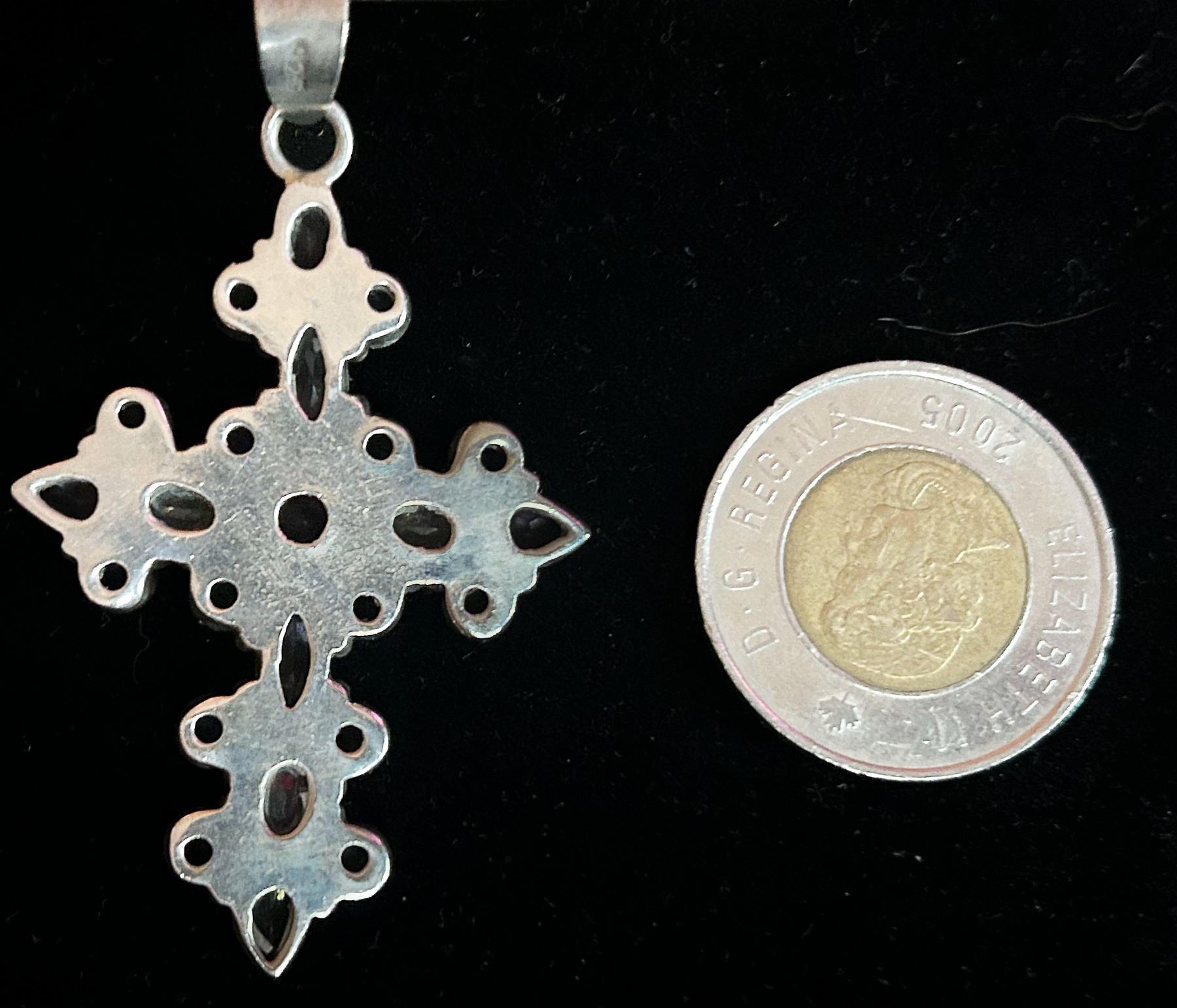 rnate sterling silver cross pendant set with an array of faceted semi-precious stones, including peridot, amethyst, garnet, and citrine (unverified). Stamped 925 on the bail. Pendant only—chain and toonie shown for scale, not included.