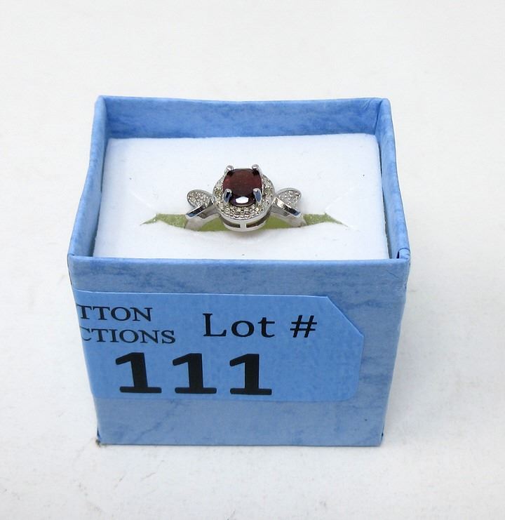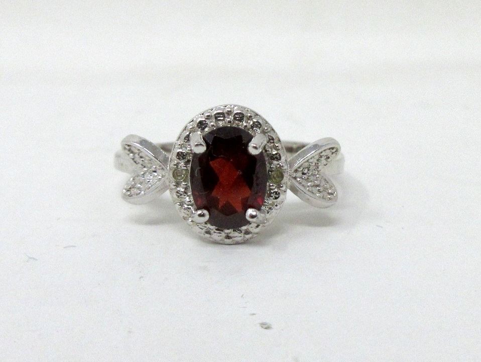 Oval cut garnet with 2 round side diamonds. Retail value $320.