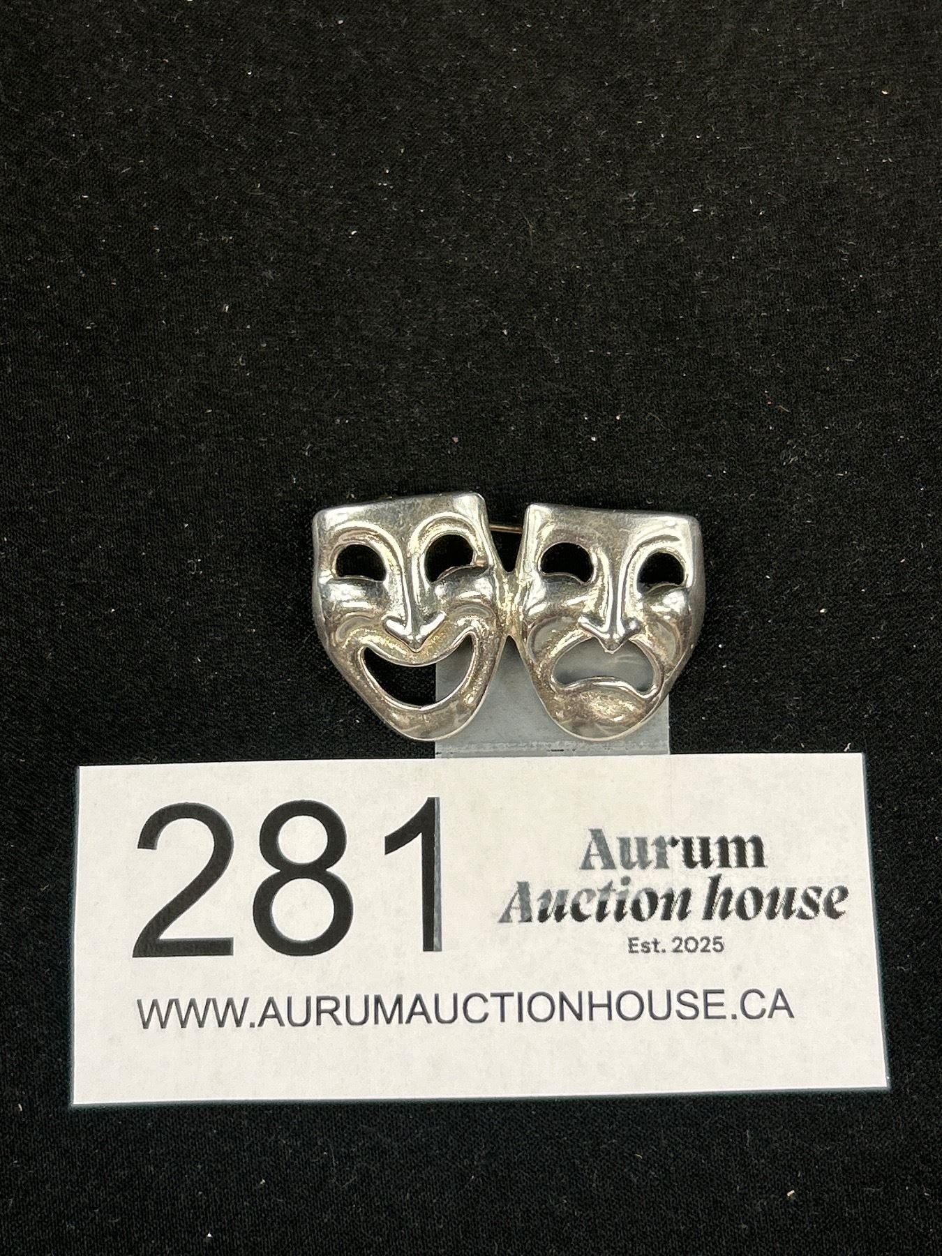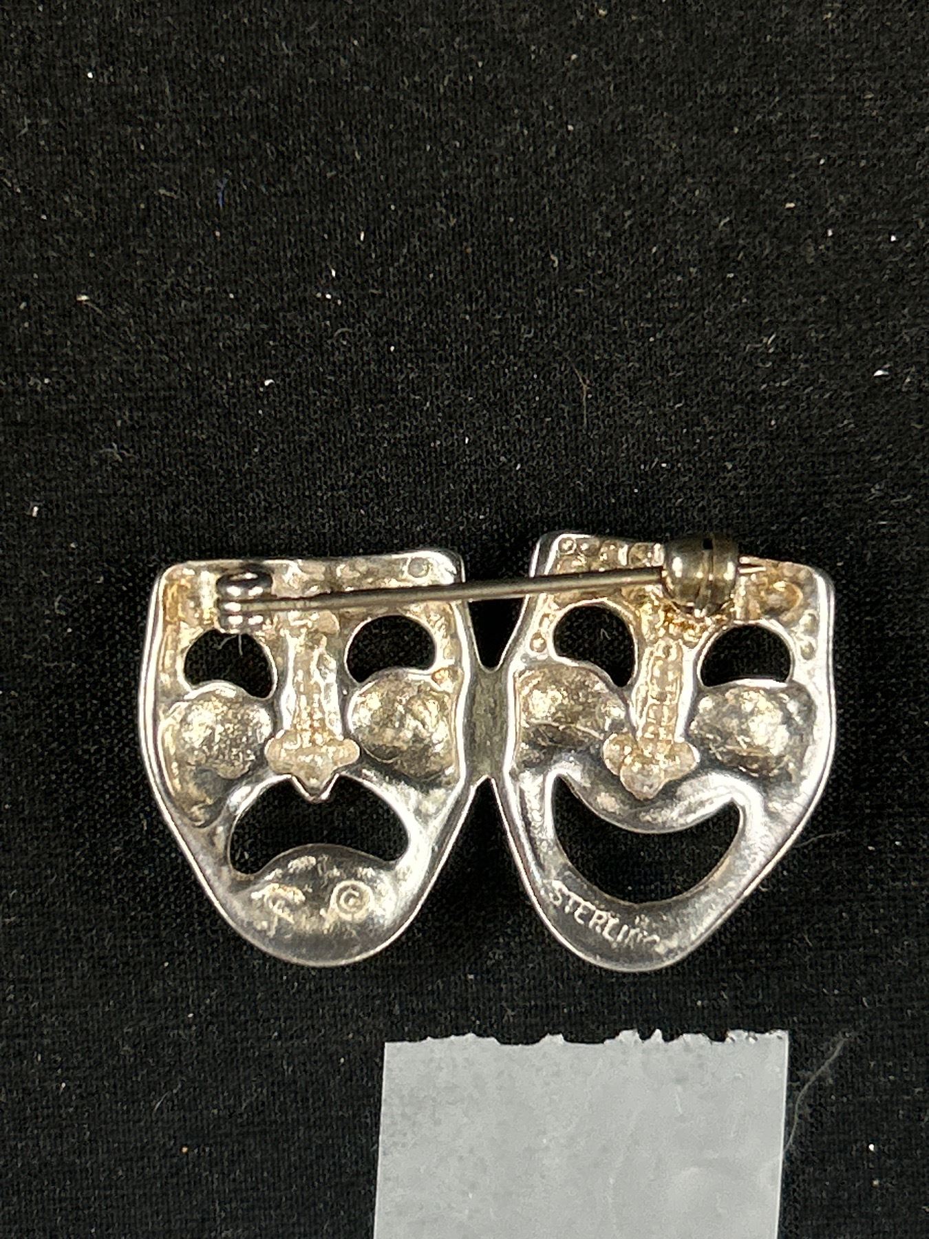 Sterling Silver Happy and Sad Comedy and Tragedy Mask Brooch Marked Sterling