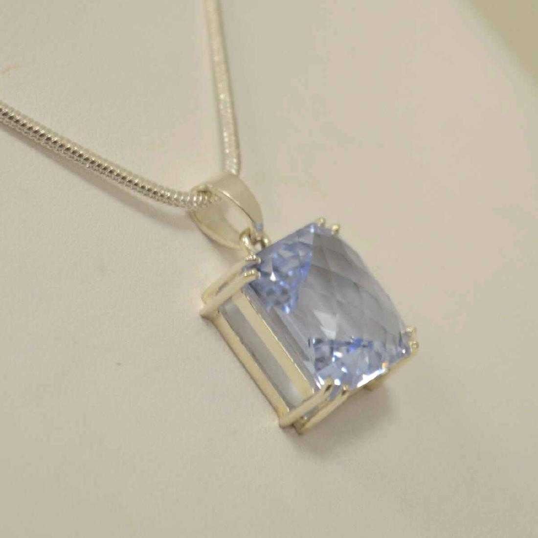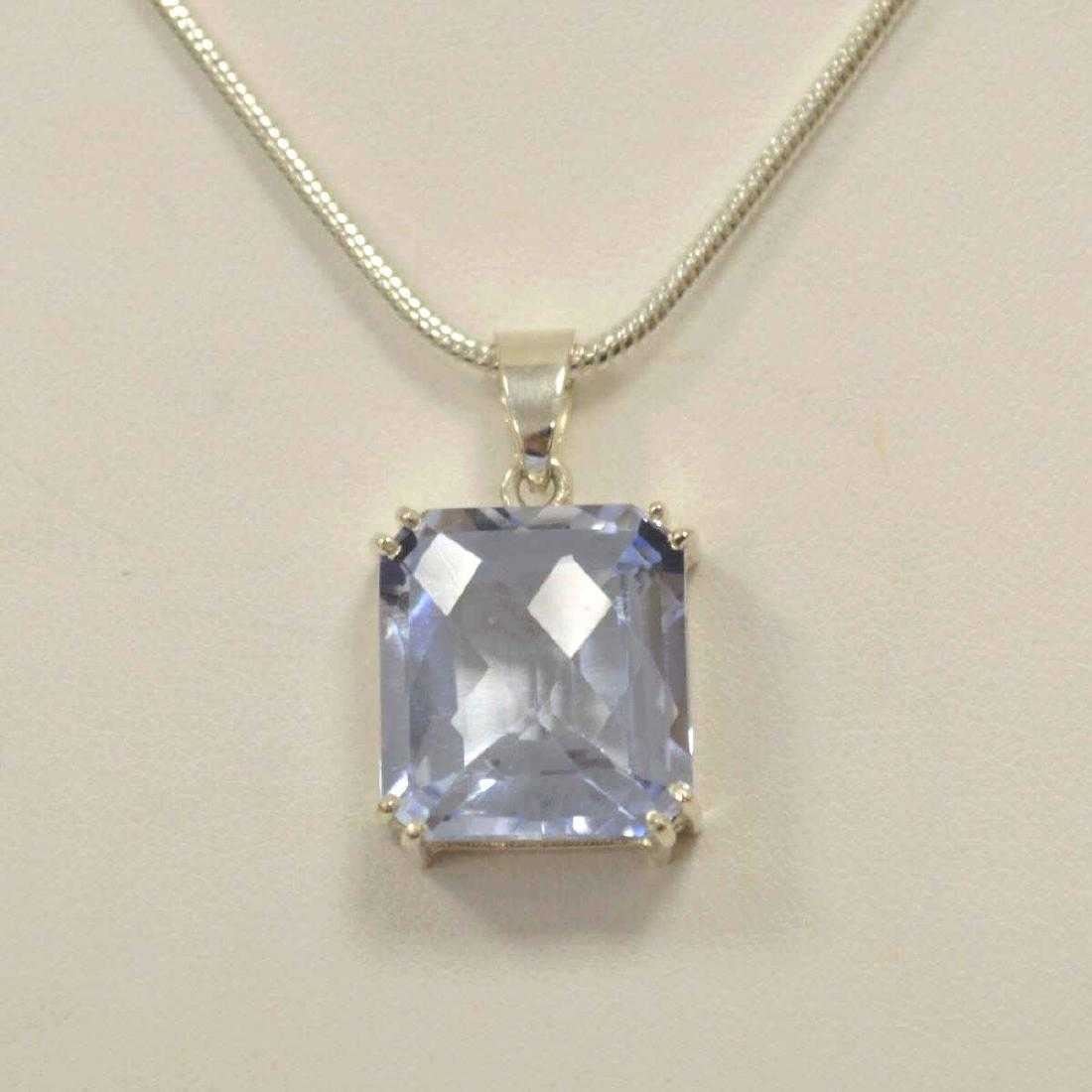 Sterling Silver white topaz with blue hue Necklace.Ladies sterling silver swiss blue topaz necklace featuring a prong set rectangular cut swiss blue topaz weighing approx. 22.95 ct.. Mounted in a basket setting and hanging from a 20" snake chain.104 Cttw or Weight Approx 21 grams