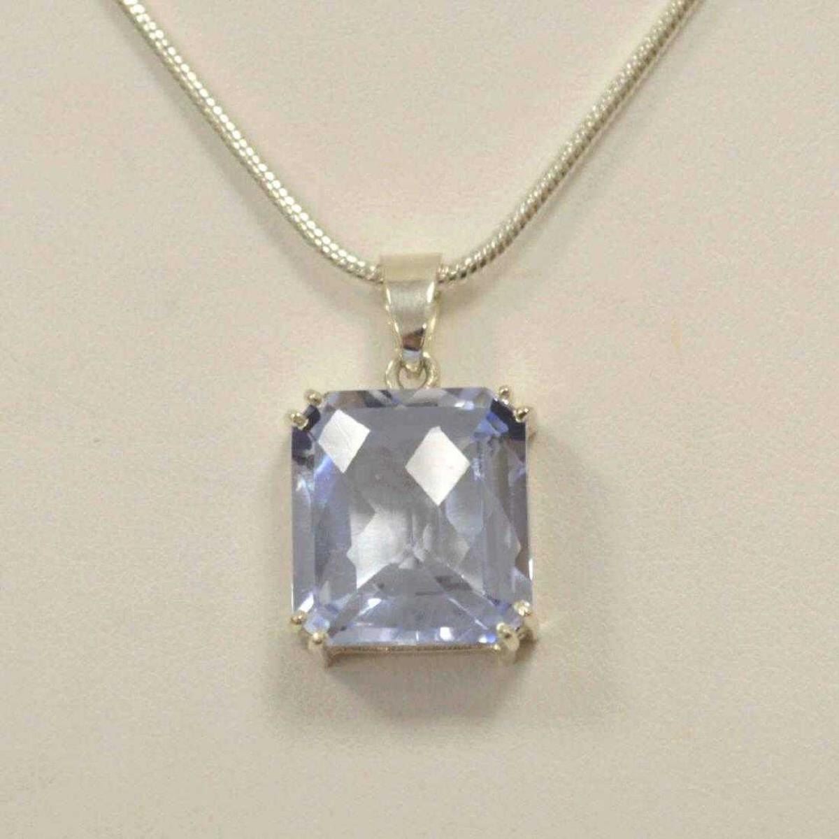 Sterling Silver white topaz with blue hue Necklace.Ladies sterling silver swiss blue topaz necklace featuring a prong set rectangular cut swiss blue topaz weighing approx. 22.95 ct.. Mounted in a basket setting and hanging from a 20" snake chain.104 Cttw or Weight Approx 21 grams