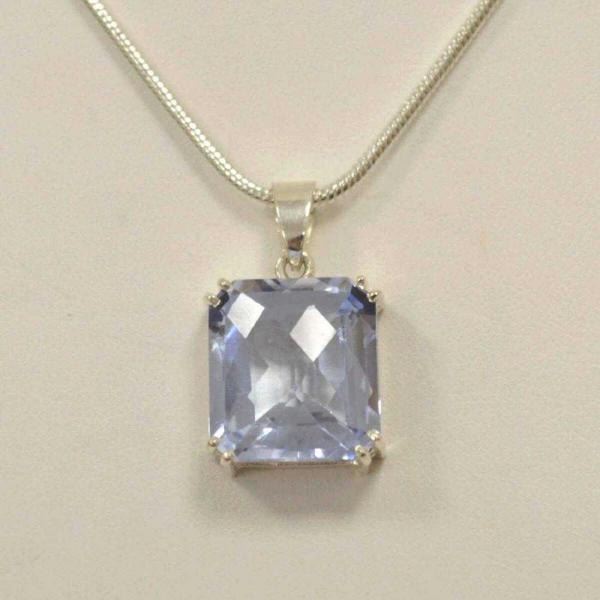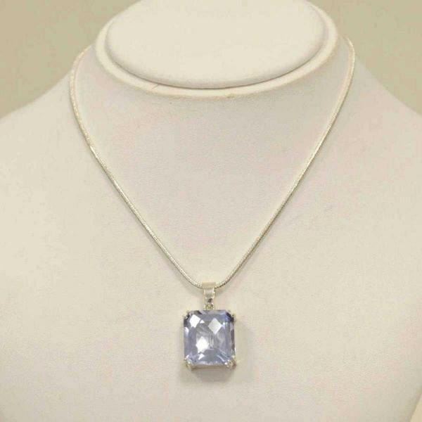 Sterling Silver white topaz with blue hue Necklace.Ladies sterling silver swiss blue topaz necklace featuring a prong set rectangular cut swiss blue topaz weighing approx. 22.95 ct.. Mounted in a basket setting and hanging from a 20" snake chain.104 Cttw or Weight Approx 21 grams