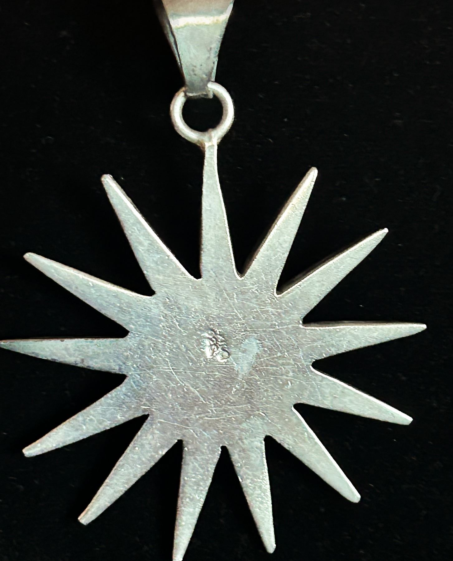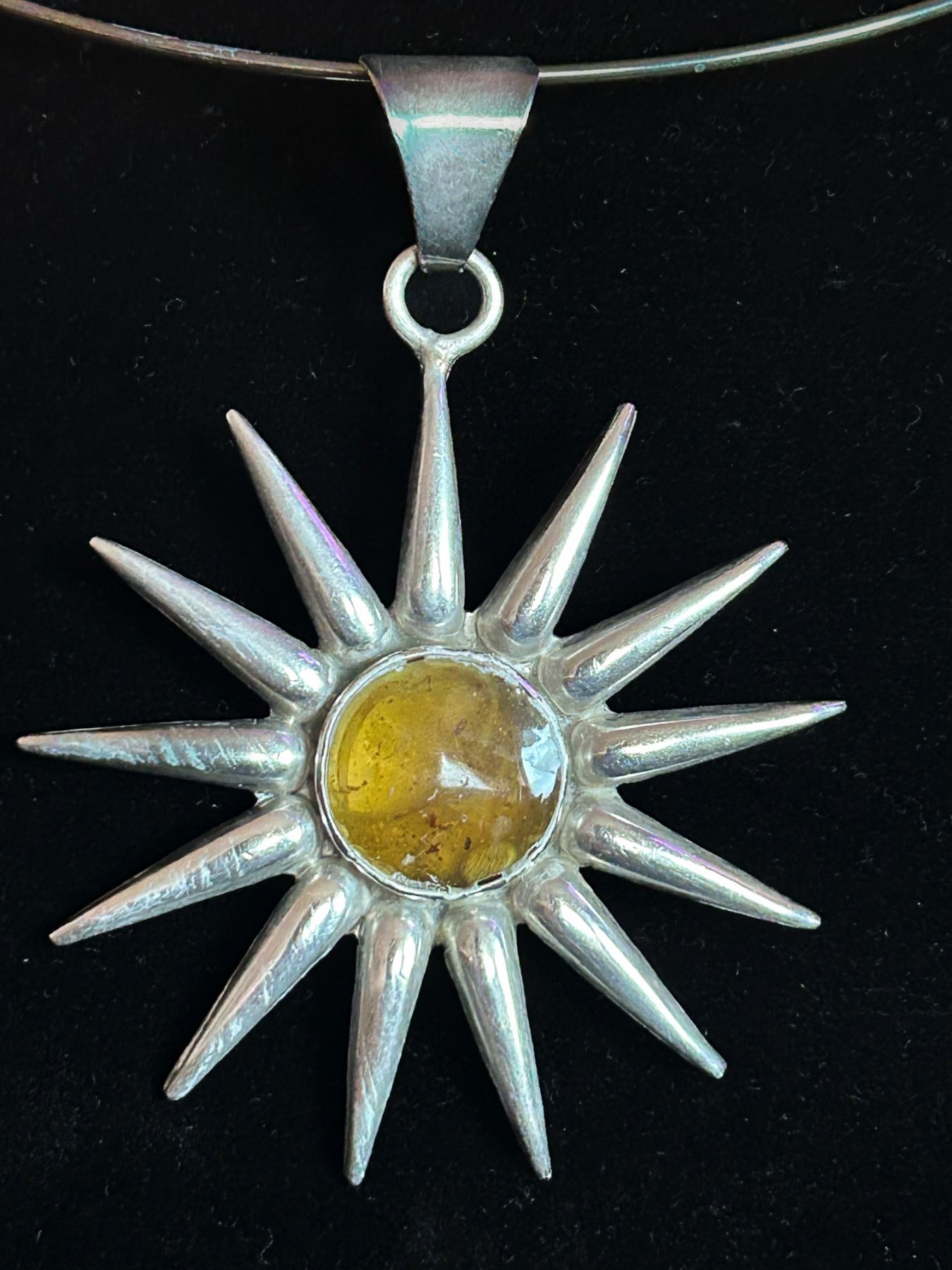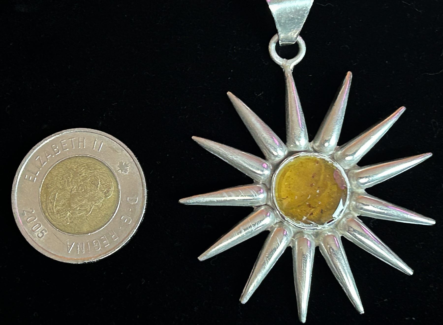 Striking sunburst pendant marked “Mexico 925,” featuring a warm amber cabochon at its center. Crafted in solid sterling silver with bold, radiating spikes. Pendant only—wire choker and toonie shown for scale, not included.
